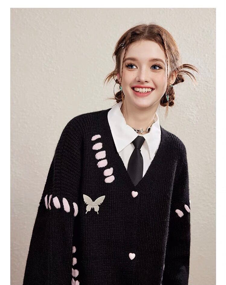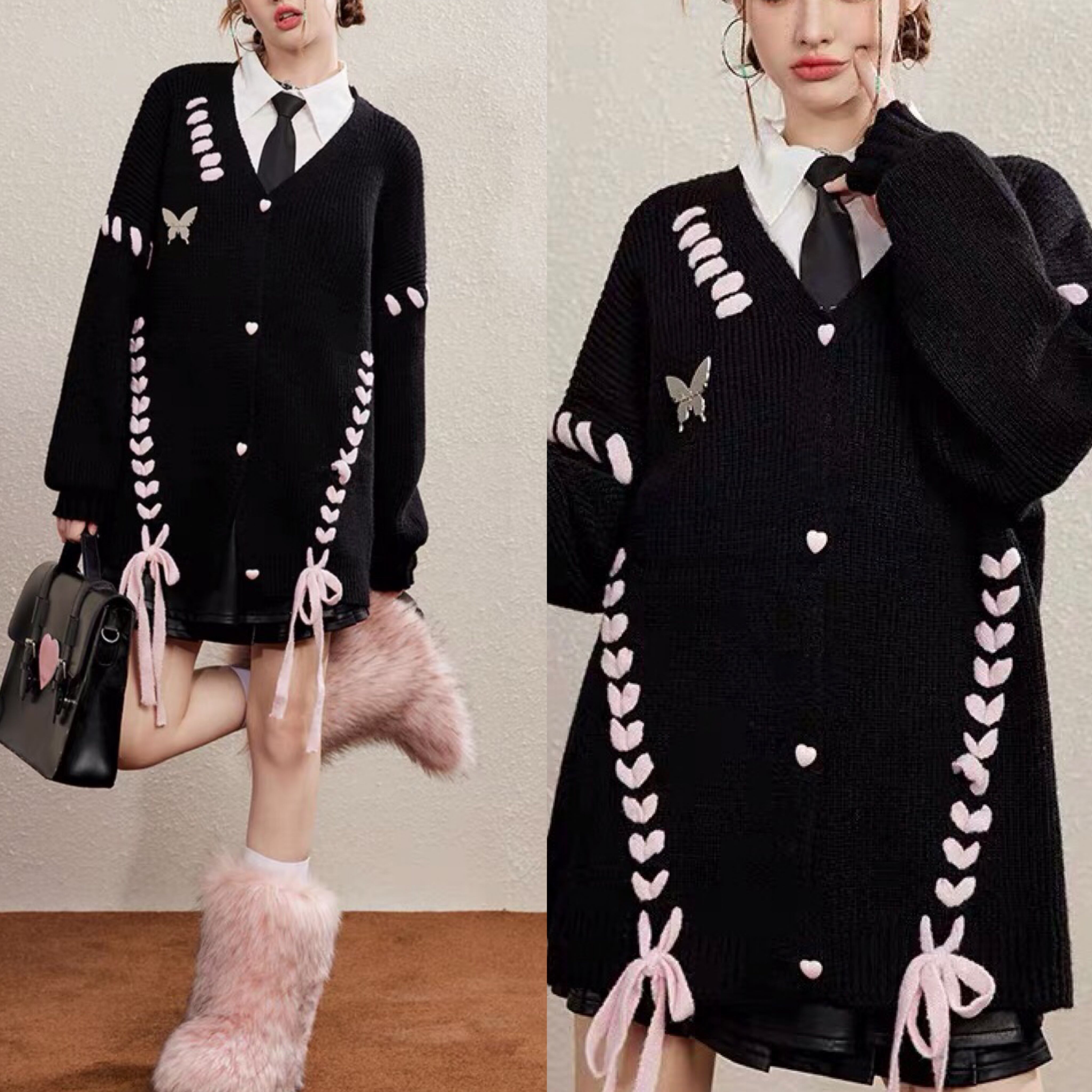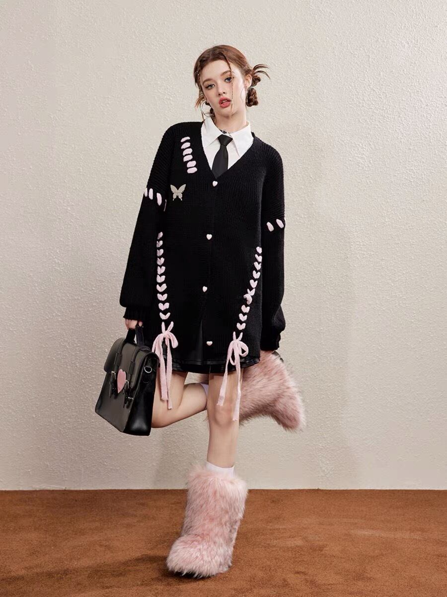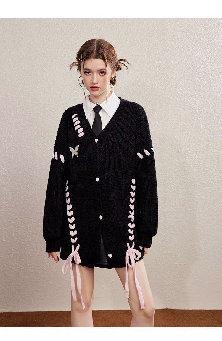カーディガン リボン ガーリー ゆったり アウター 黒