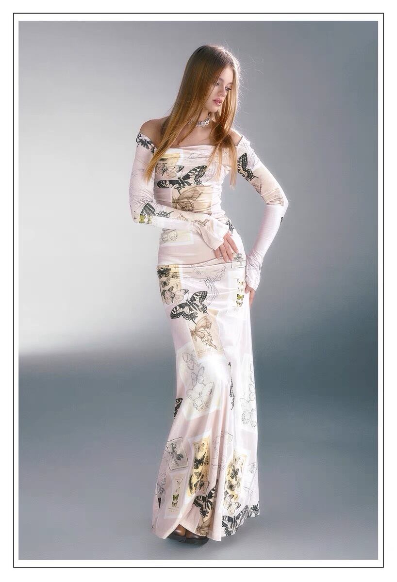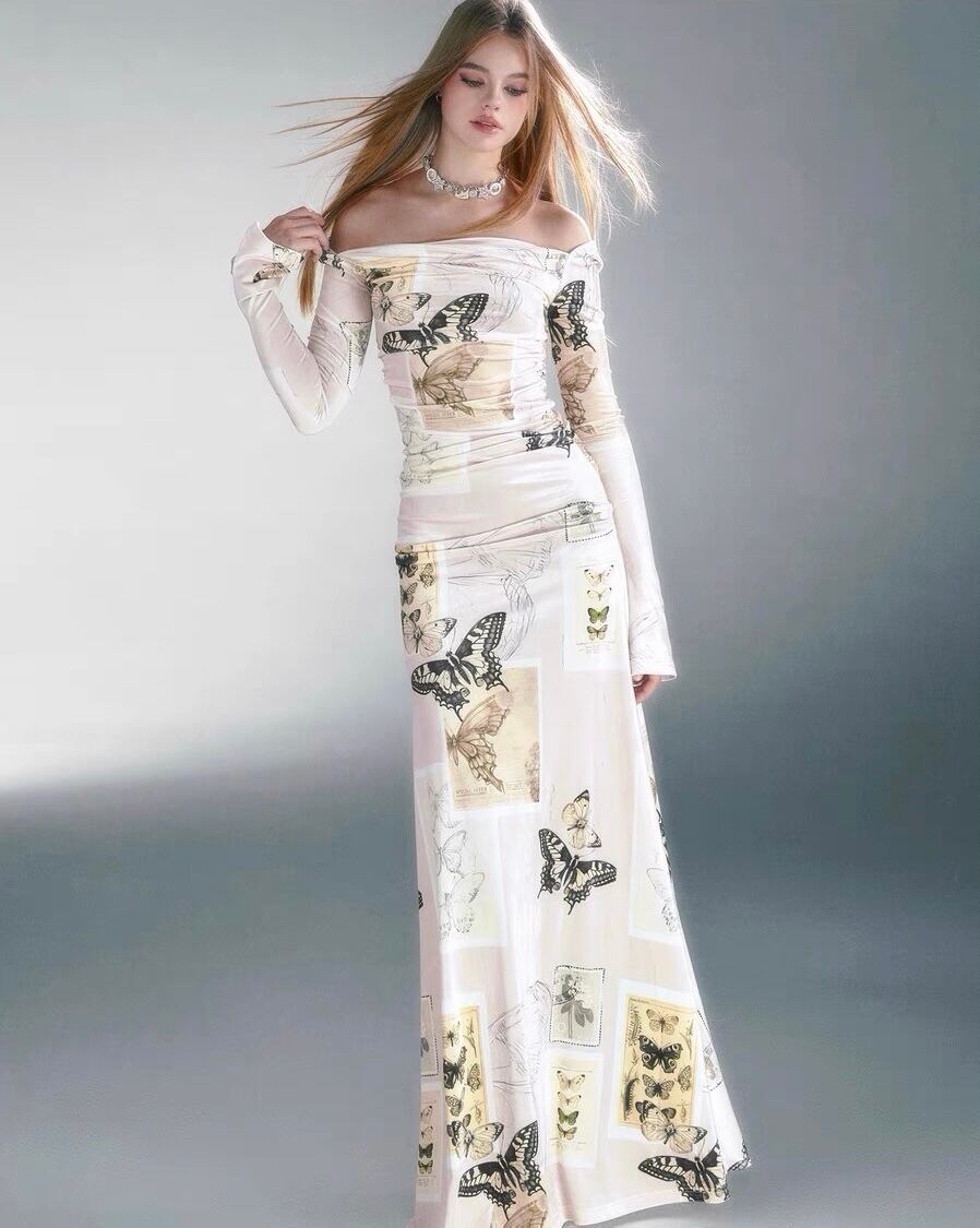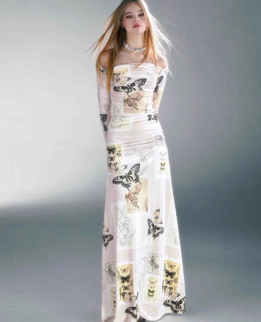 バタフライ マキシ ワンピース オフショルダー 白 バタフライ