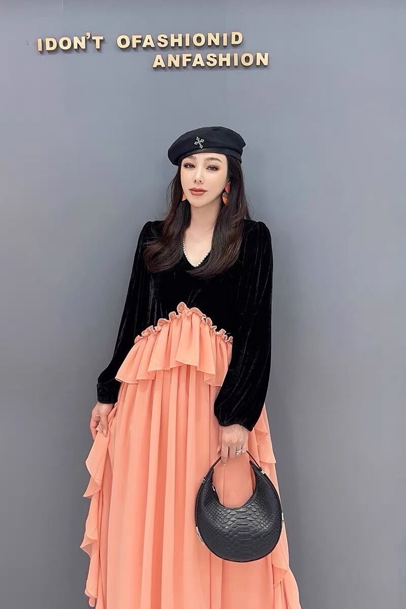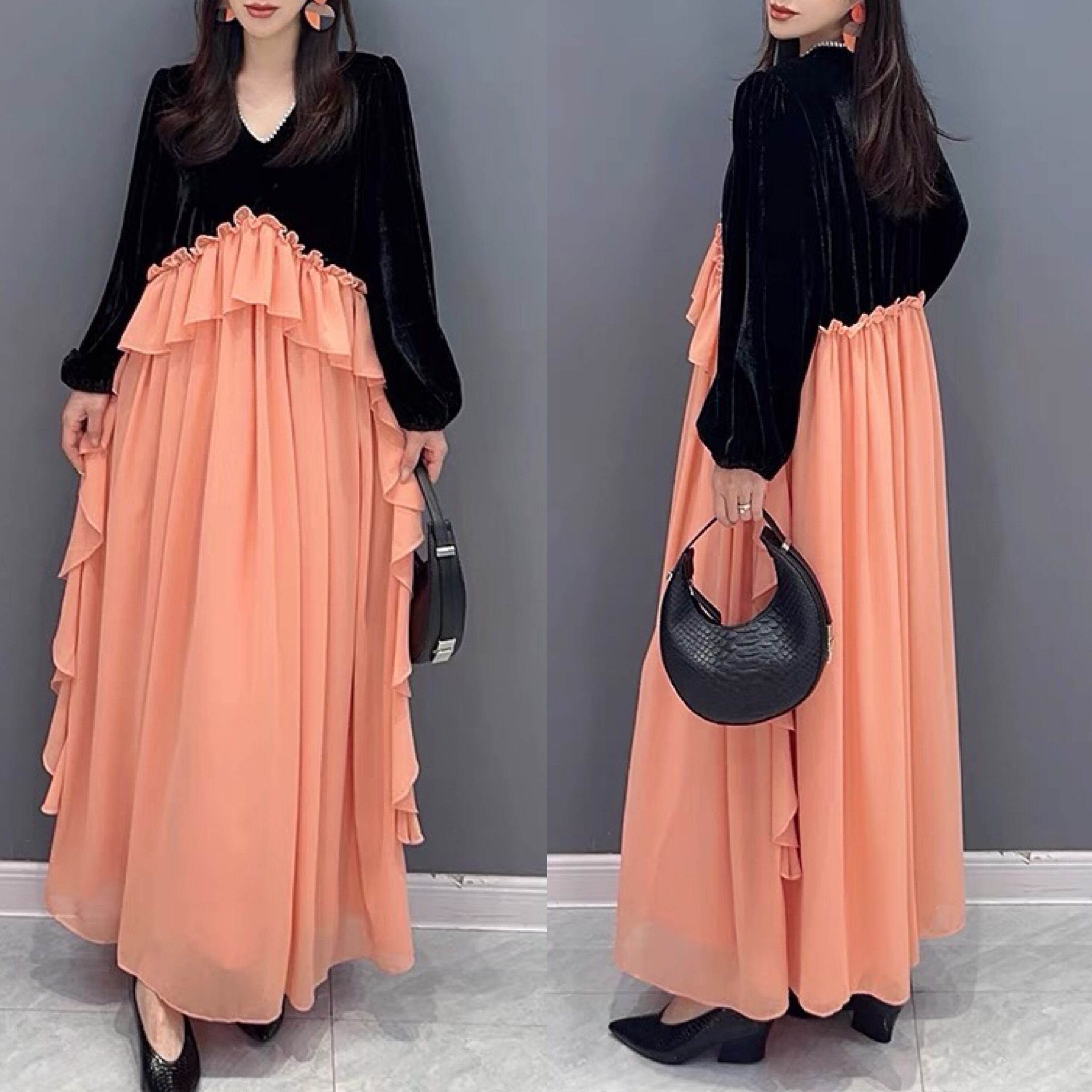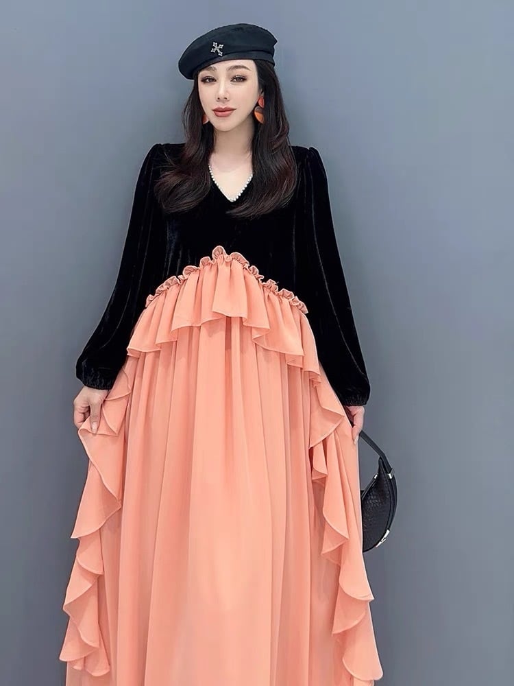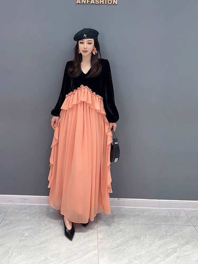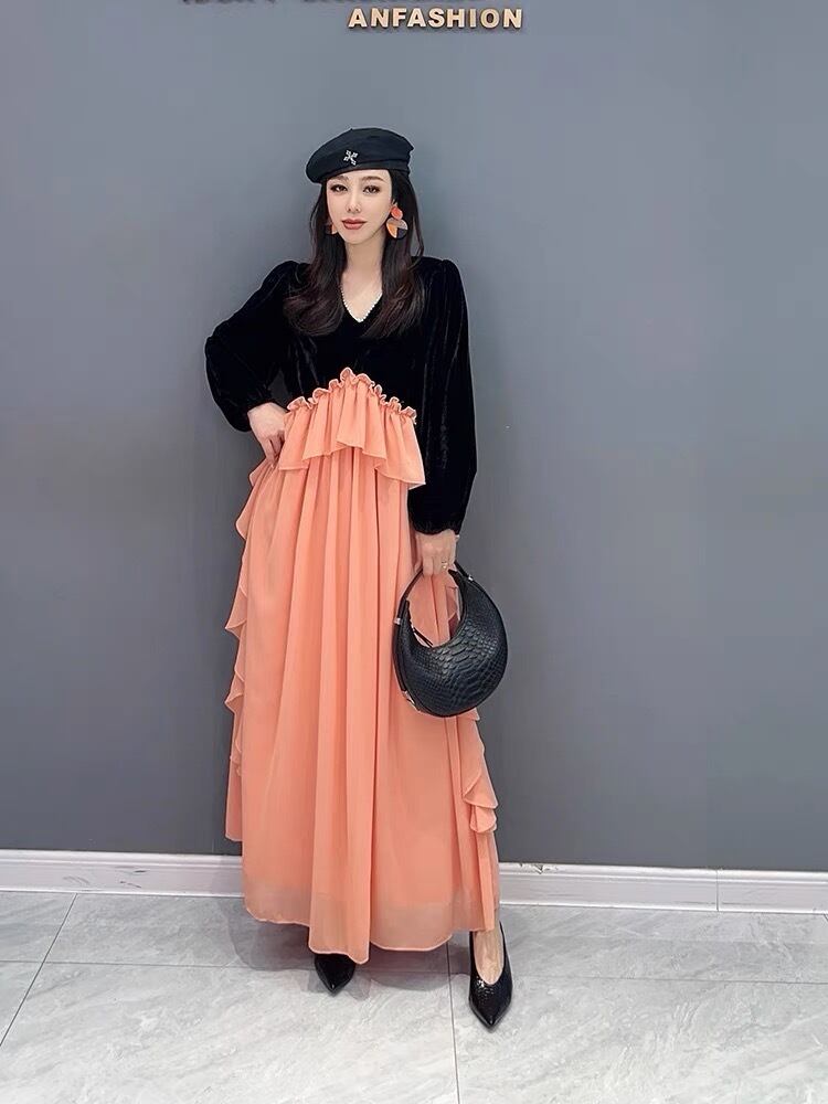 オレンジ ワンピース ベルベット ゆったり XL エレガント