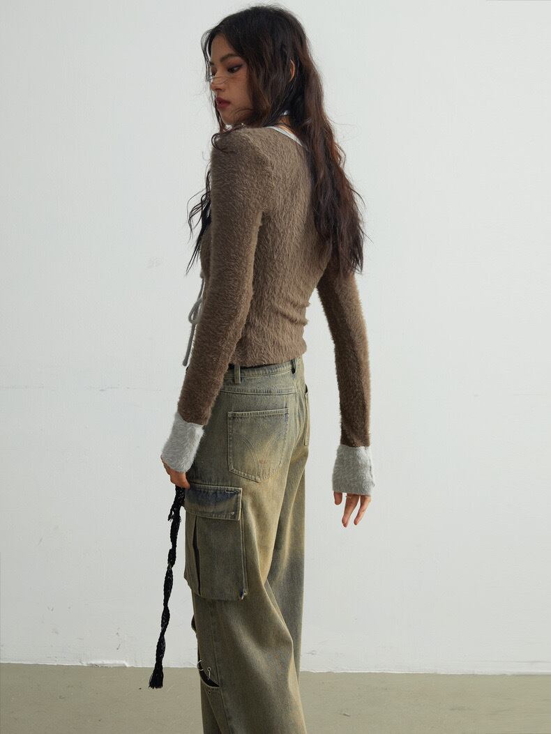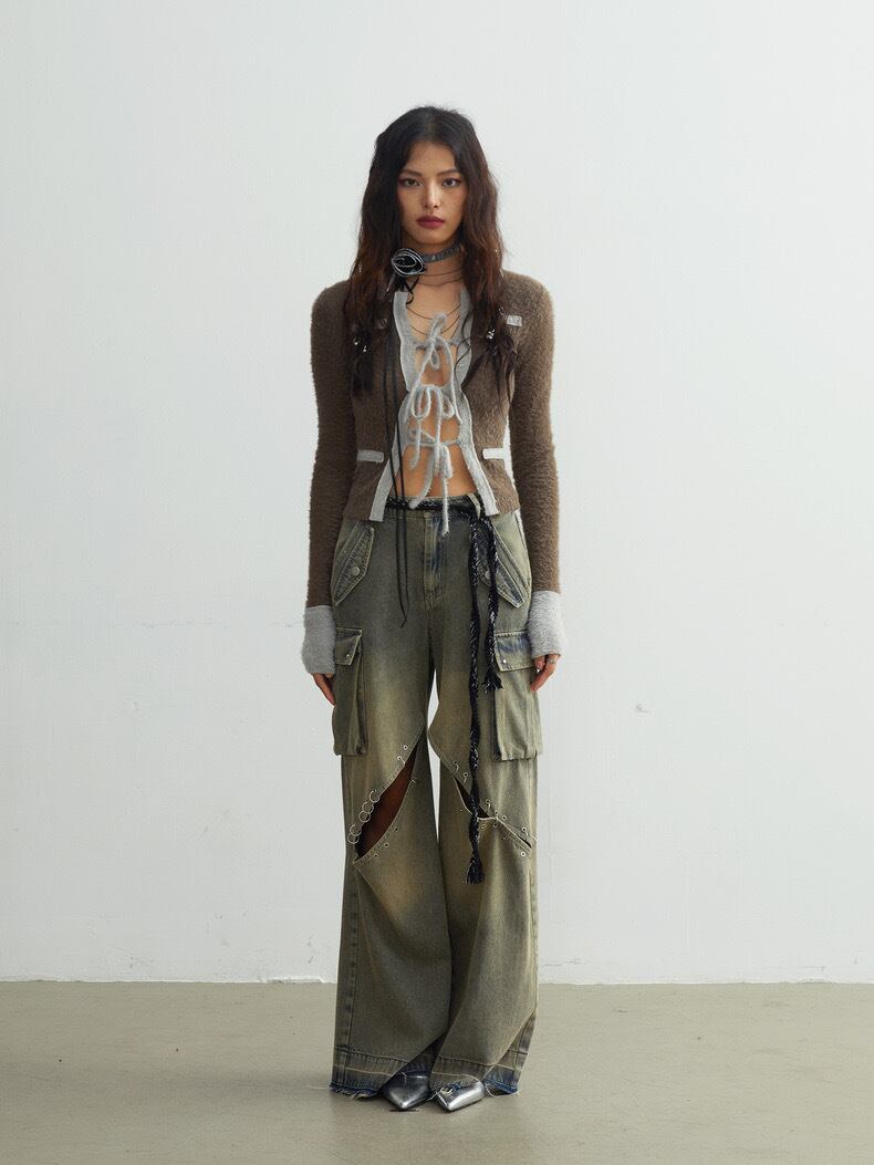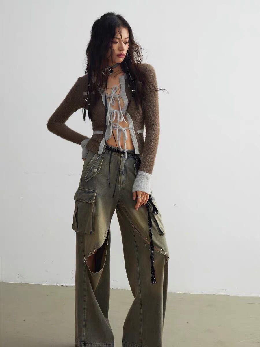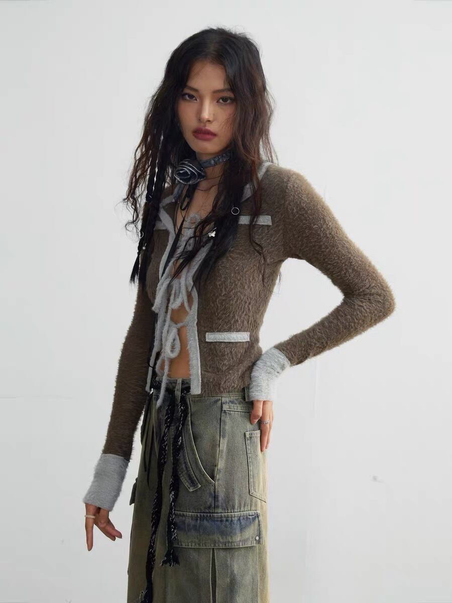 カーディガン かっこいい アウター リボン 茶色 カーキ 緑