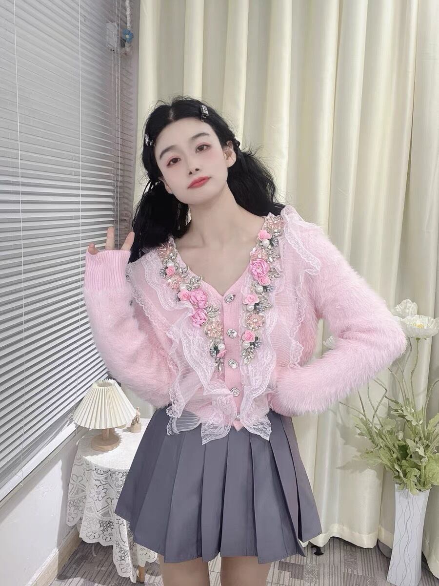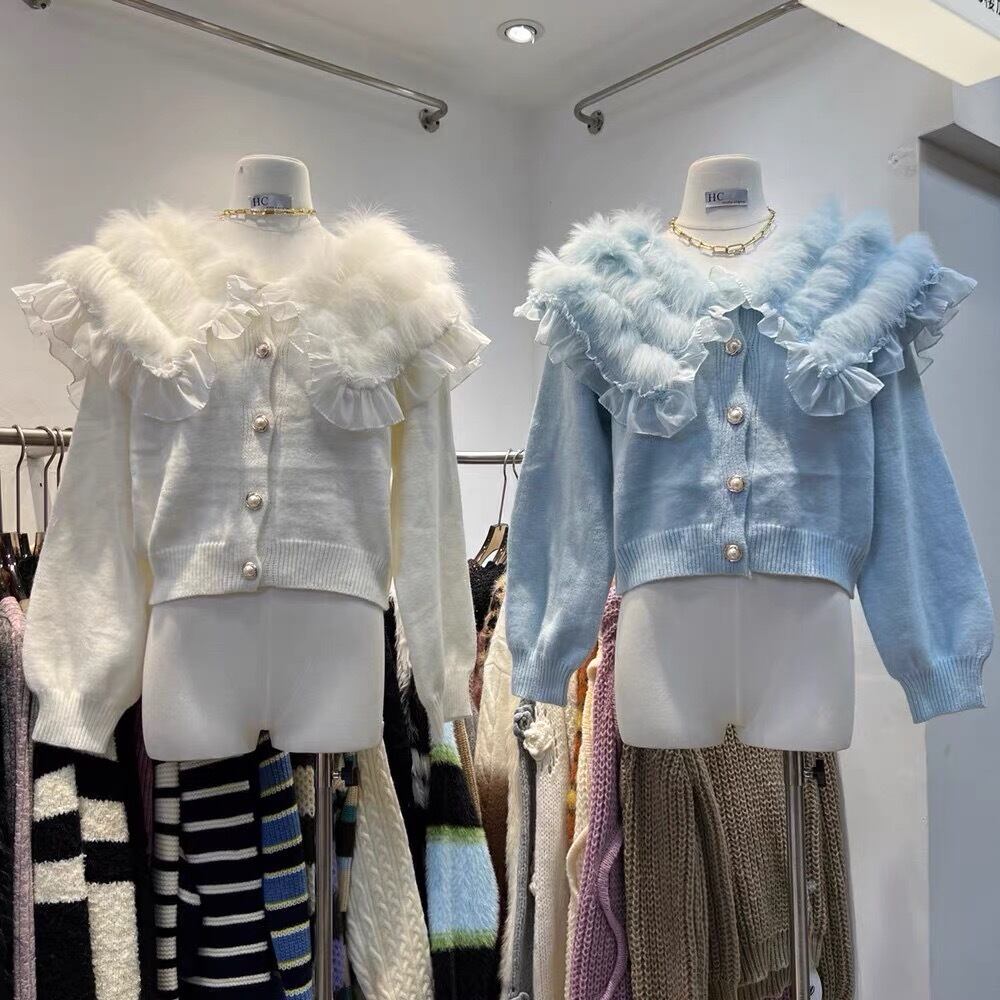 カーディガン ニット 可愛い ファー ピンク 水色 白