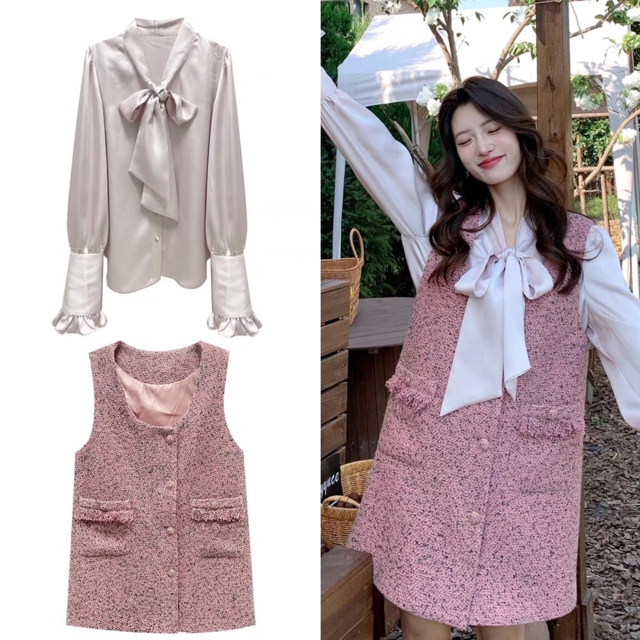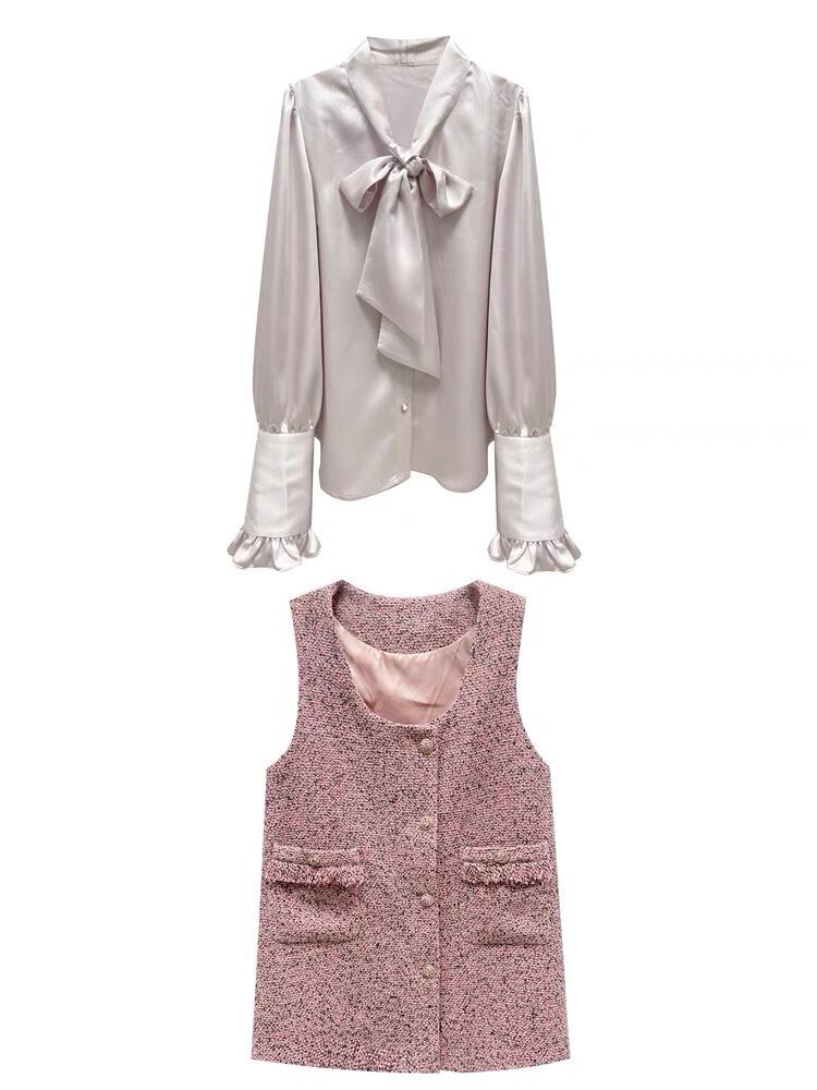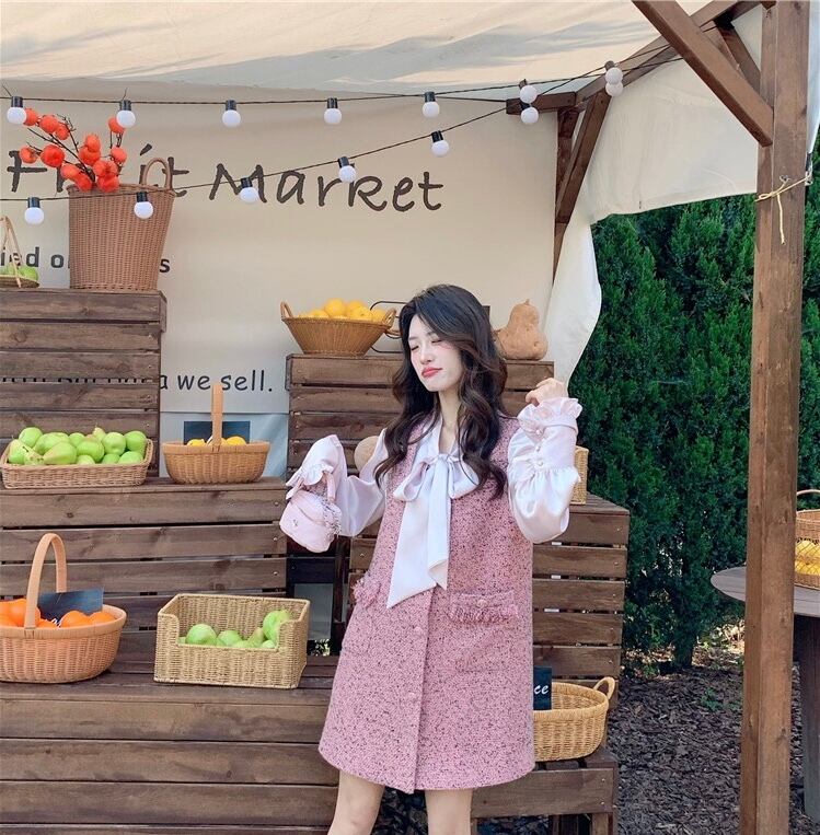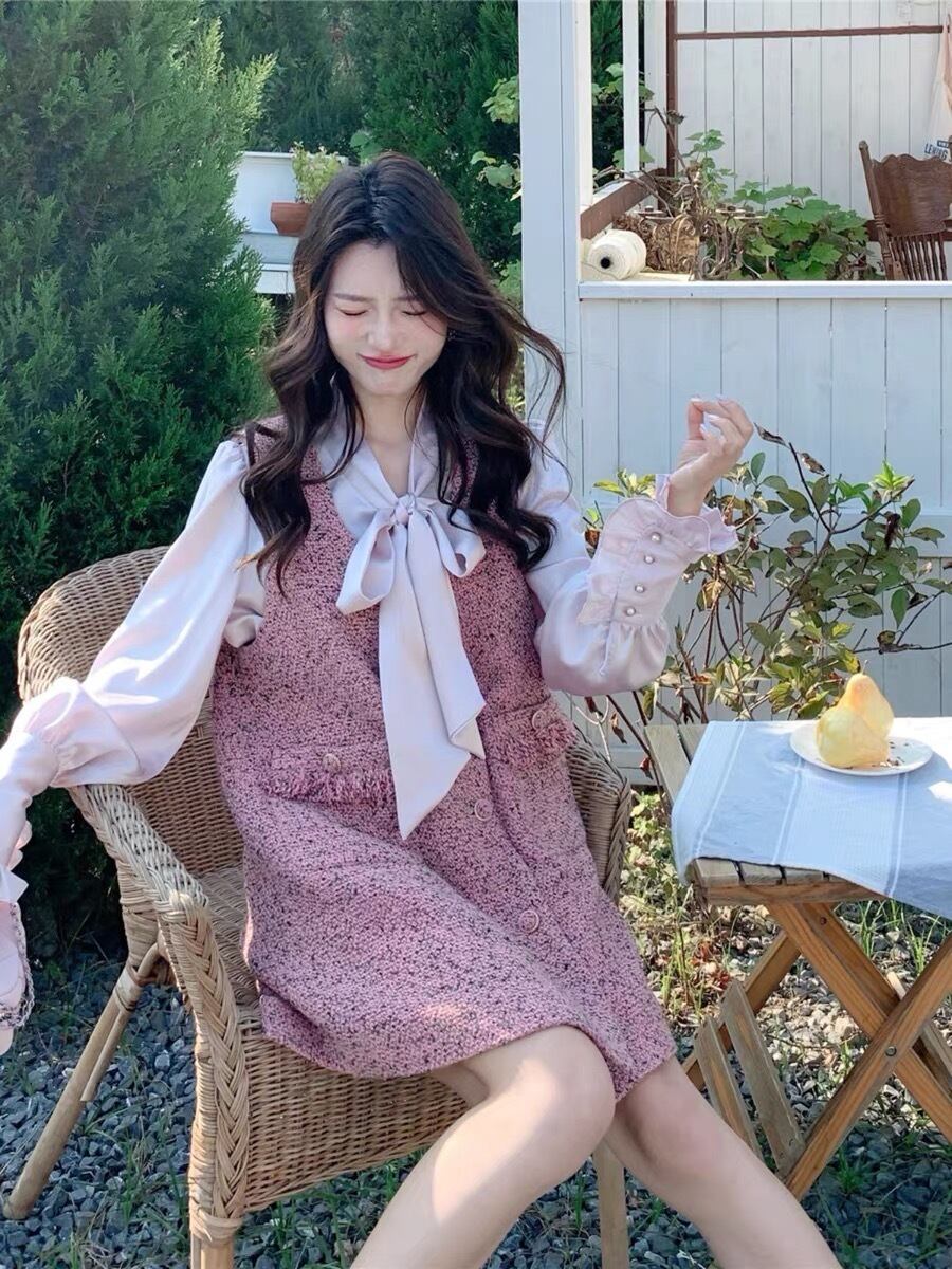 【2ピース】ブラウス ピンク リボン ワンピース ガーリー