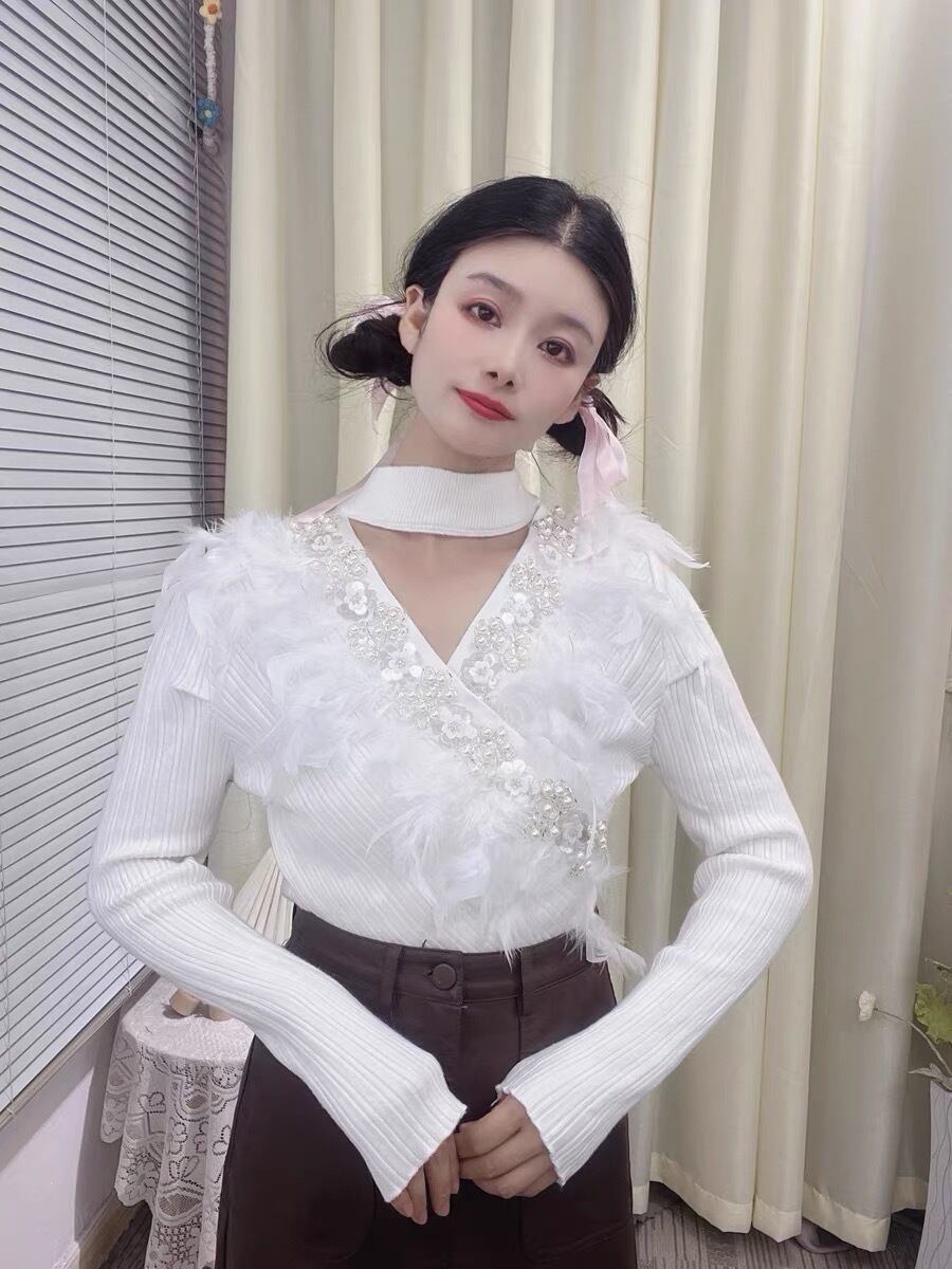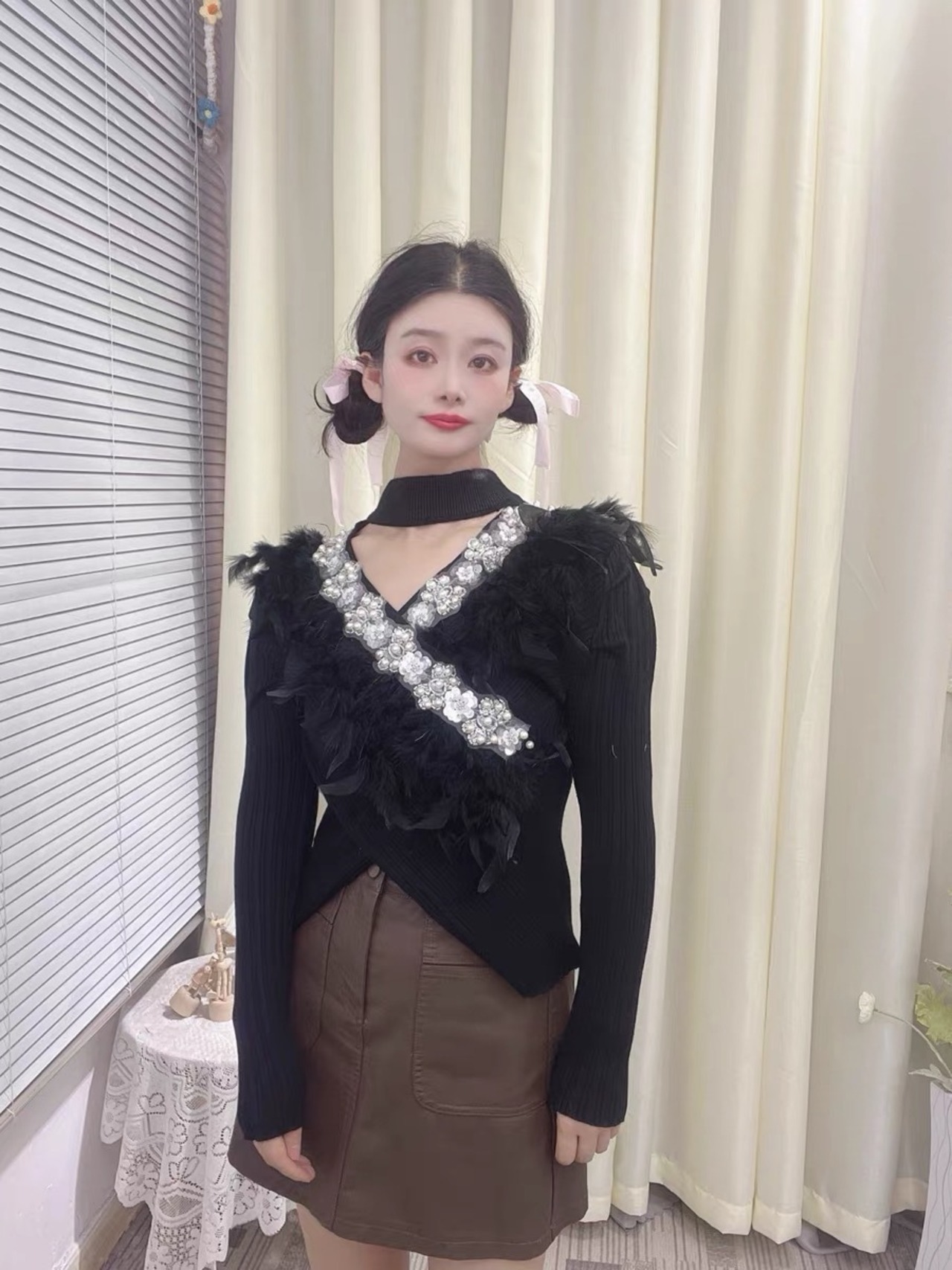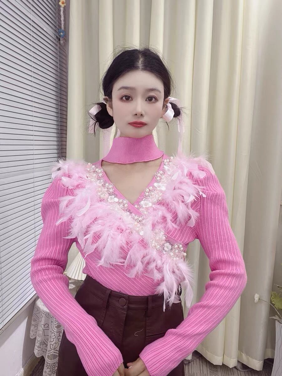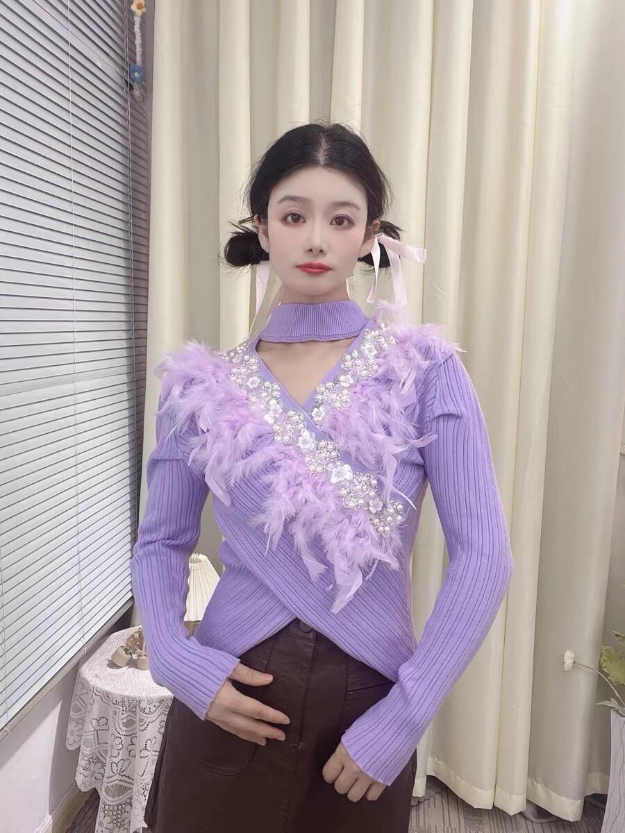 セーター ニット ファー 羽 ピンク 紫 黒 ハイネック 白