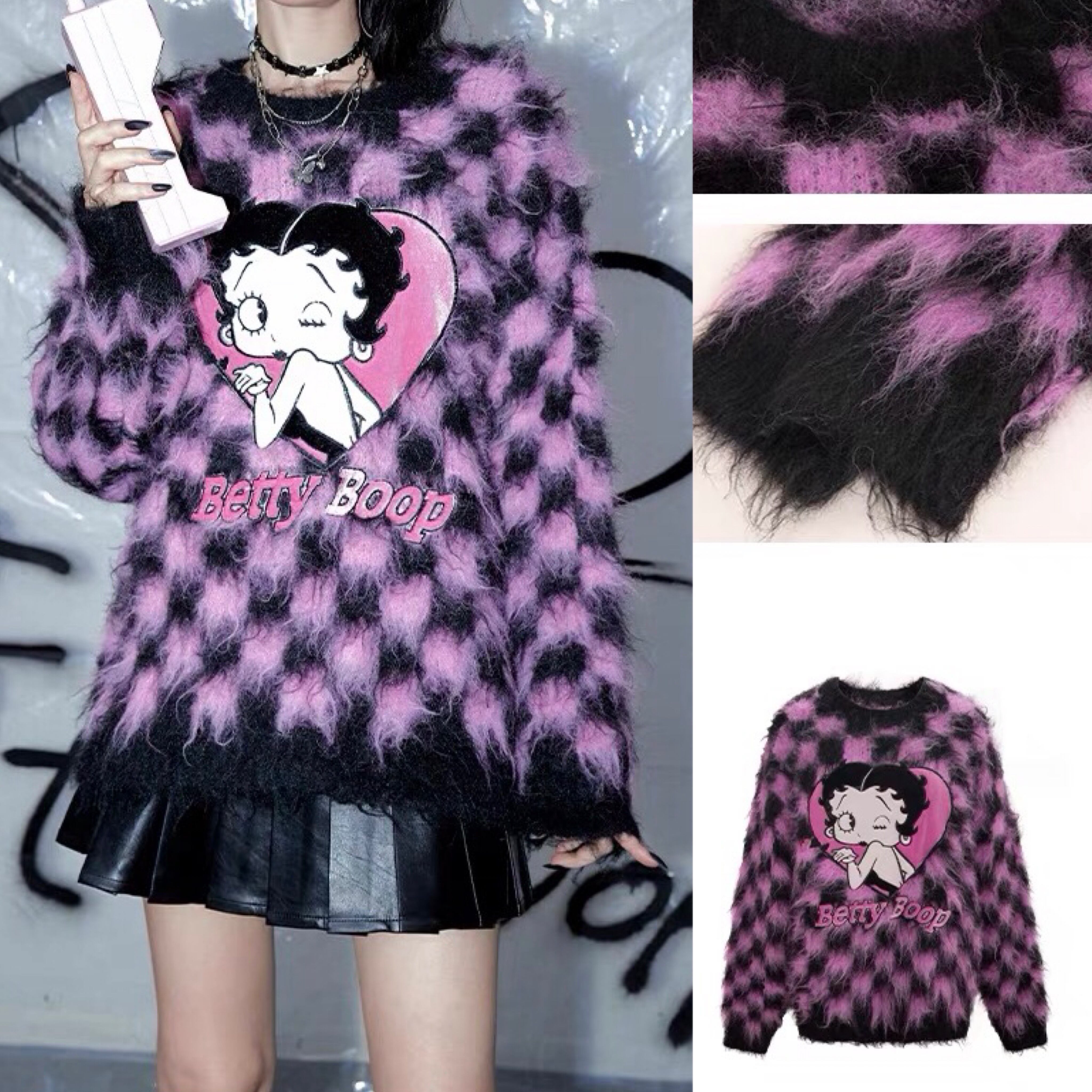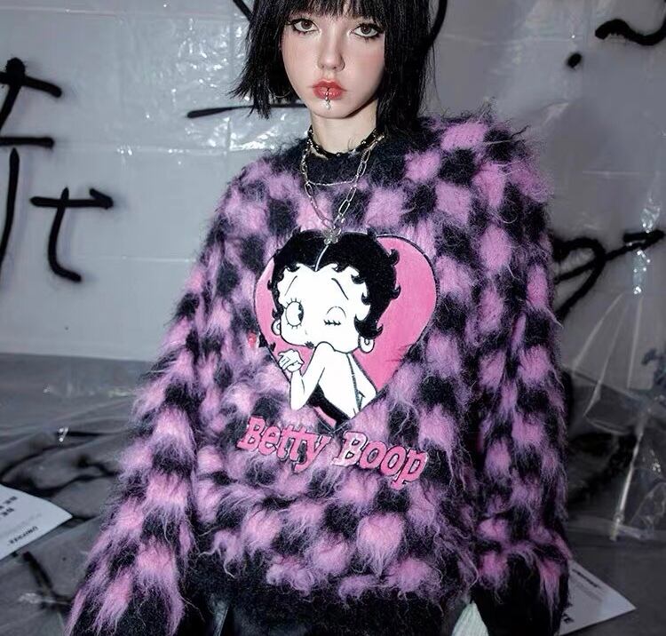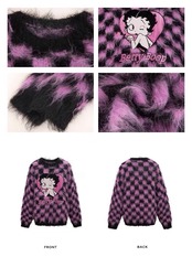 セーター ピンク 黒 チェック ニット カーディガン