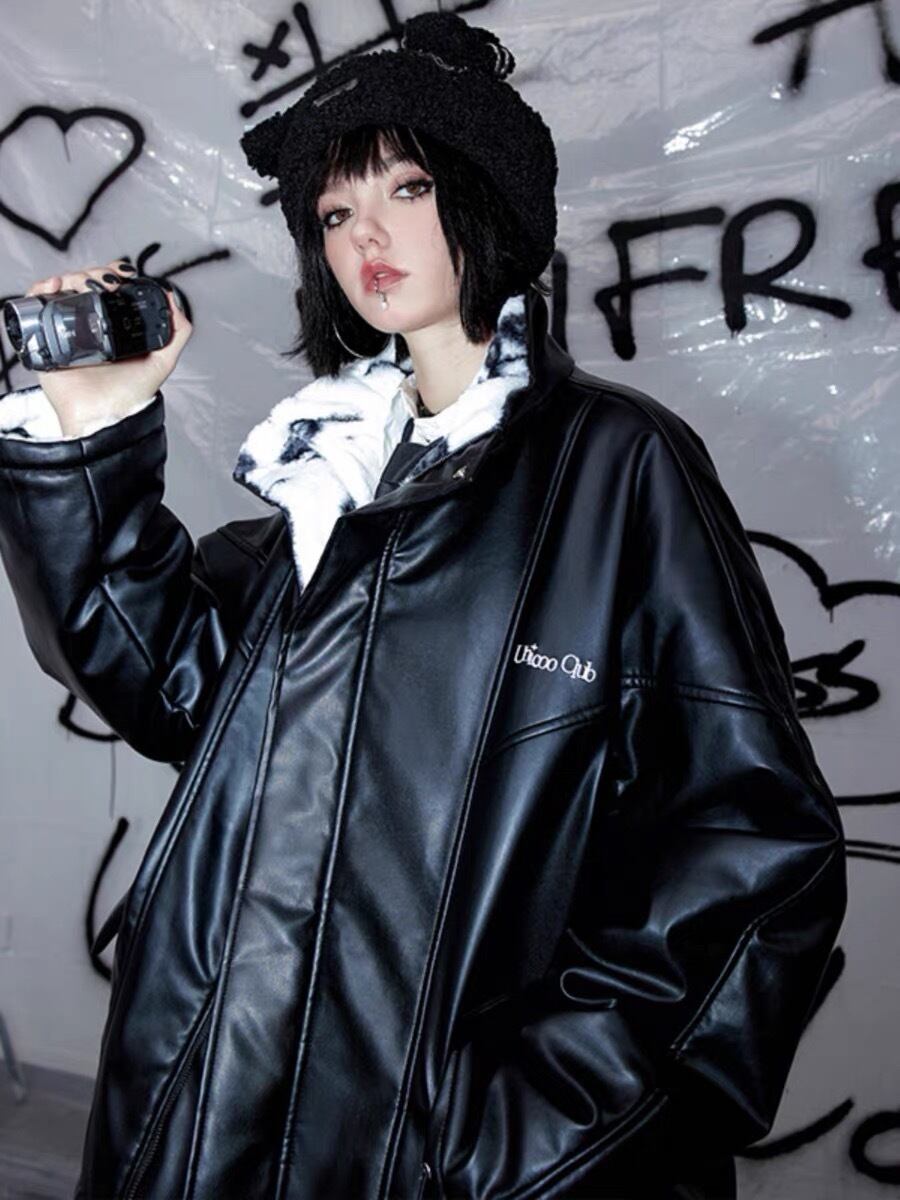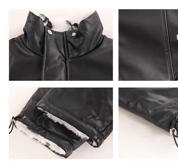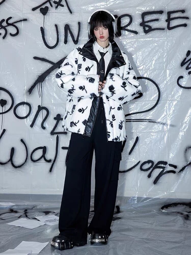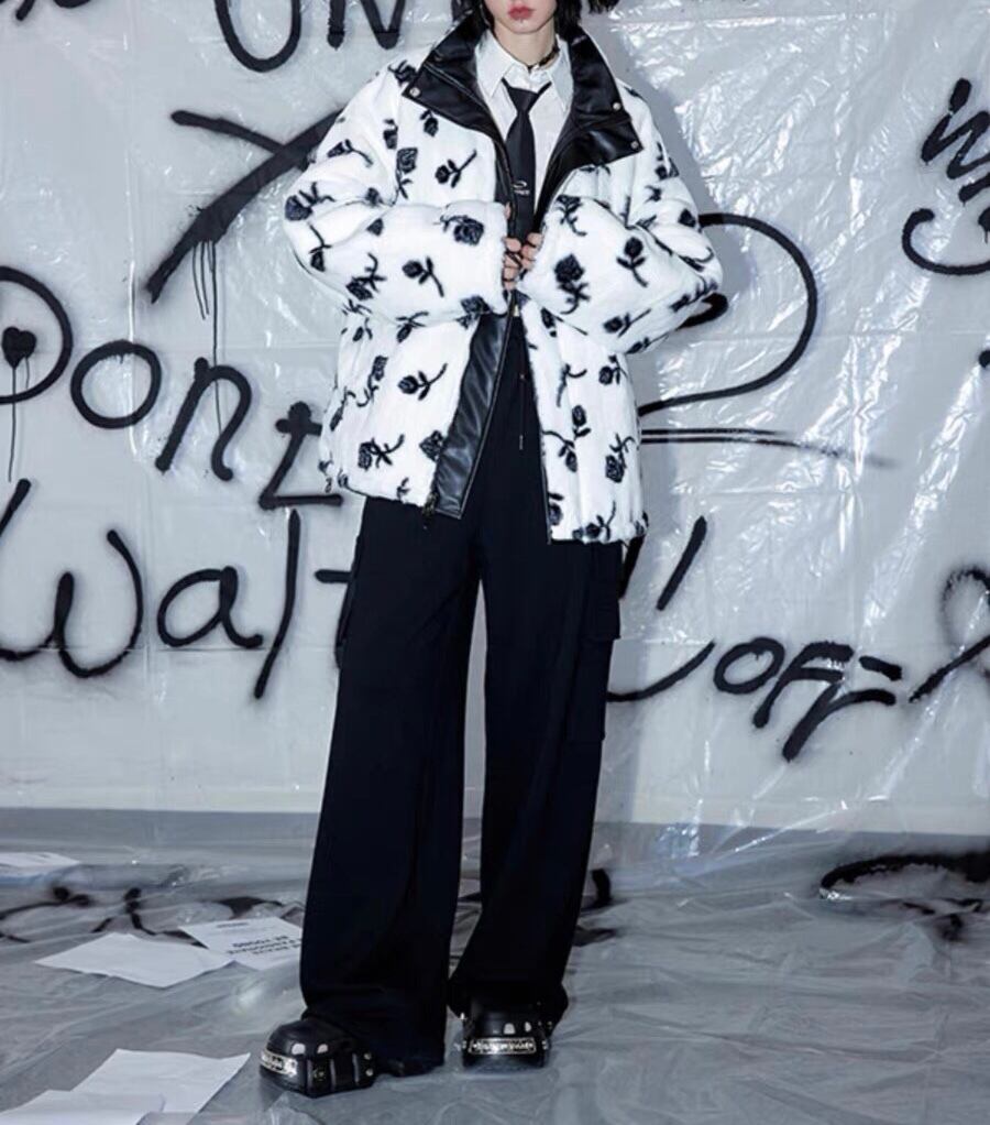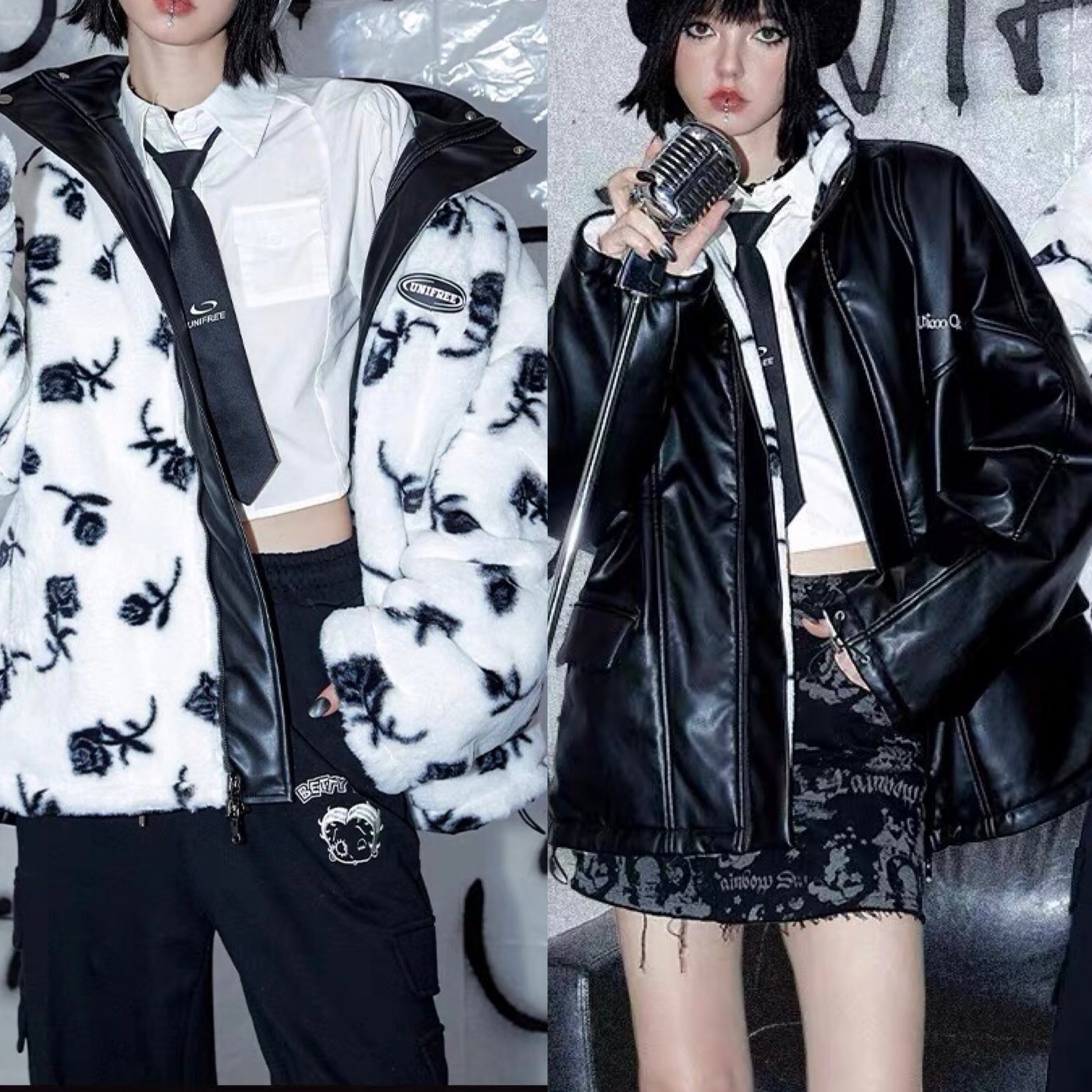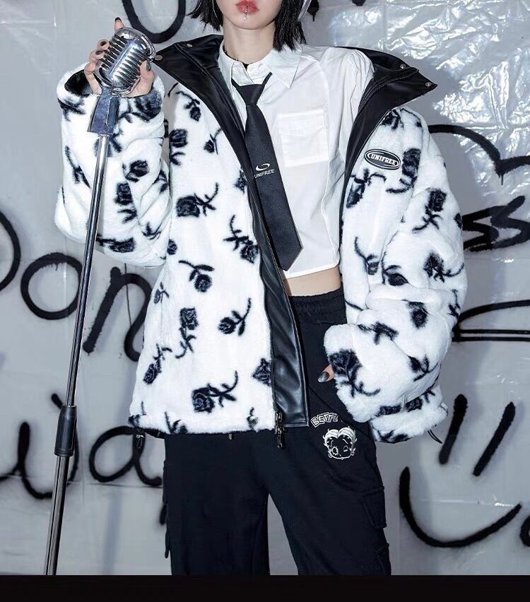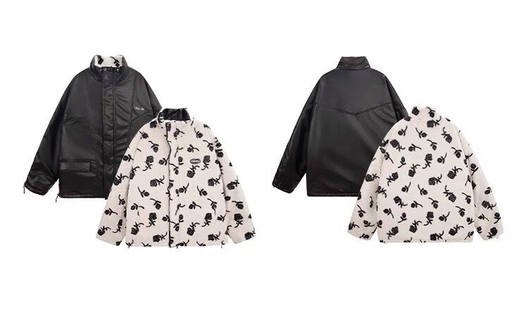【リバーシブル】革 レザー 黒 フリース コート 白 花柄 レオパード