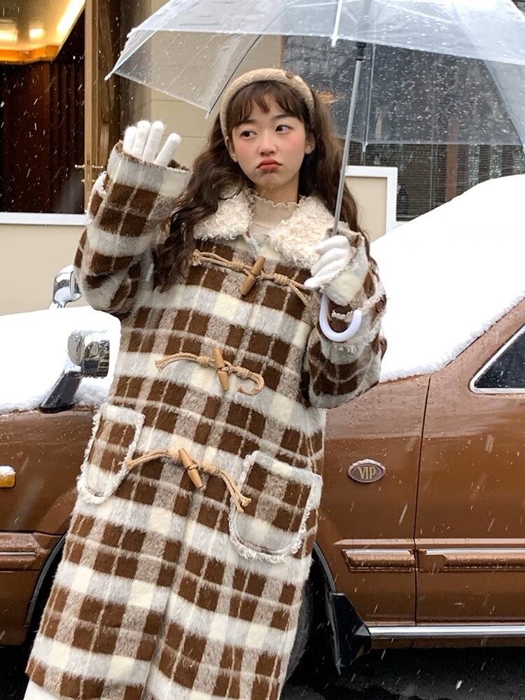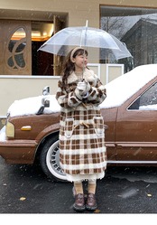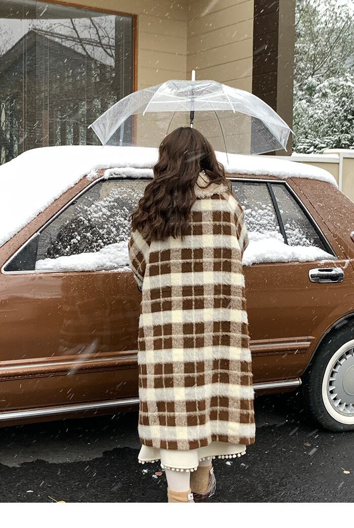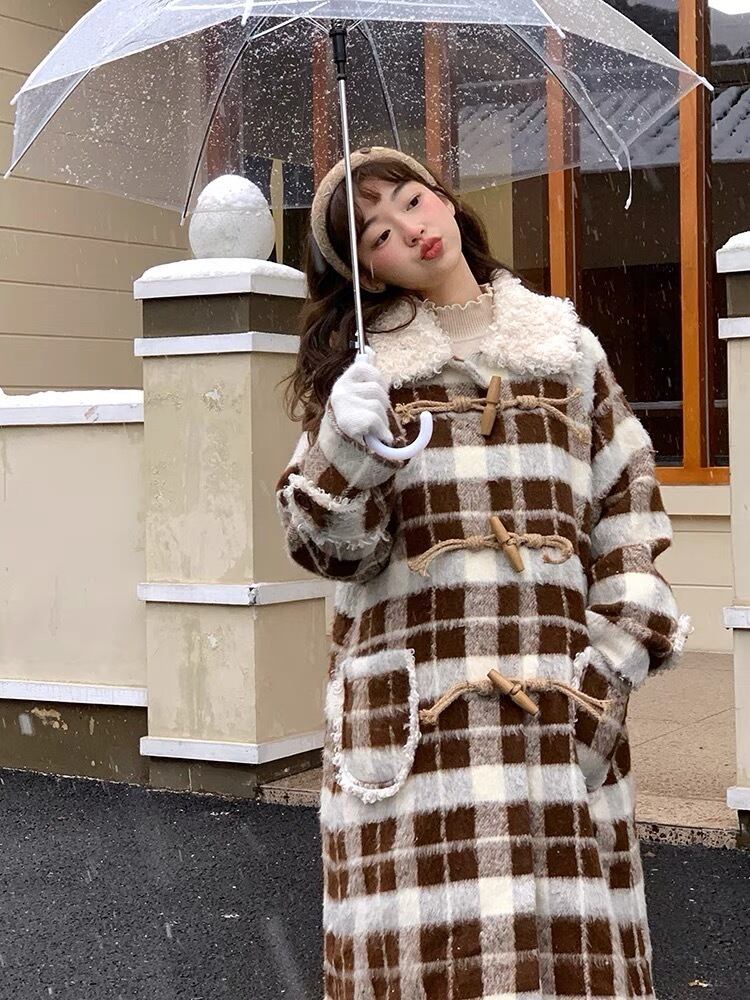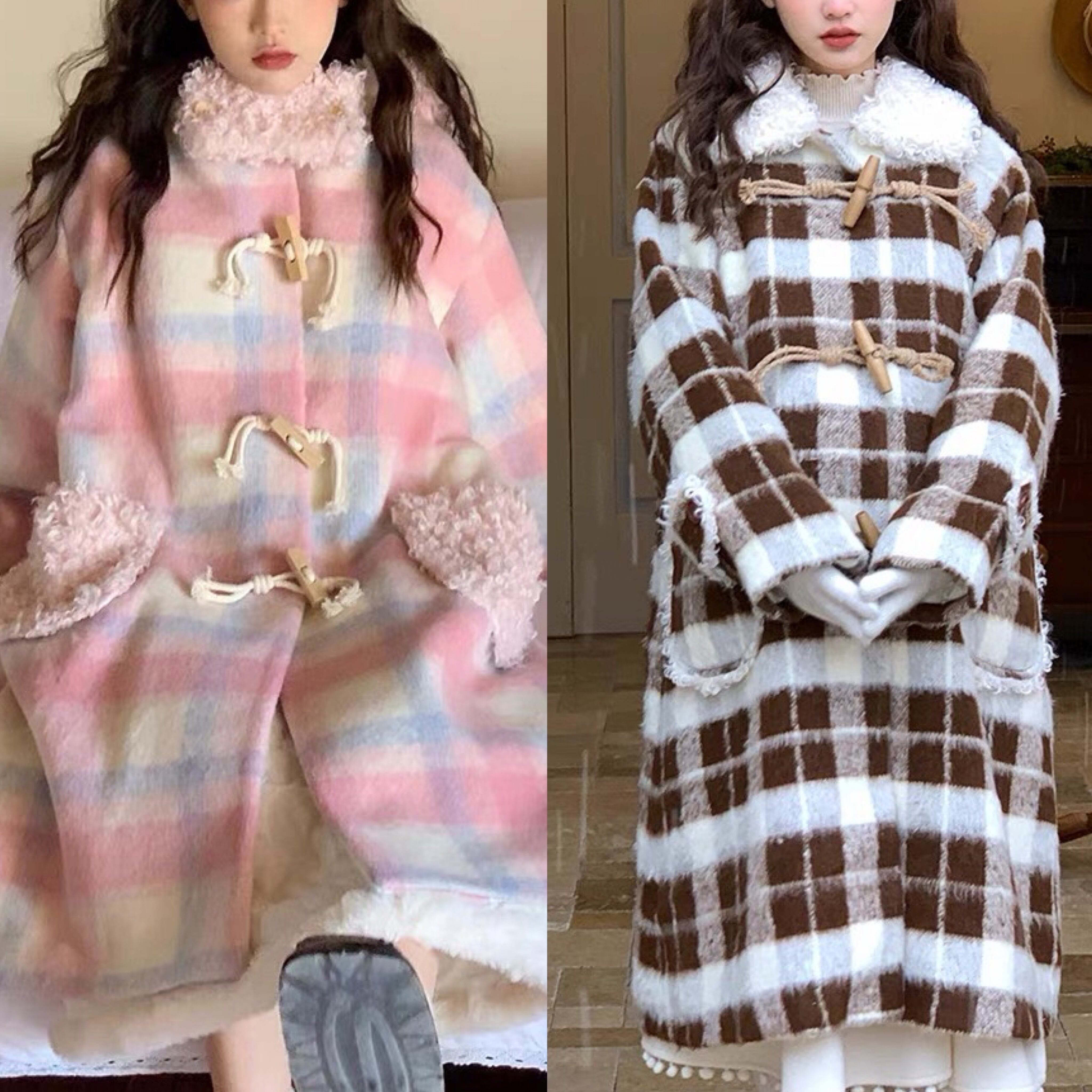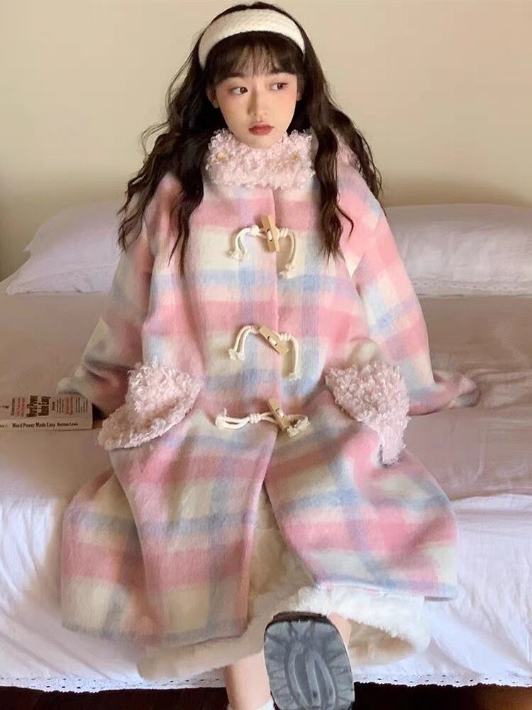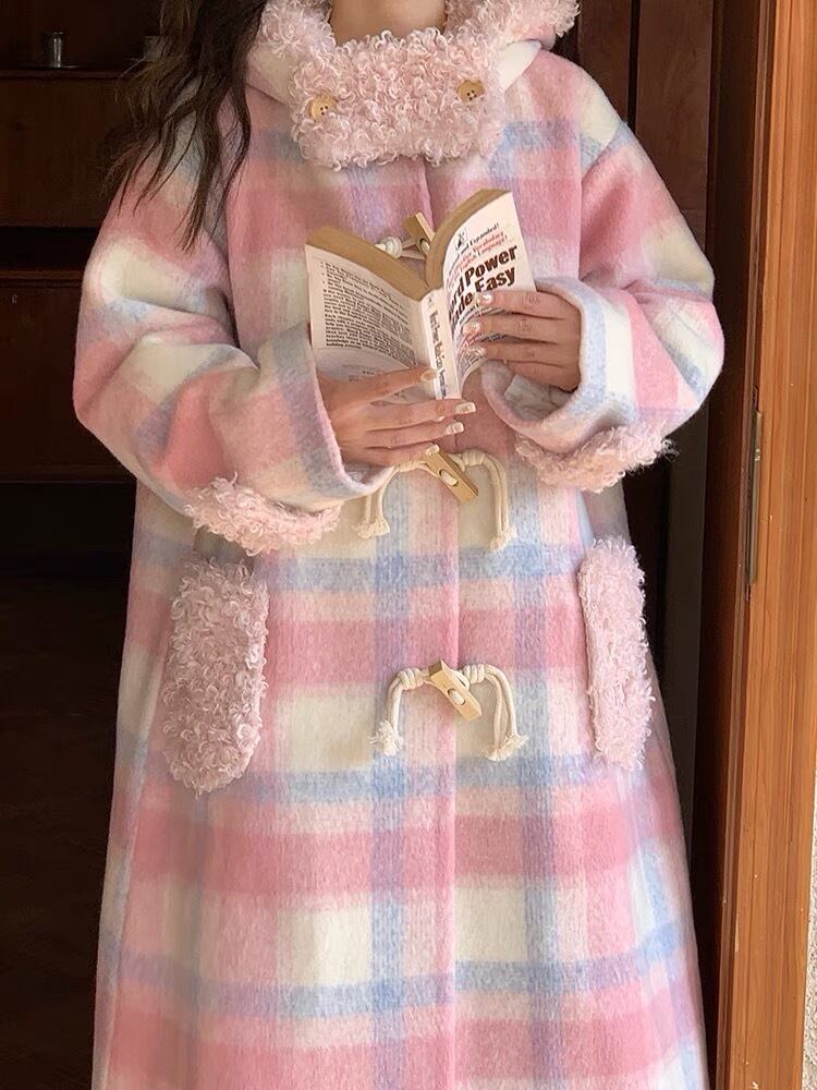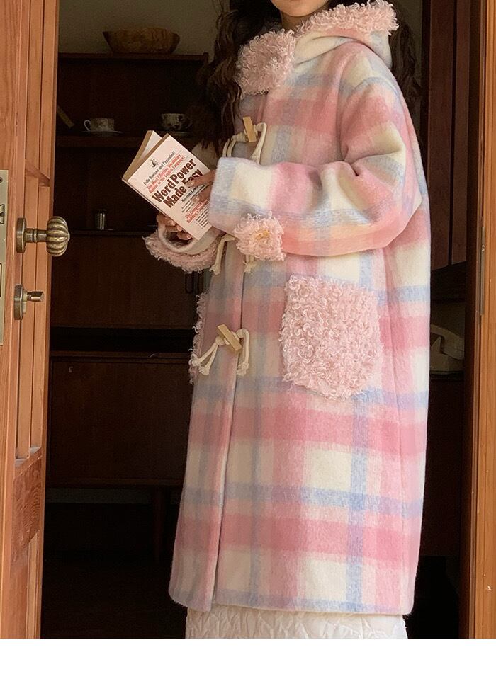 コート アウター チェック ピンク 茶色 フード ゆったり