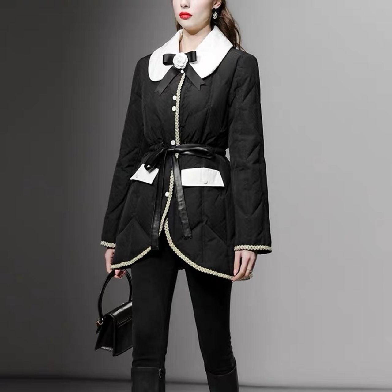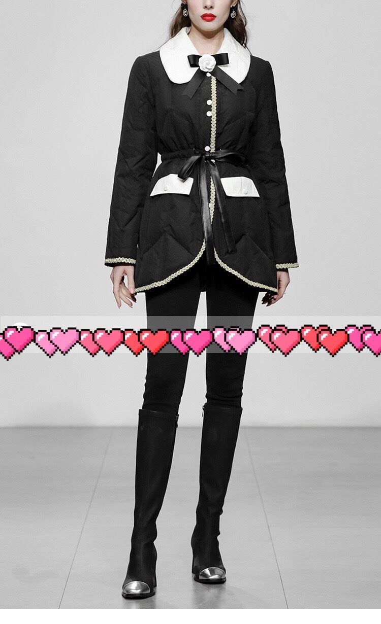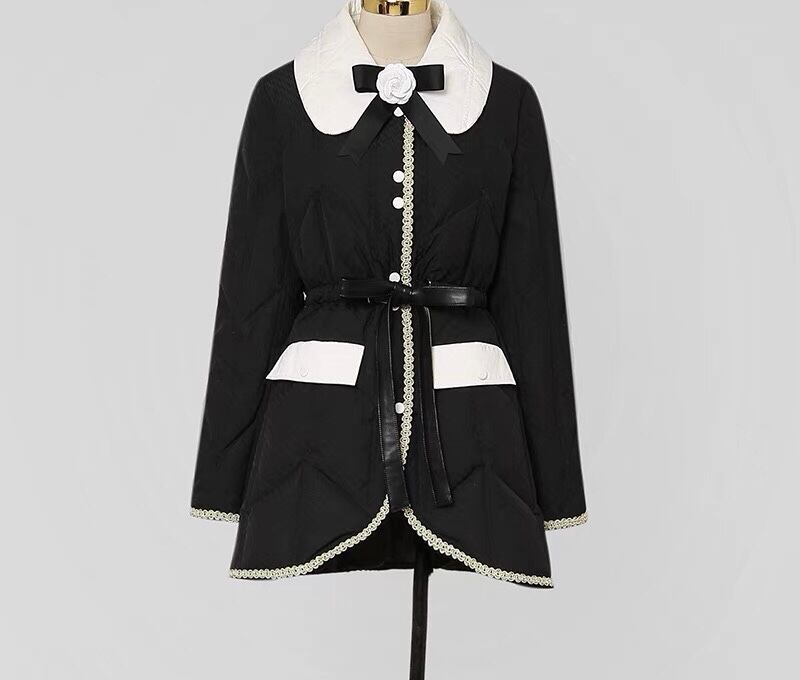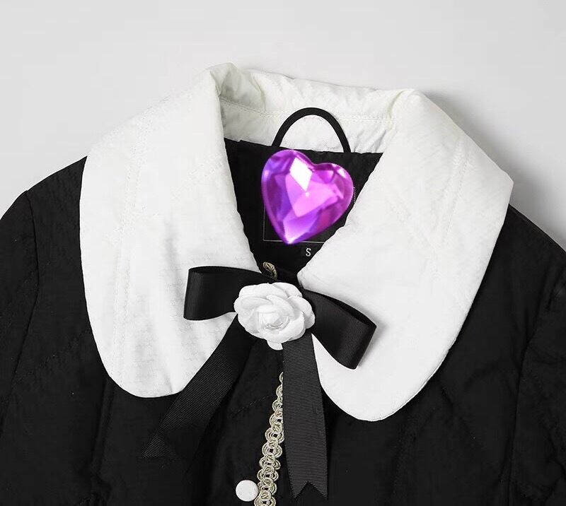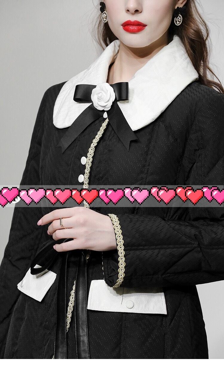 コート 丸襟 エレガント 黒 カメリア ダウン ジャケット