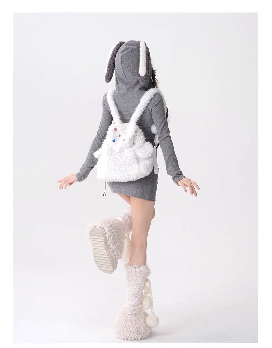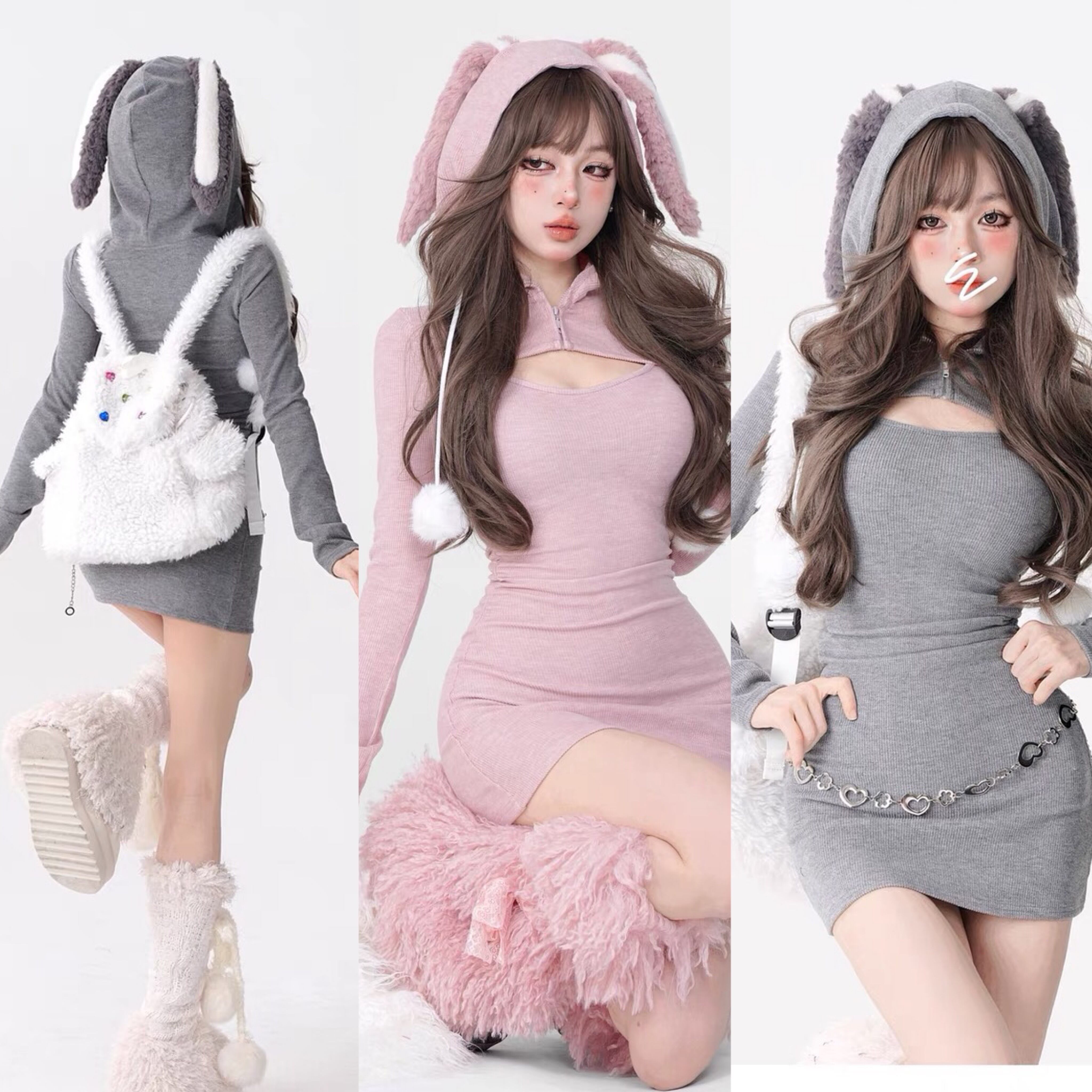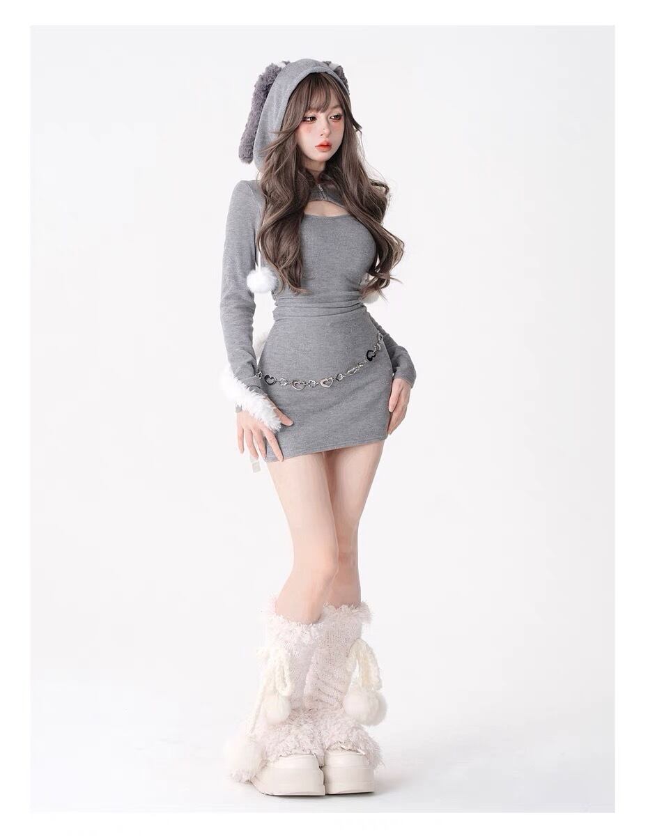 うさみみ うさぎ グレー ピンク ワンピース ニット フード