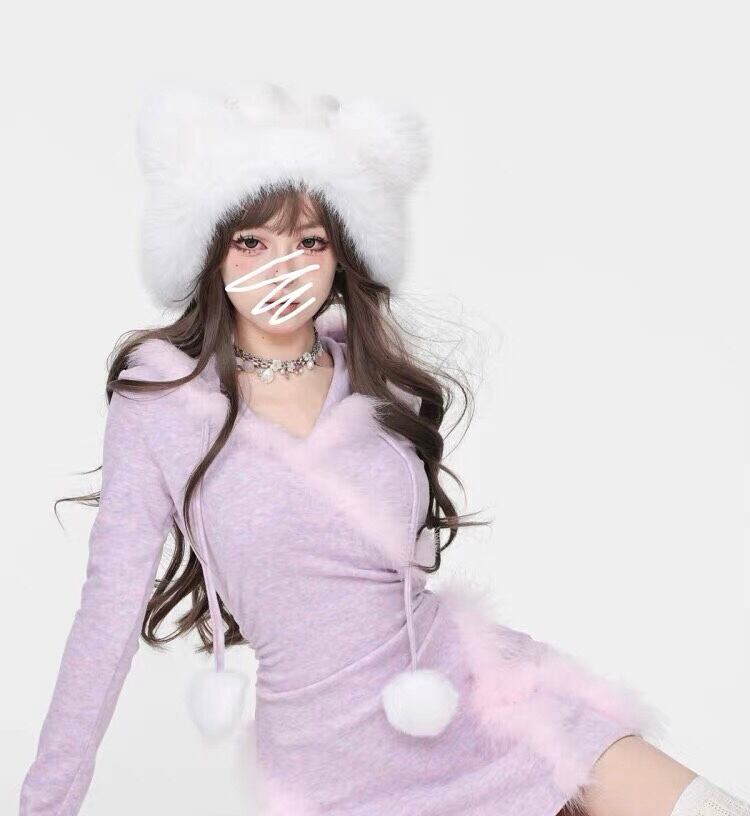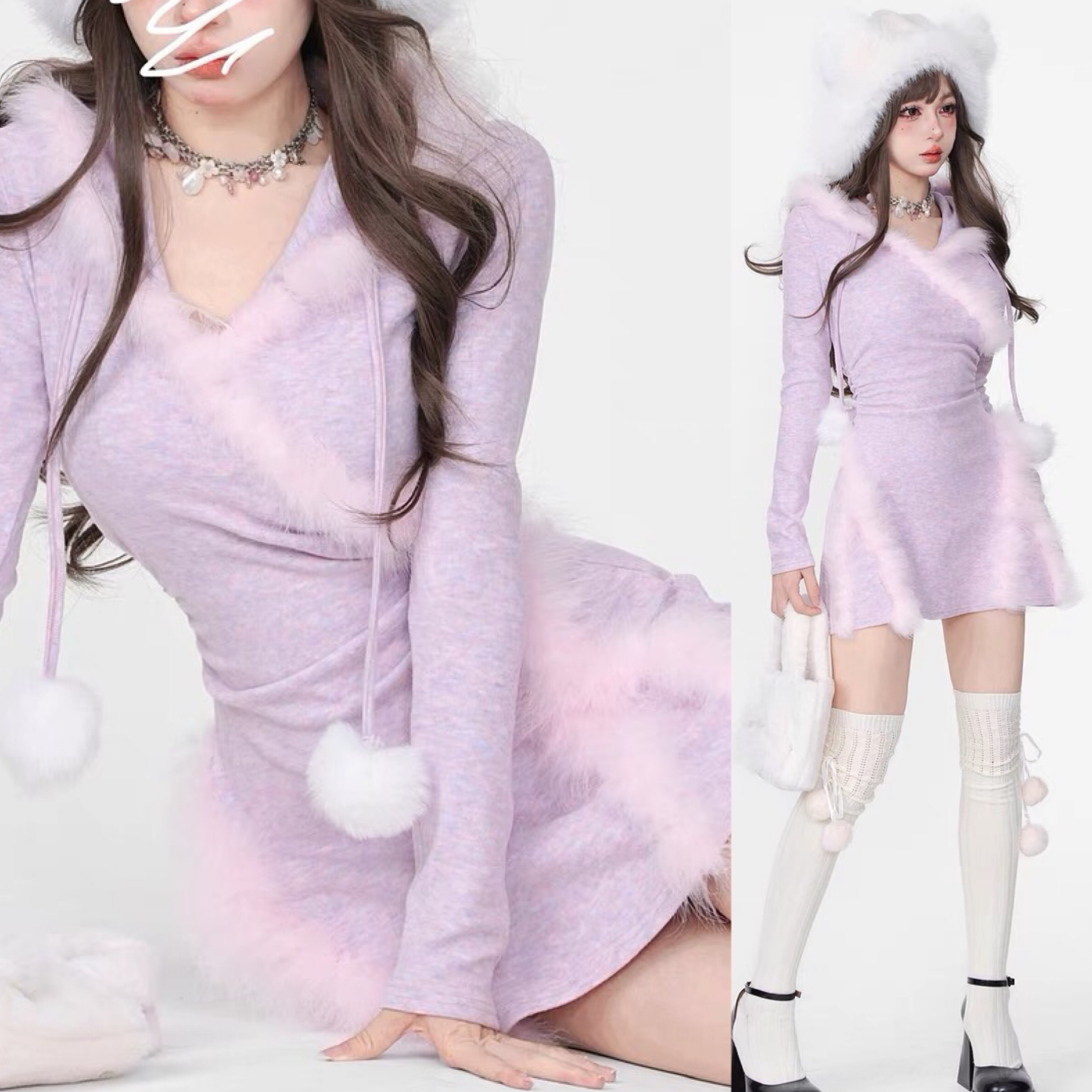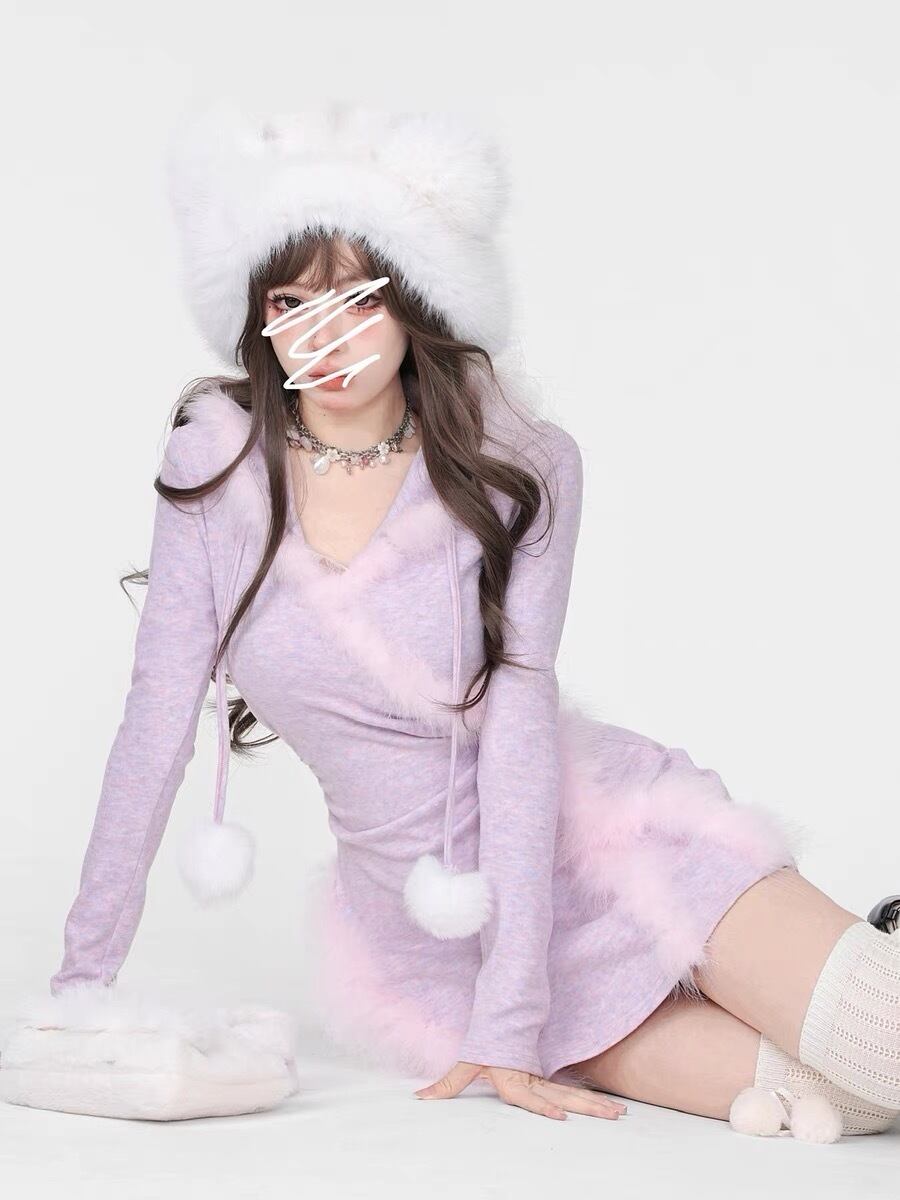 ワンピース パープル 紫 ファー ニット タイト パーカー