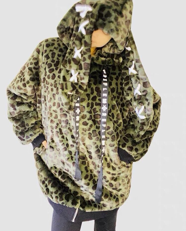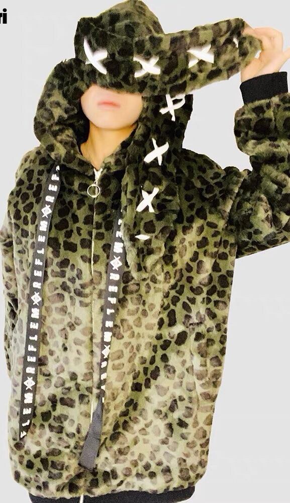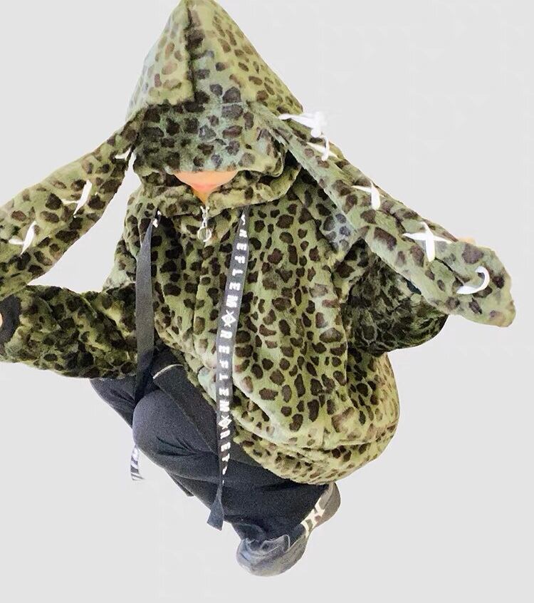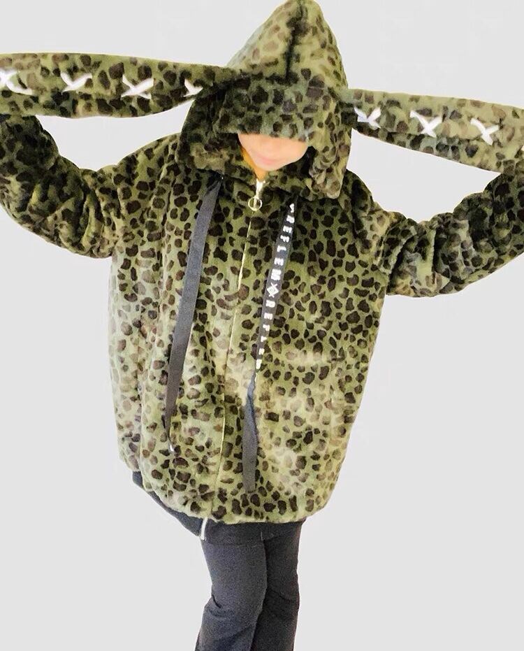 フリース アウター うさみみ 耳 フード パーカー レオパード 緑 黄色