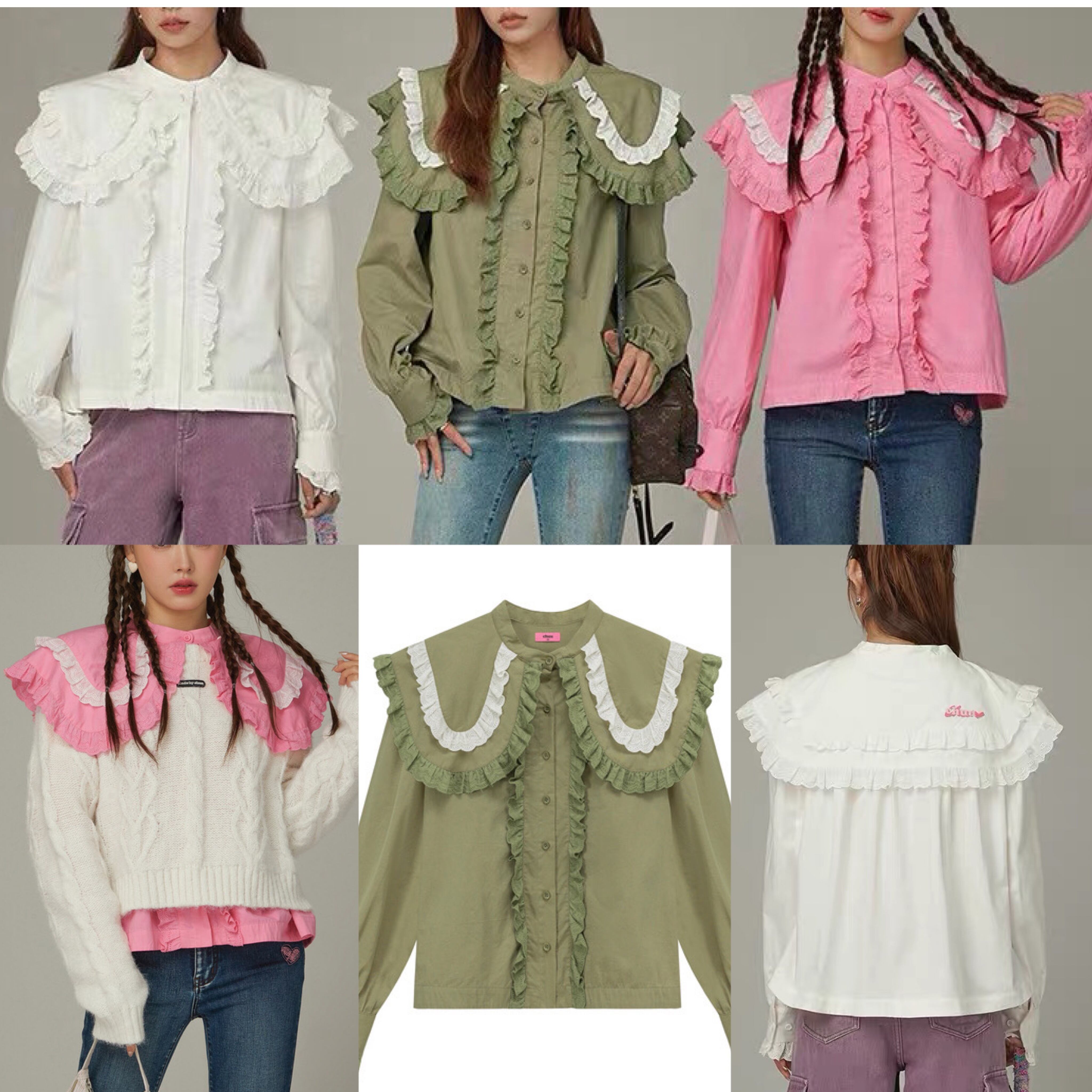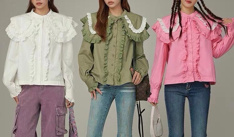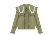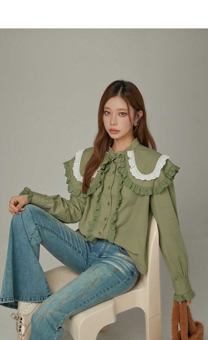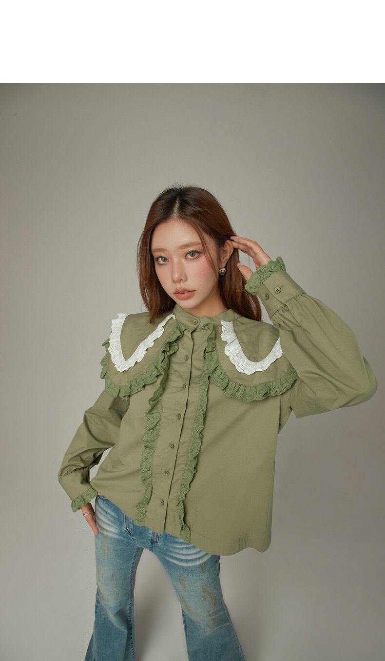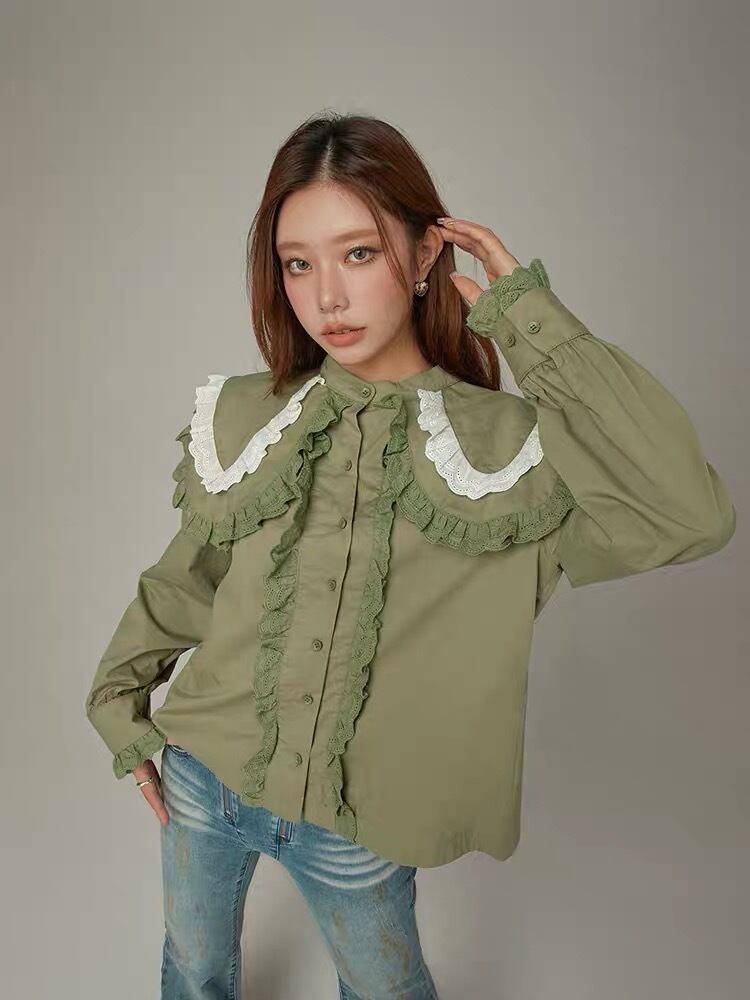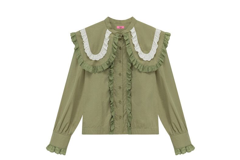 ブラウス 緑 丸襟 ピンク 緑 シャツ デカ襟