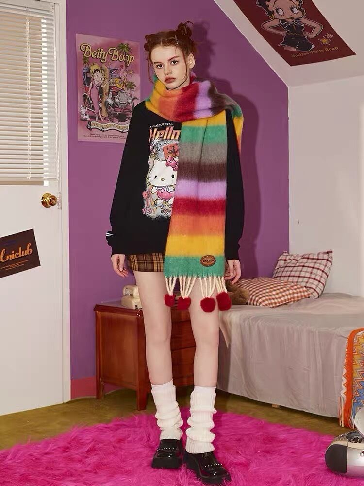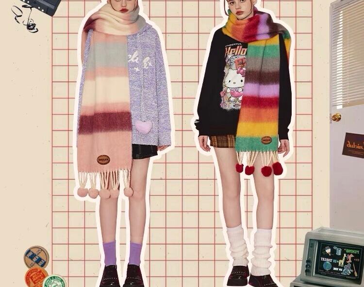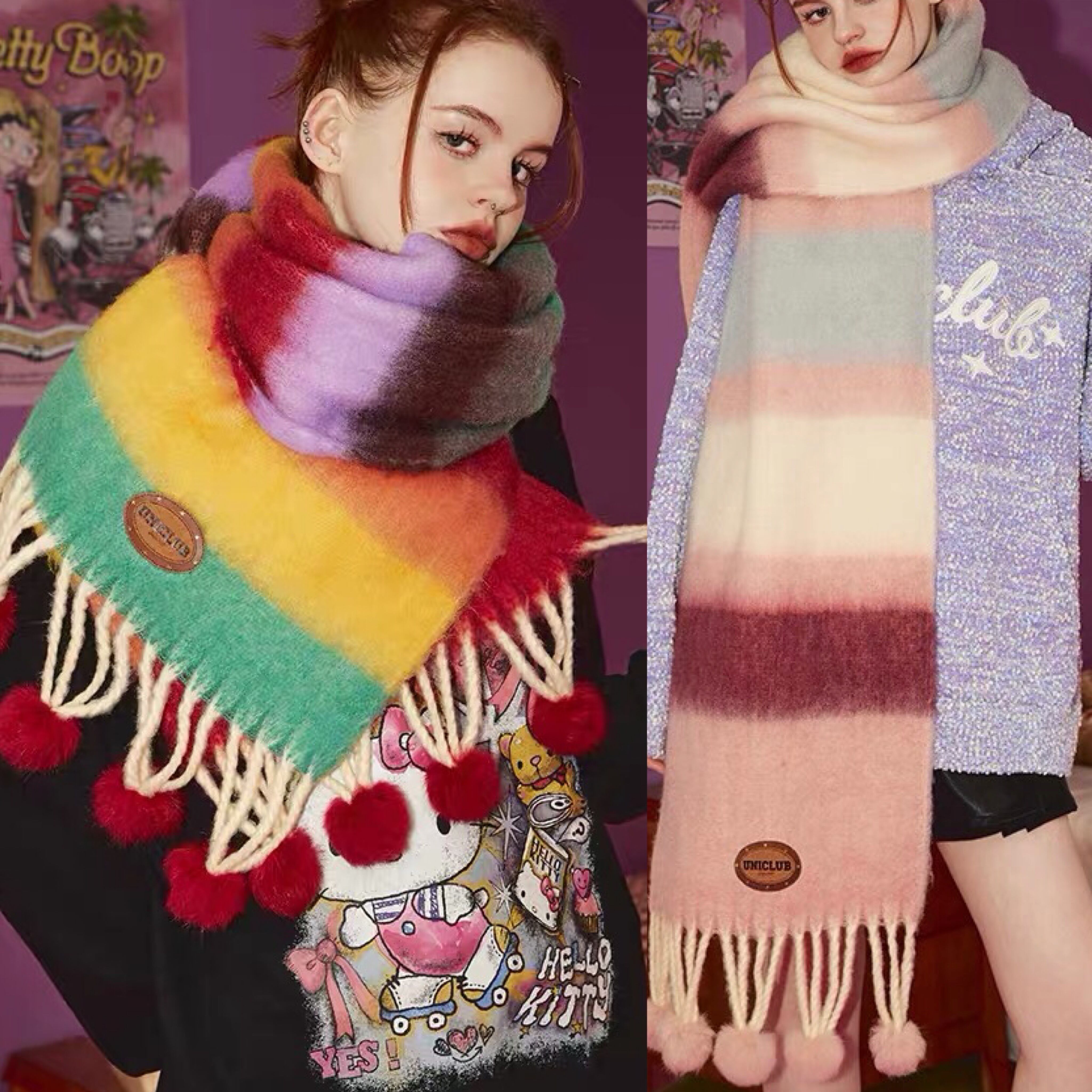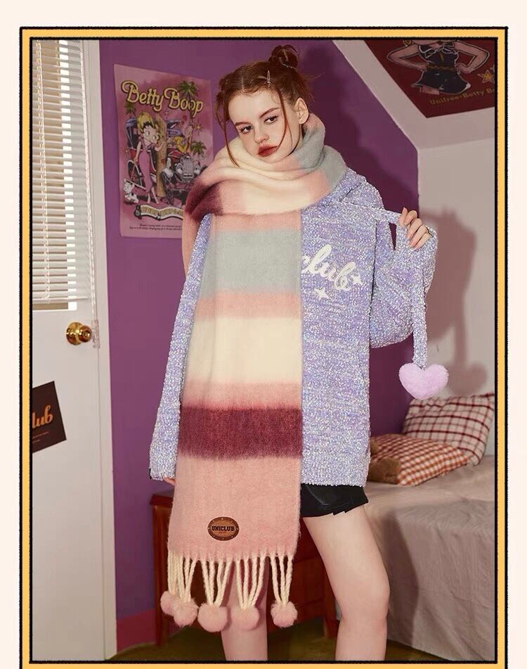 マフラー ぽんぽん ボーダー カラフル ピンク ショール