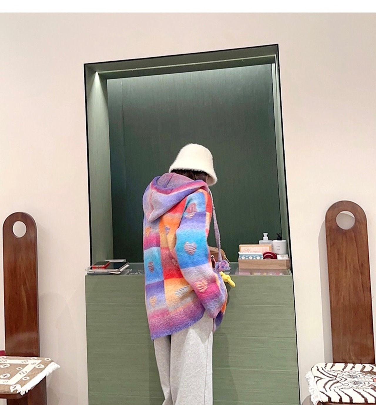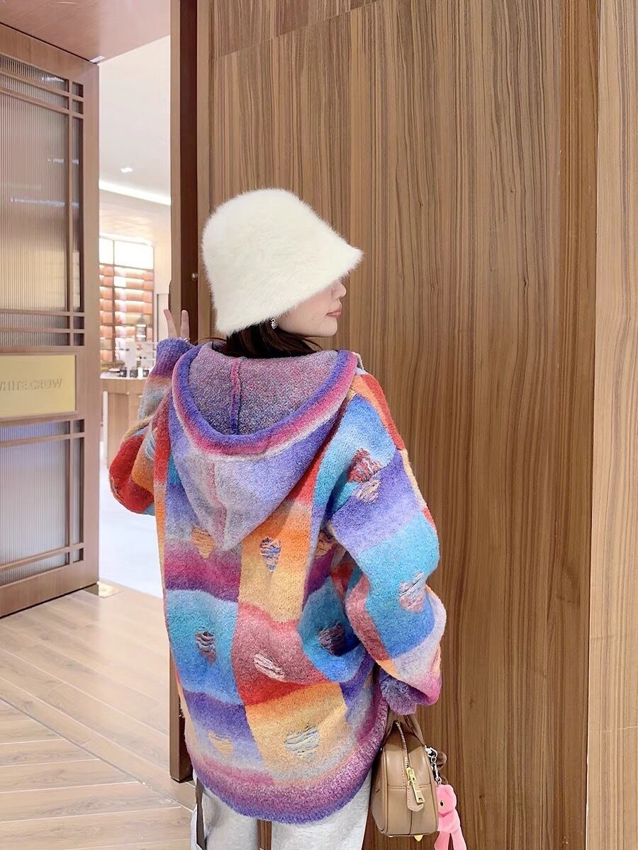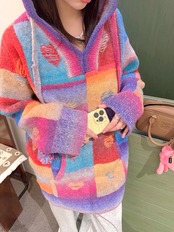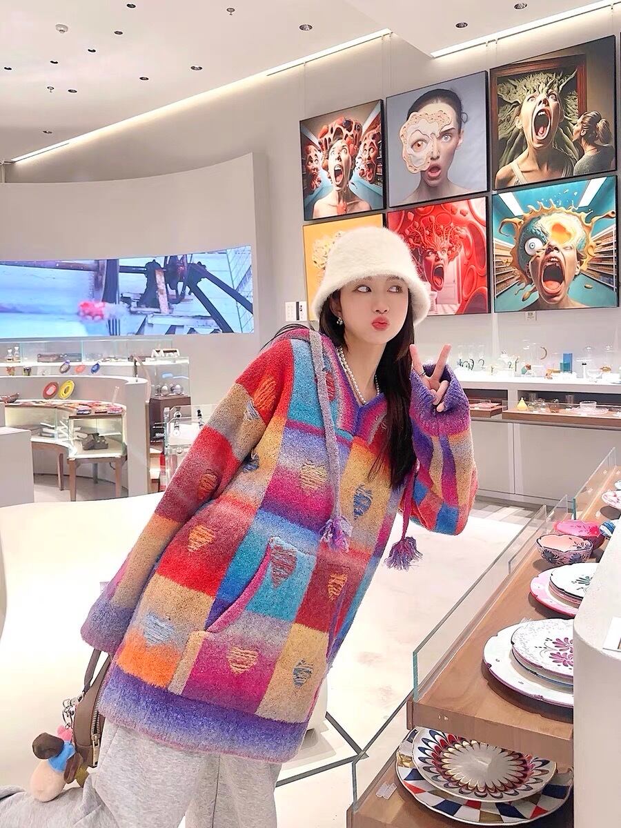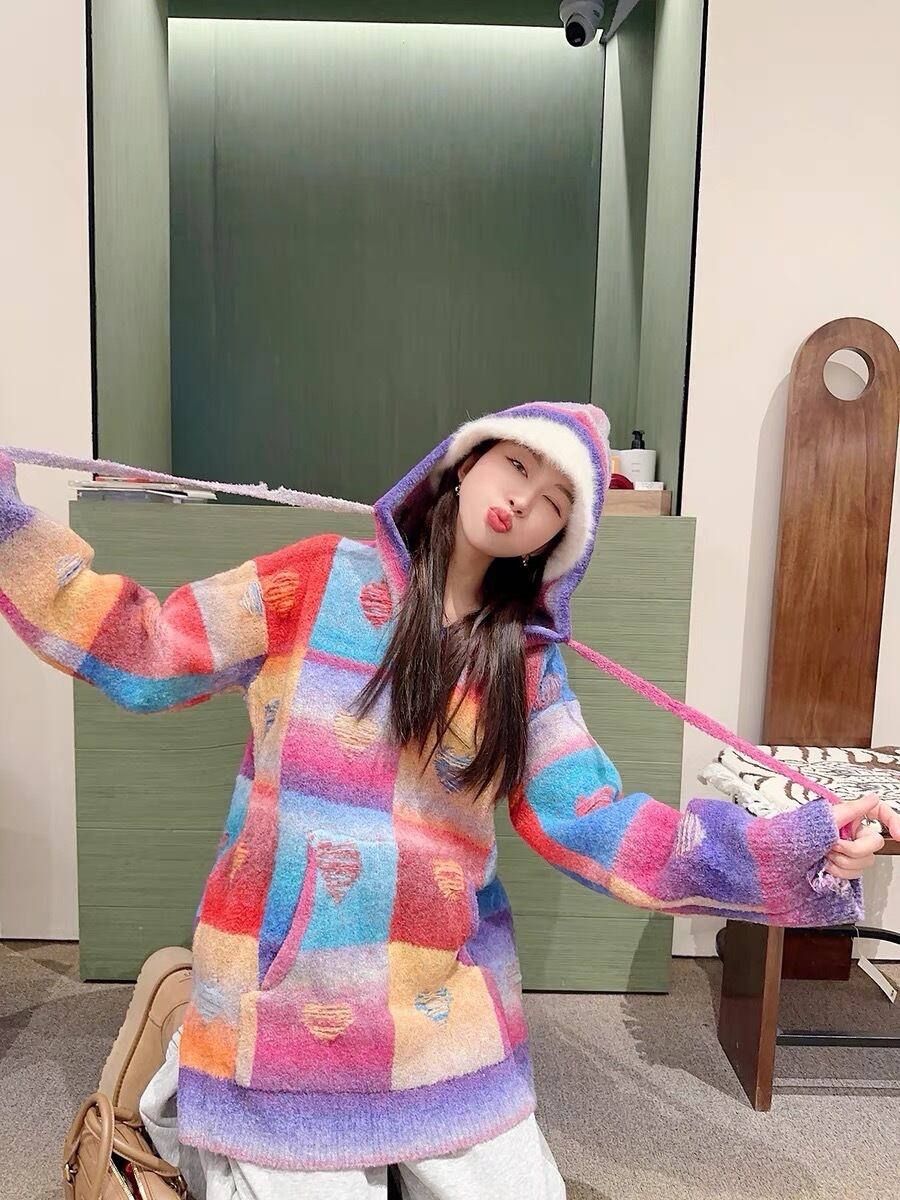 セーター オレンジ ピンク チェック ハート ガーリー パーカー