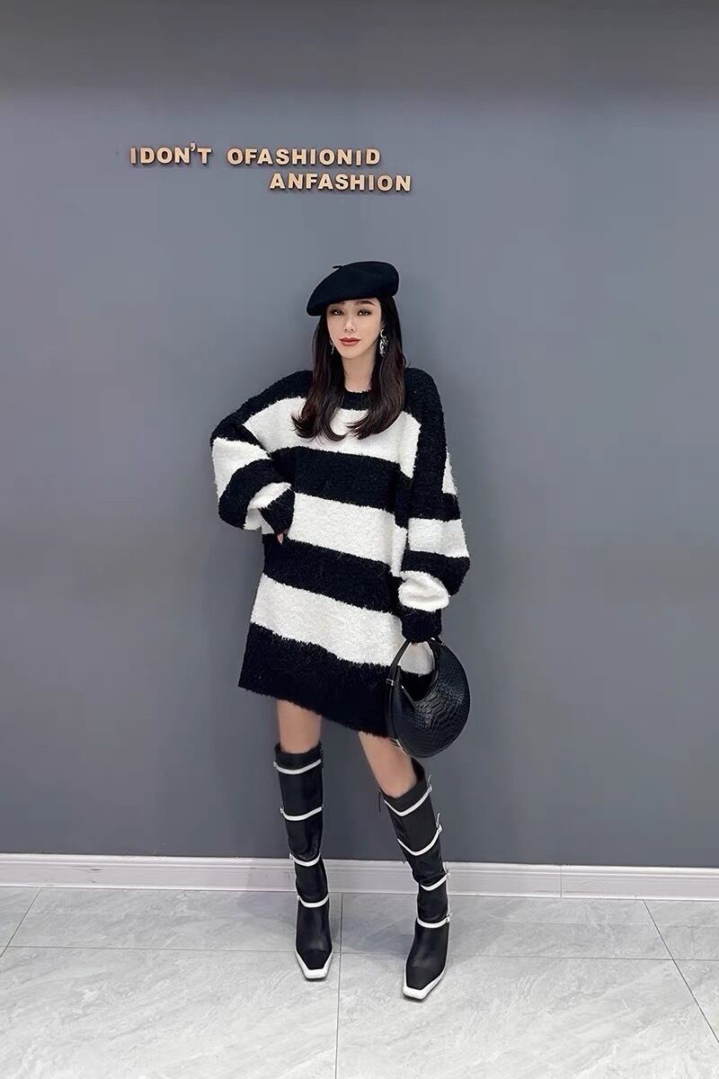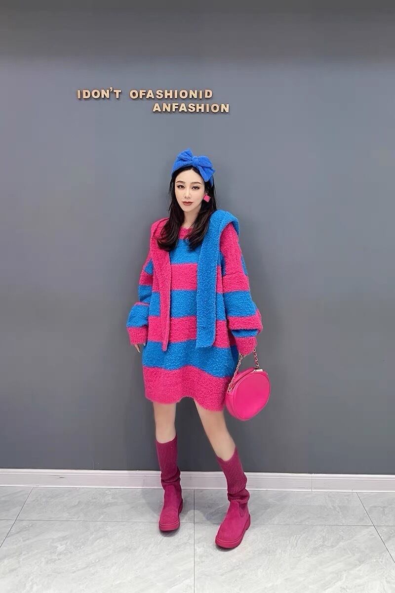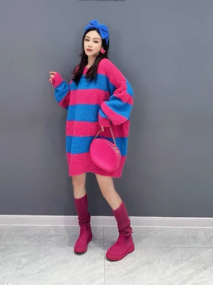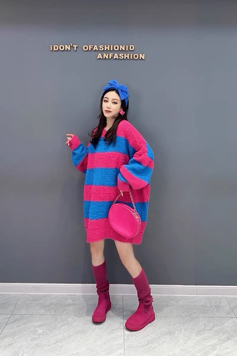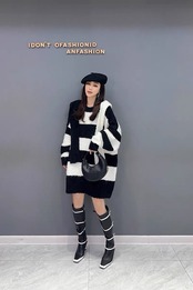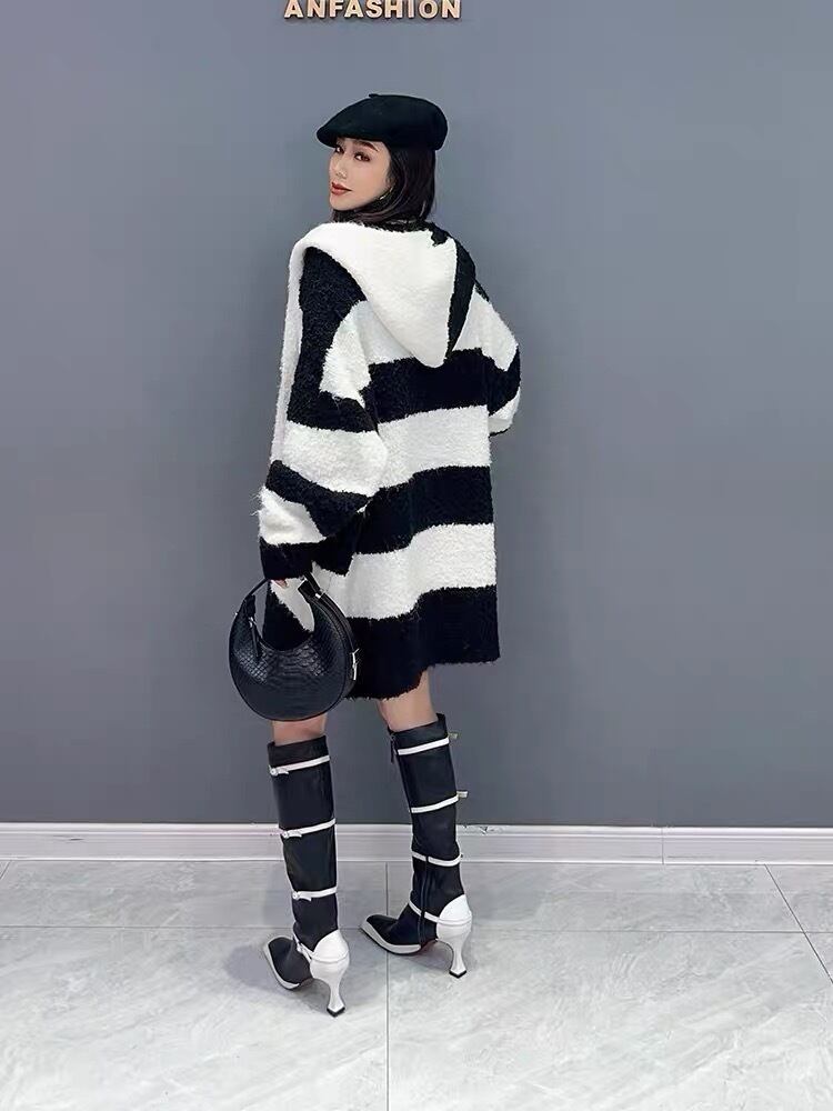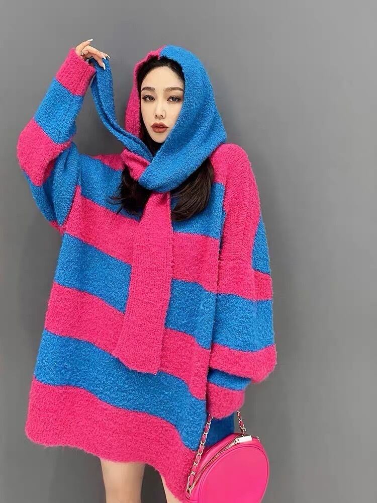【マフラーフード付き】ボーダー セーター ニット 白 ピンク