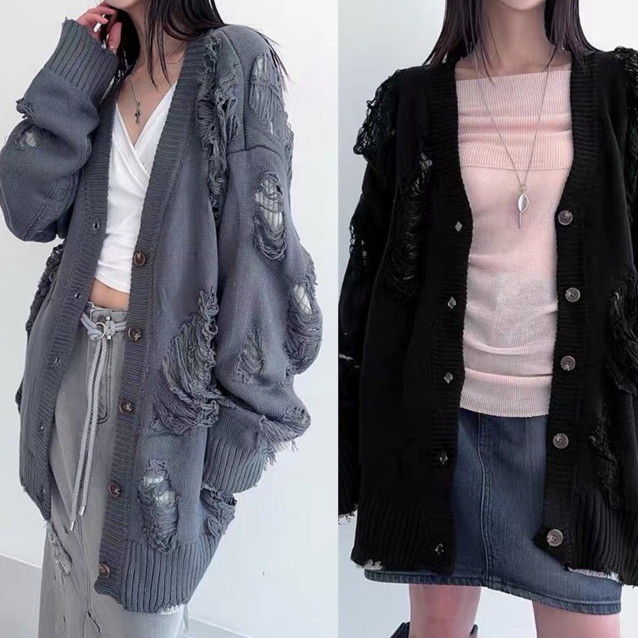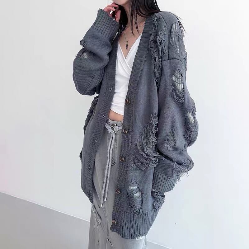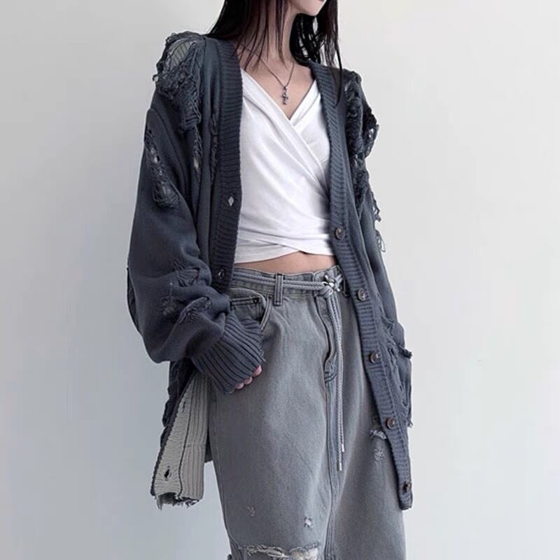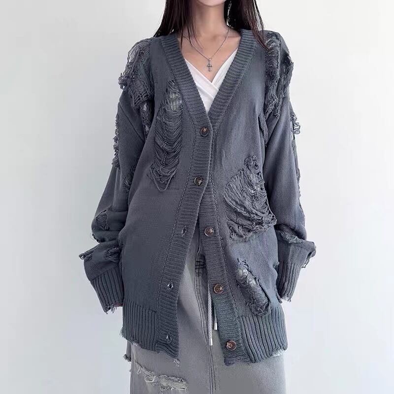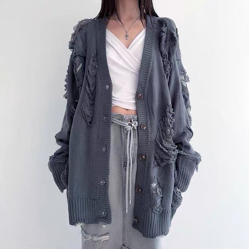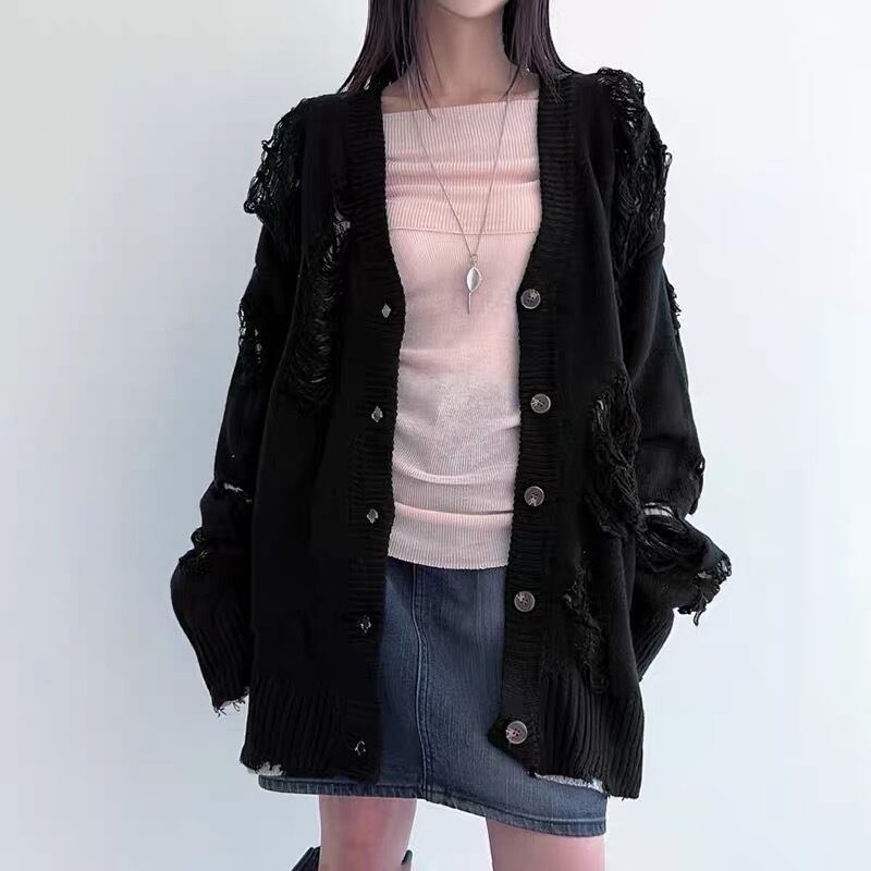 グレー 黒 ブラック カーディガン ニット ダメージ セーター