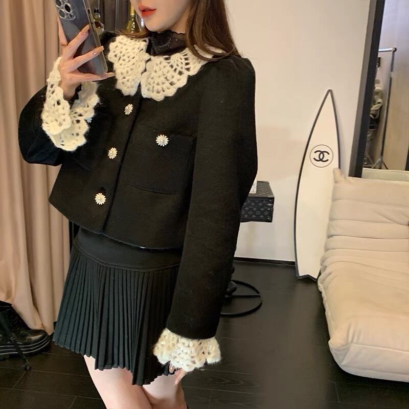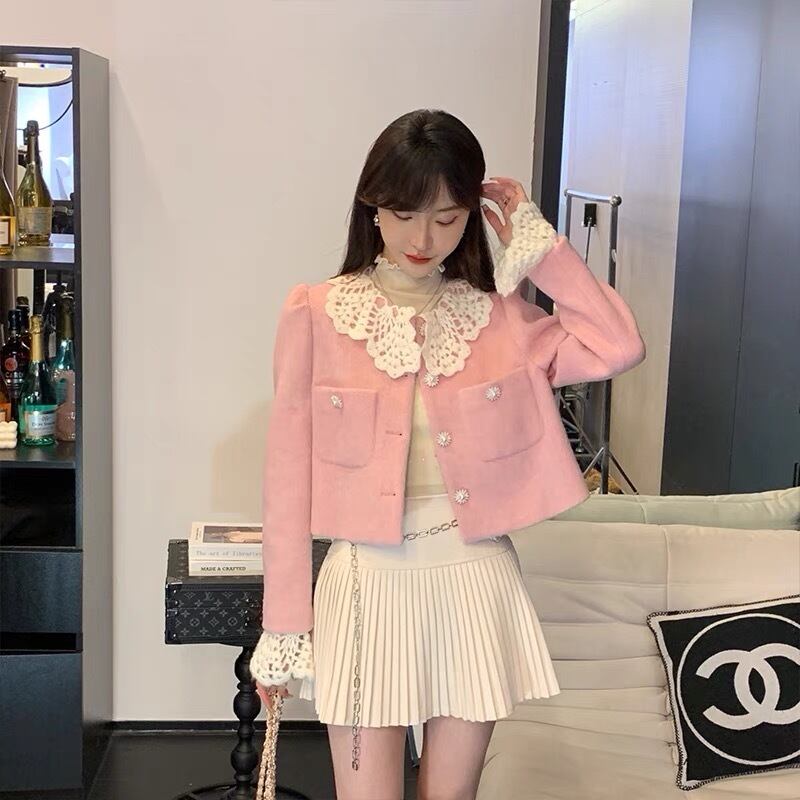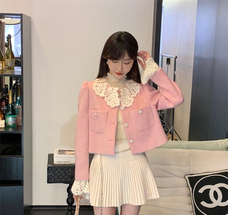 ジャケット ピンク 黒 丸襟 可愛い アウター