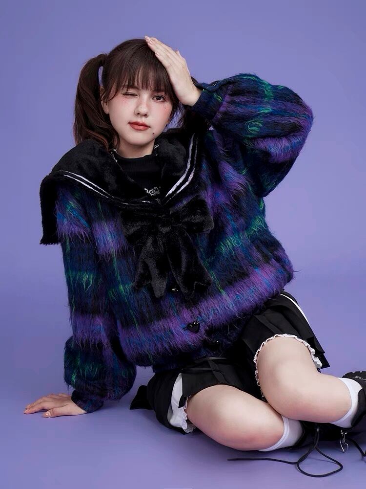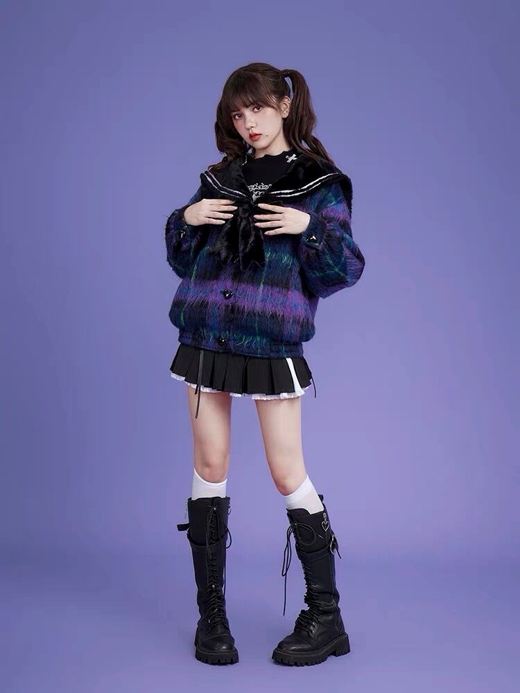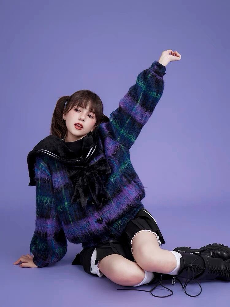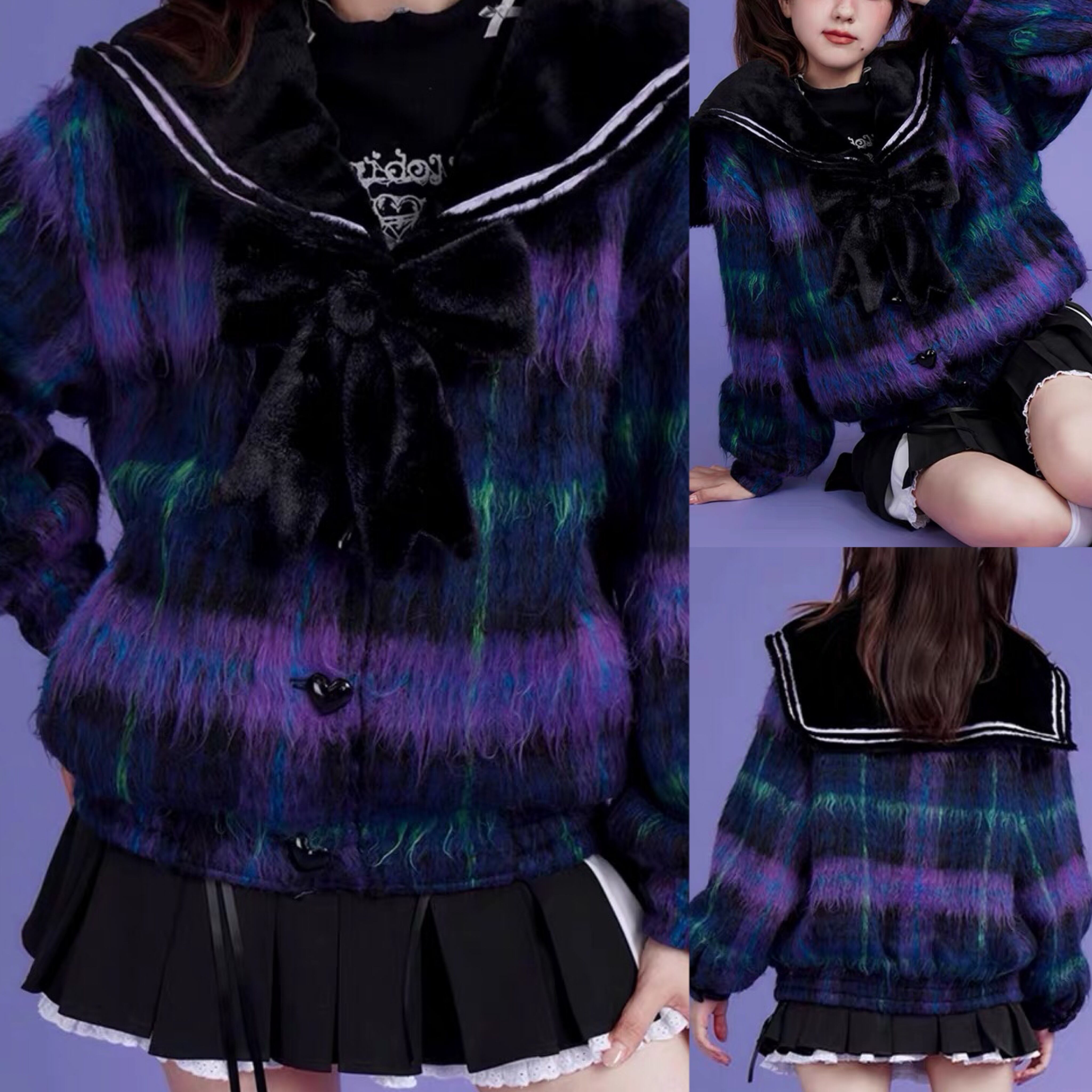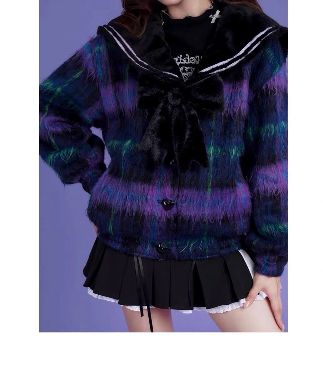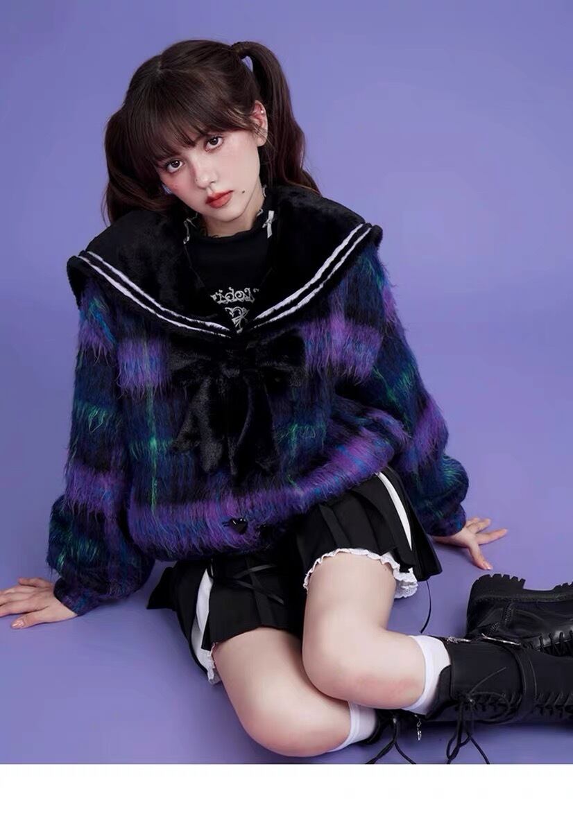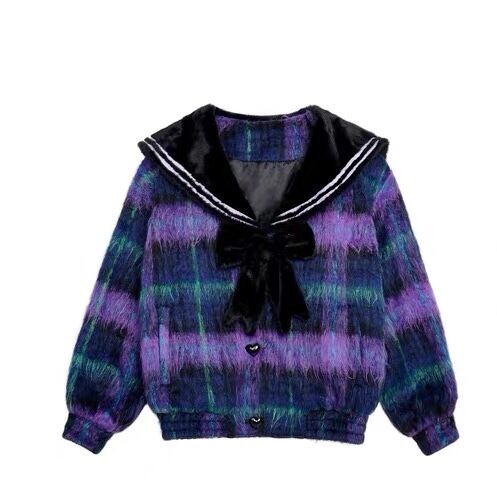 チェック 紫 ネイビー アウター ジャケット コート リボン