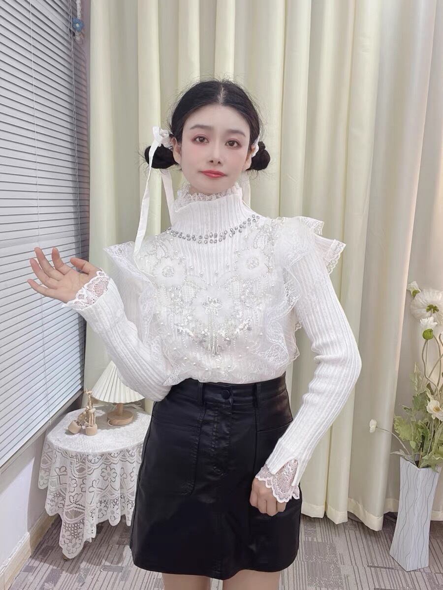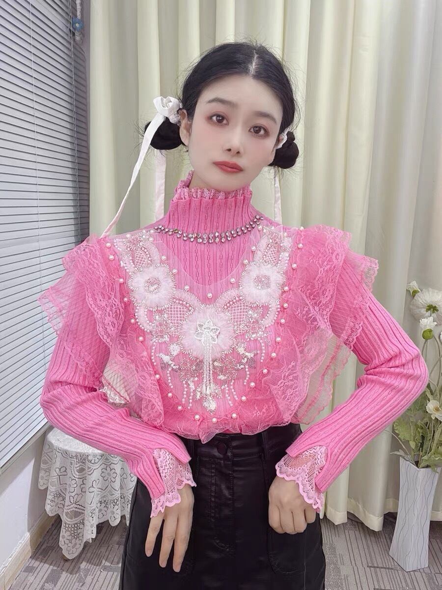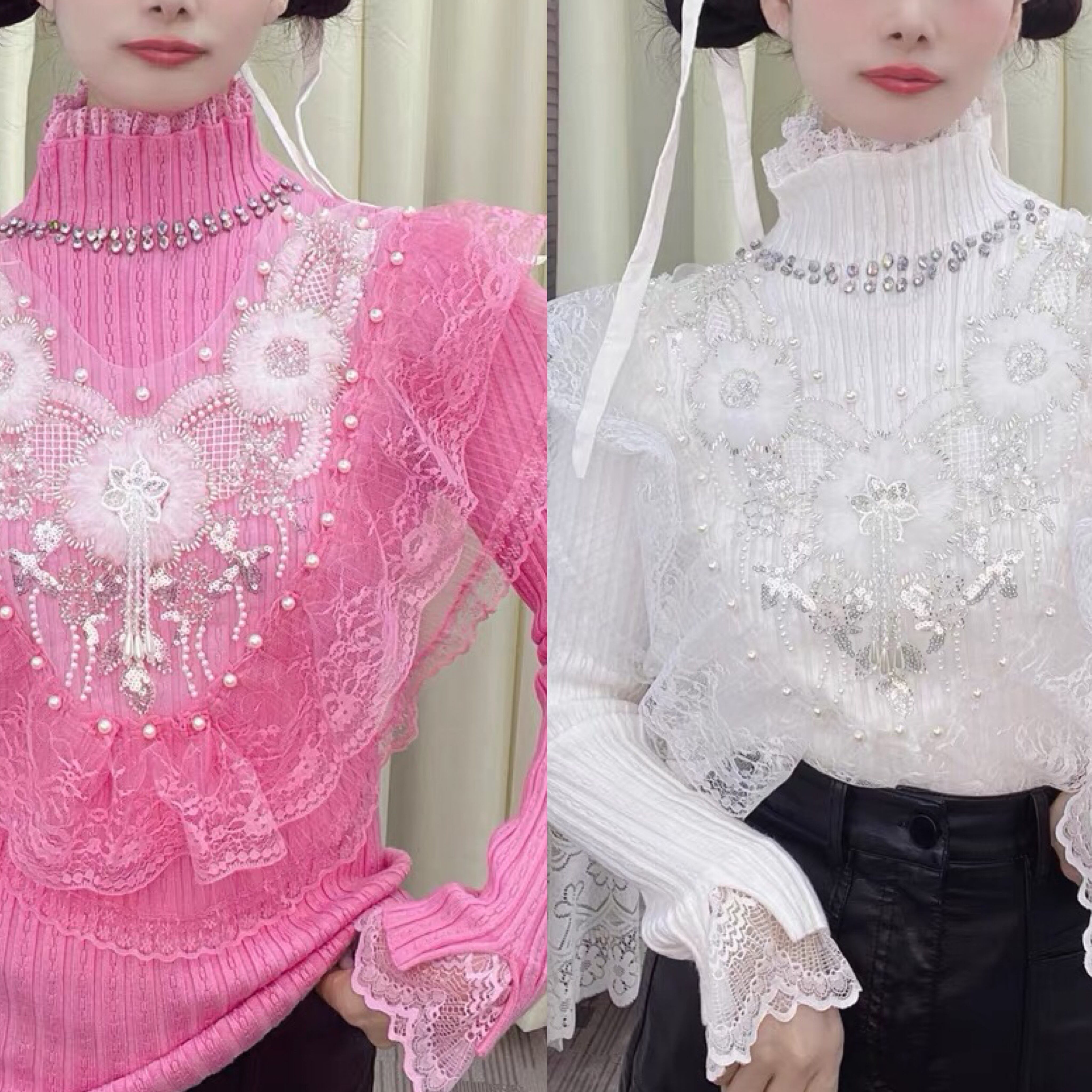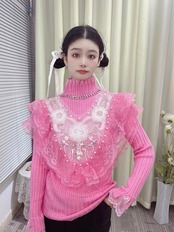 ハイネック ピンク 白 ブラウス ガーリー
