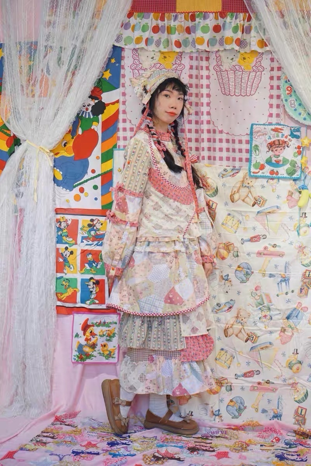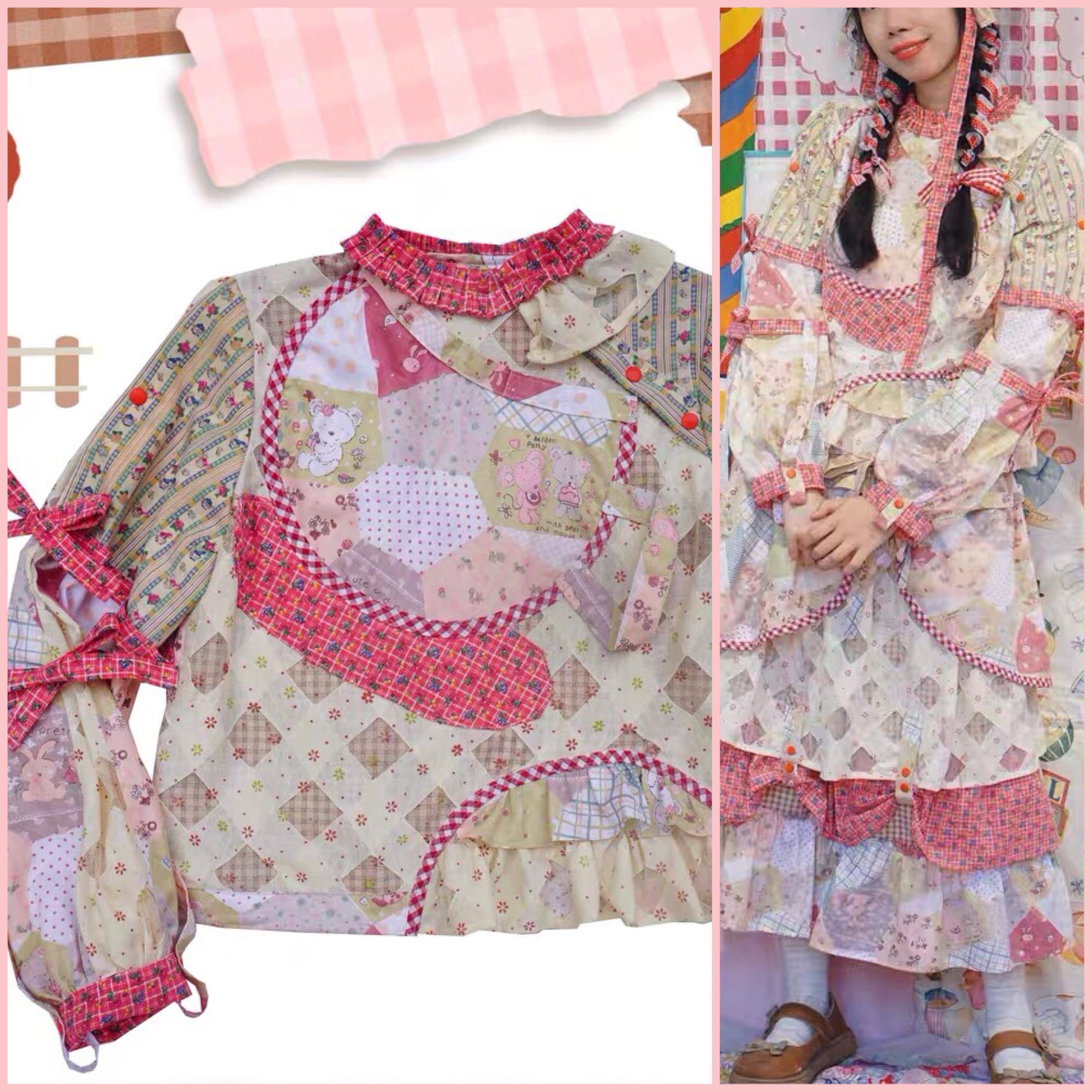 【ブラウス】ピンク リボン パッチワーク トップス ガーリー