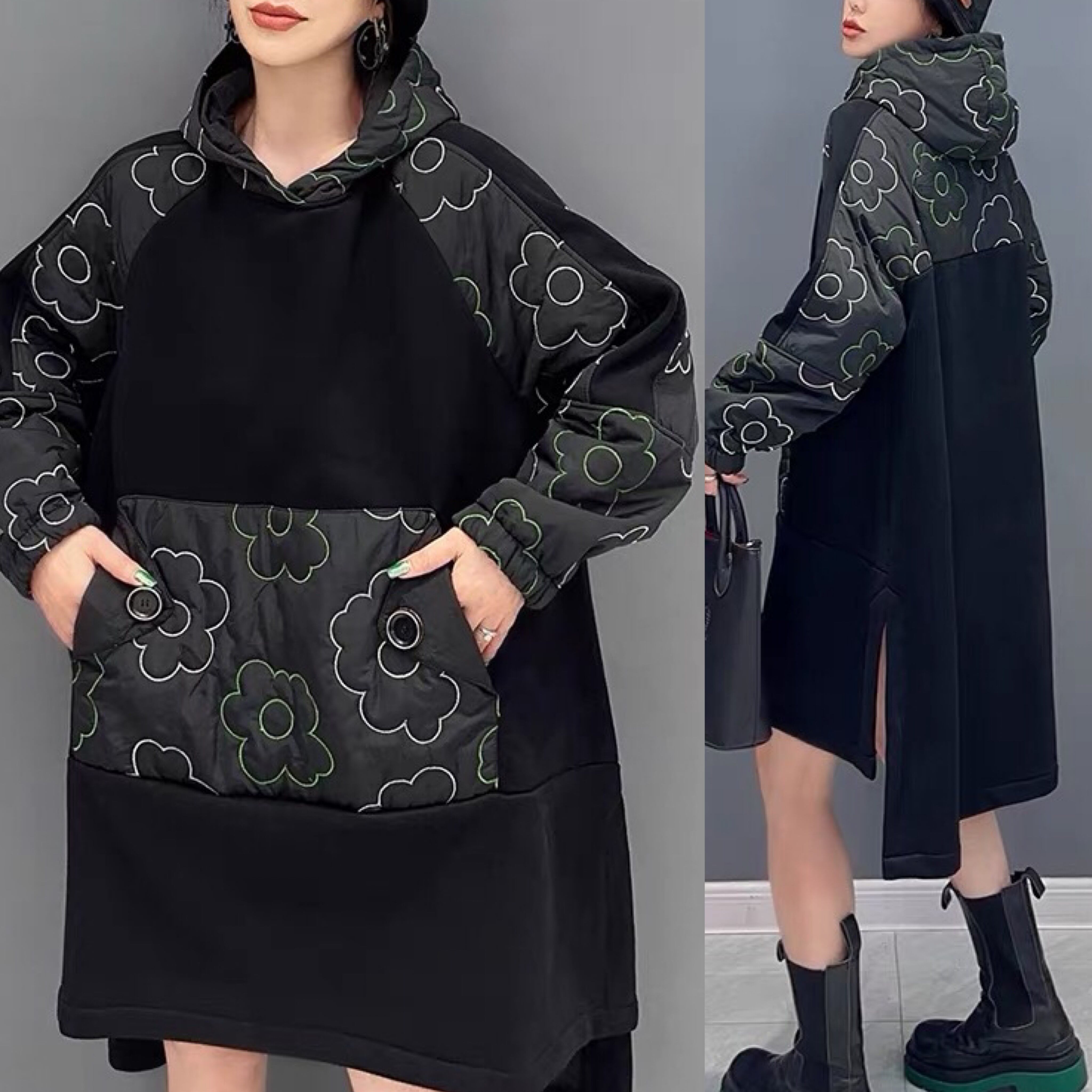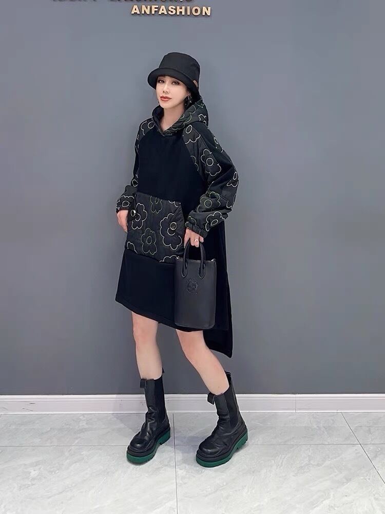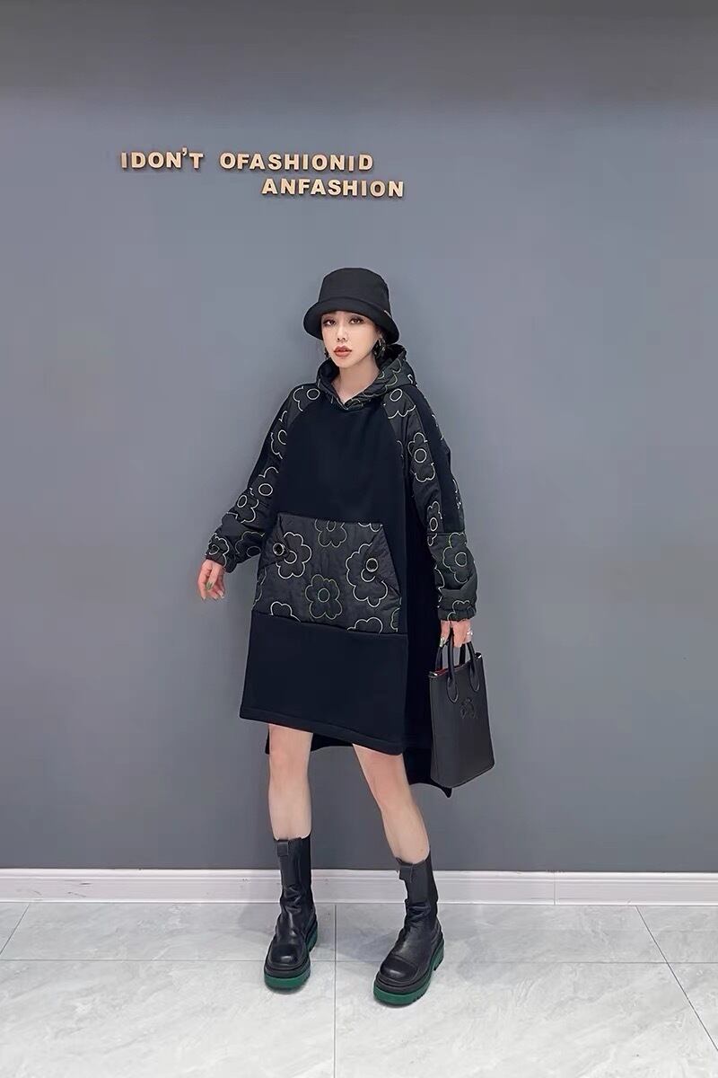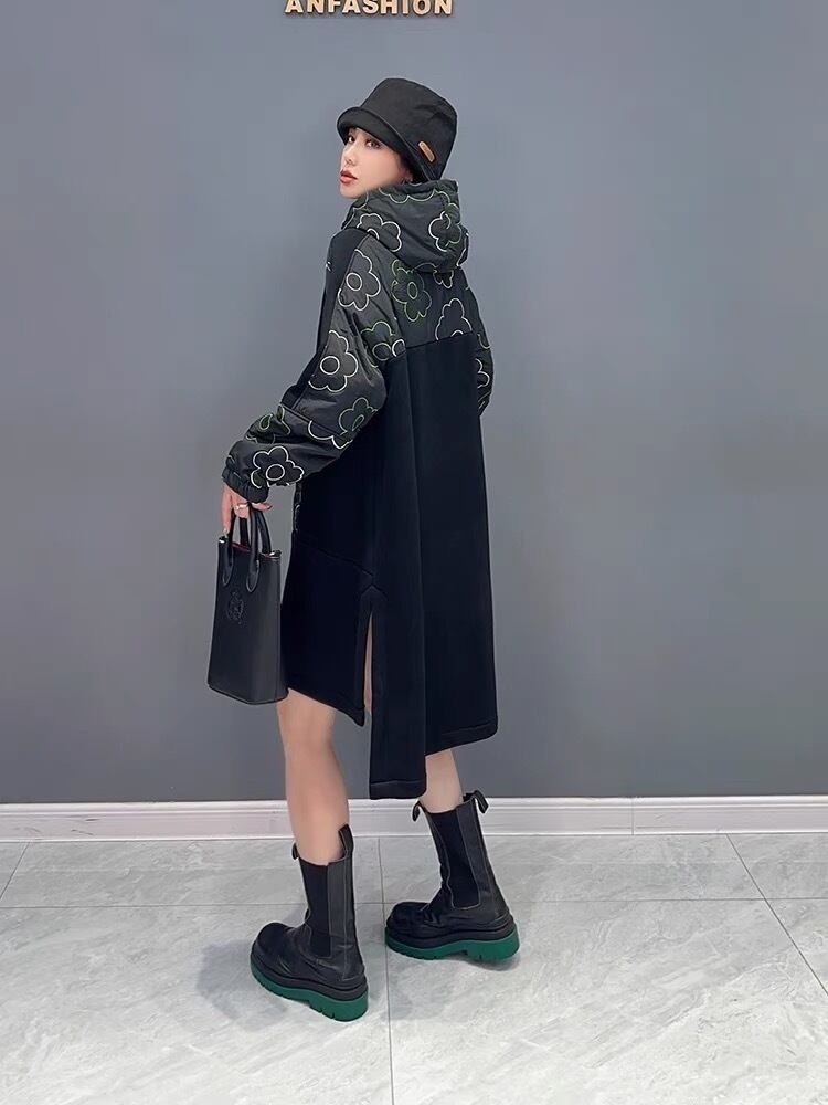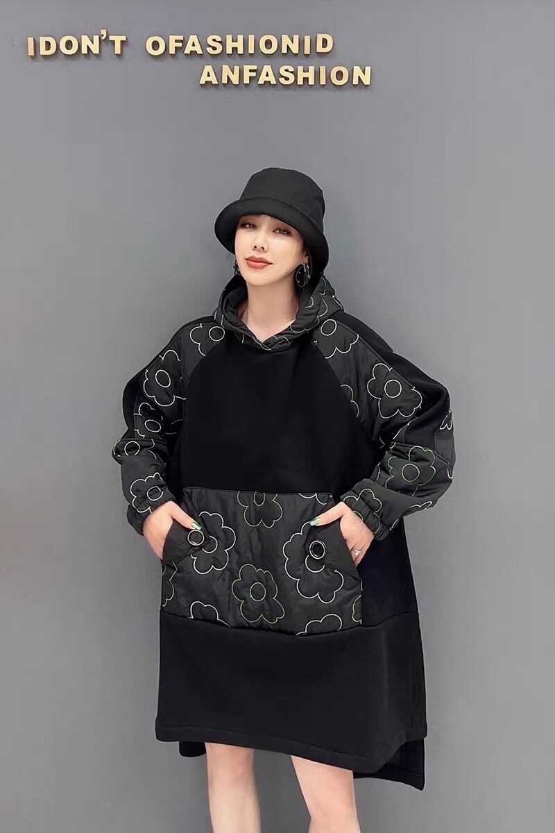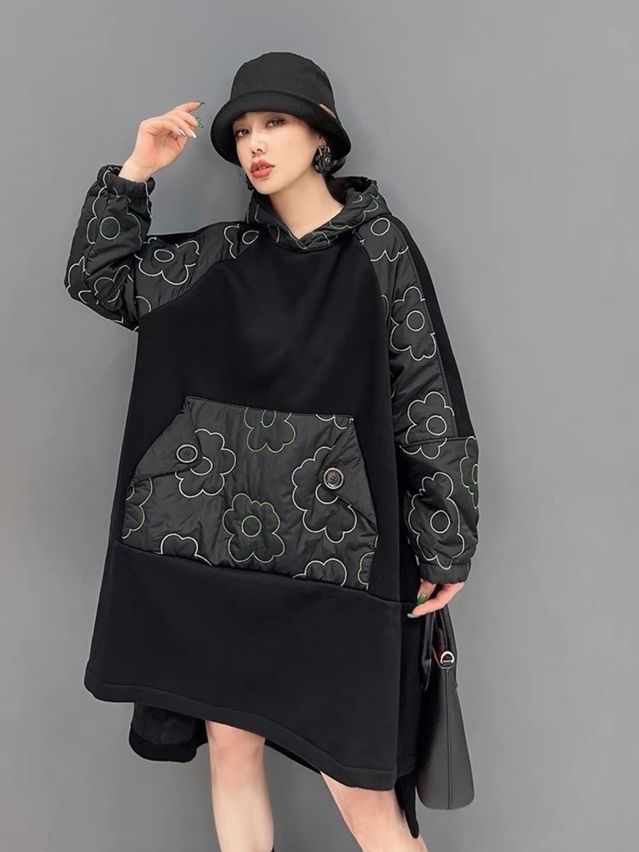 アウター 黒 花柄 パーカー ブラック フラワー ゆったり