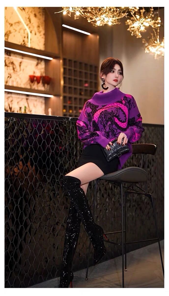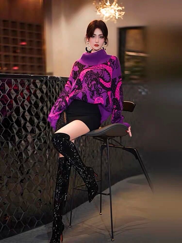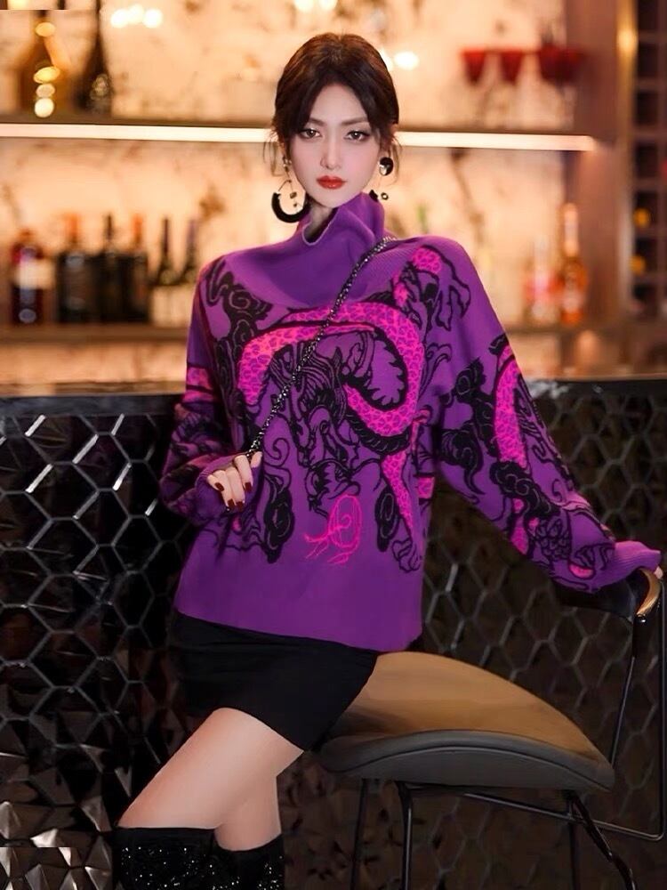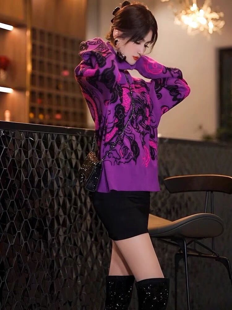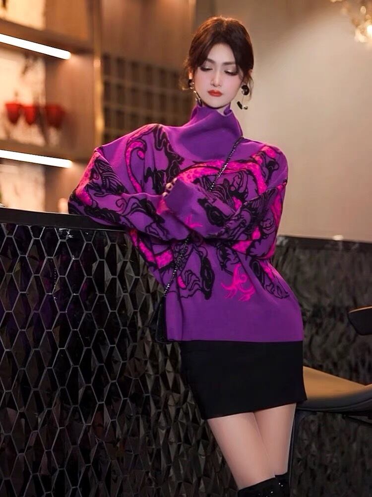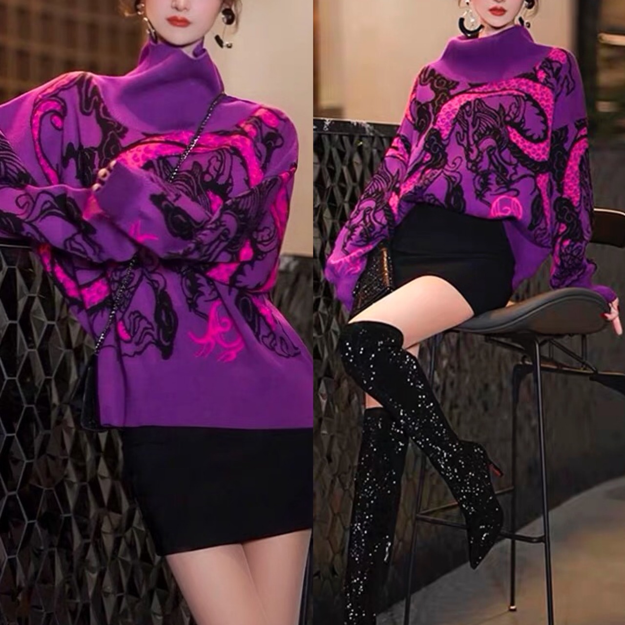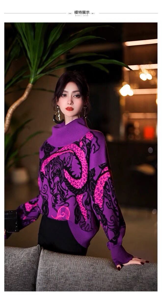 セーター 紫 ピンク ハイネック カーディガン ニット