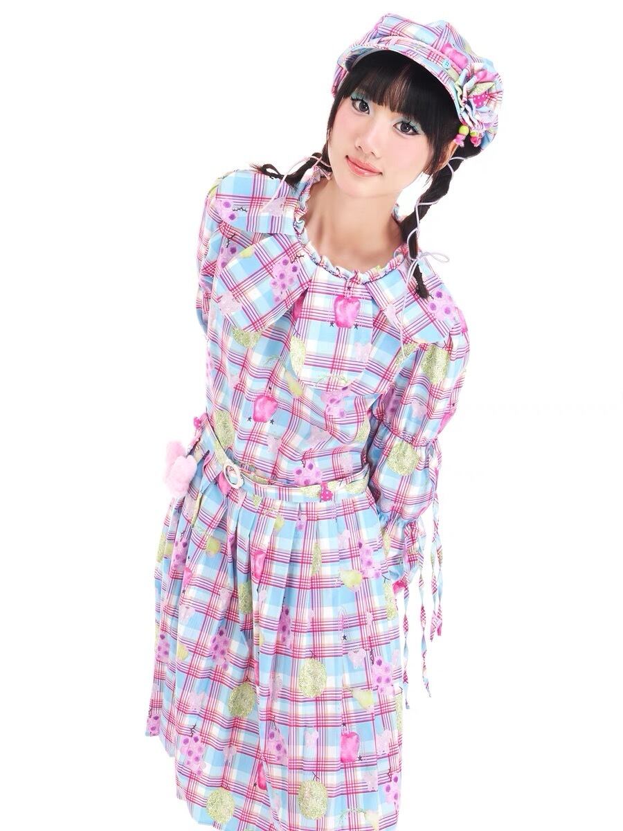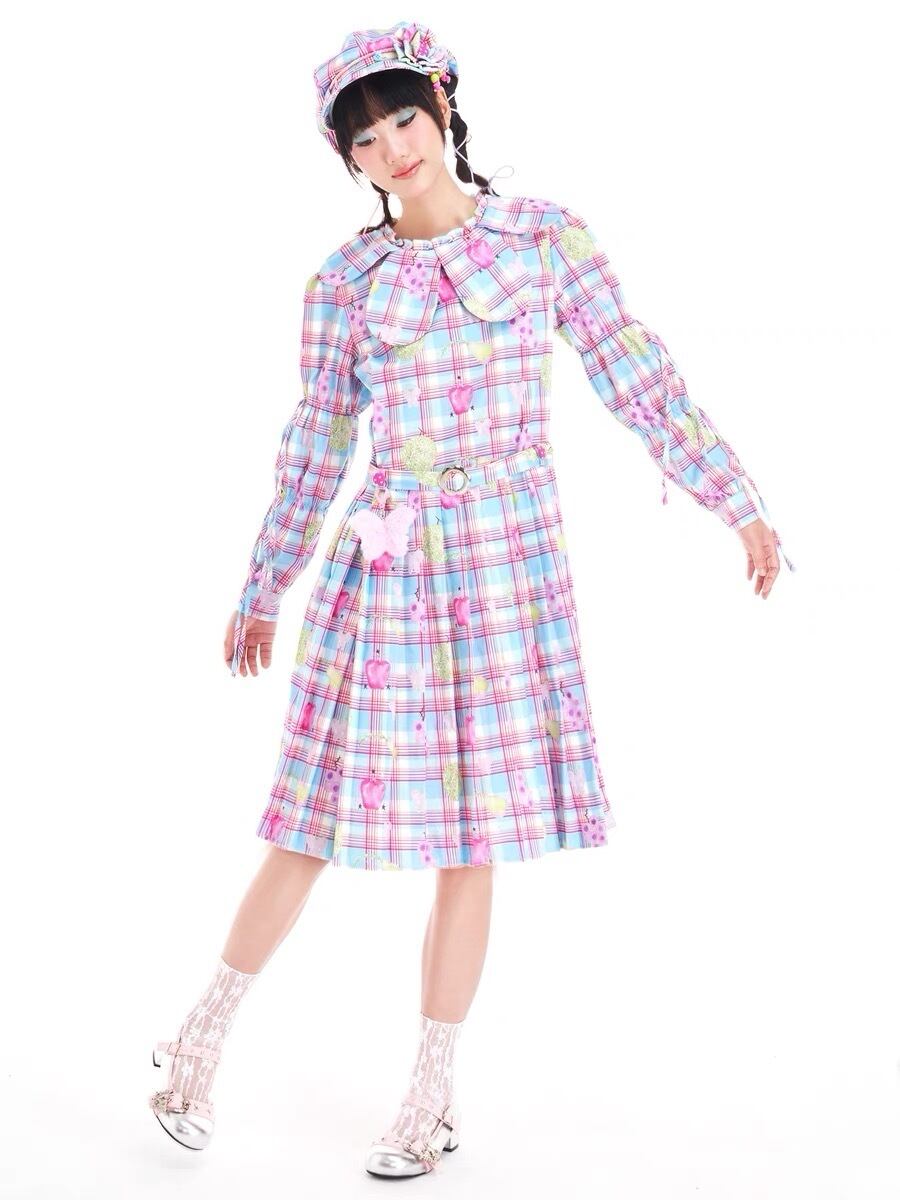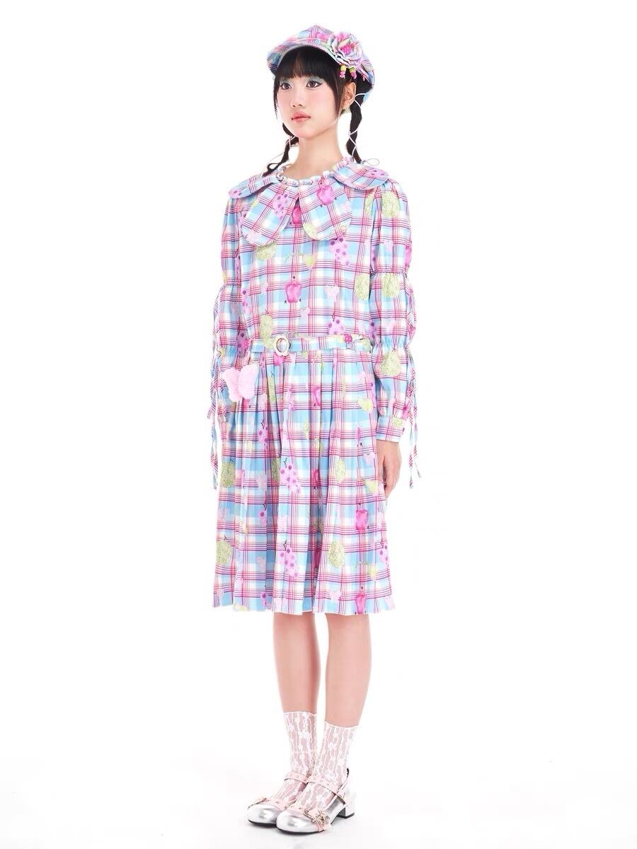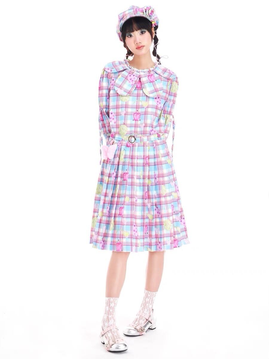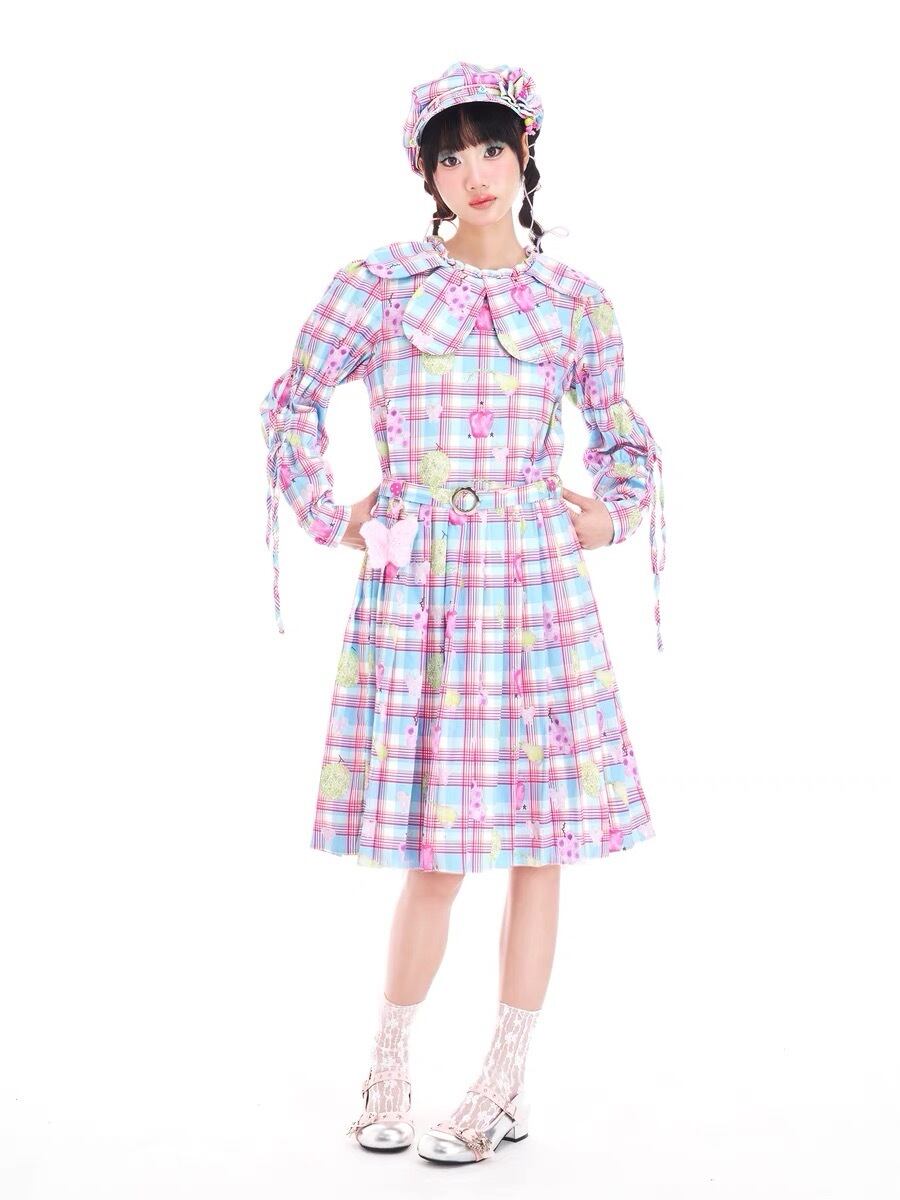 ワンピース チェック ピンク 丸襟 水色 チェック ガーリー
