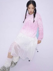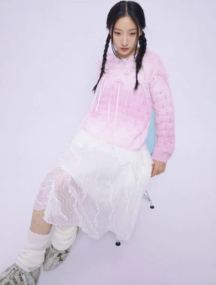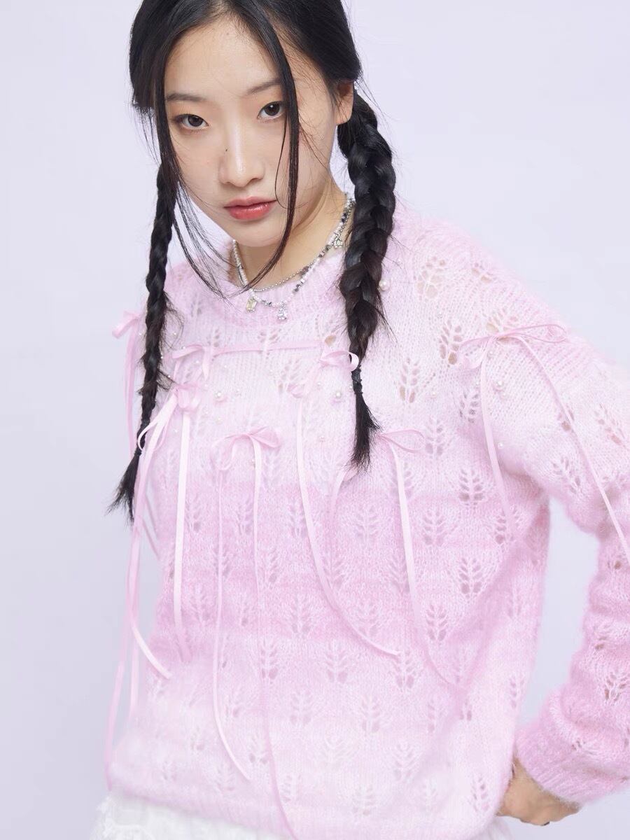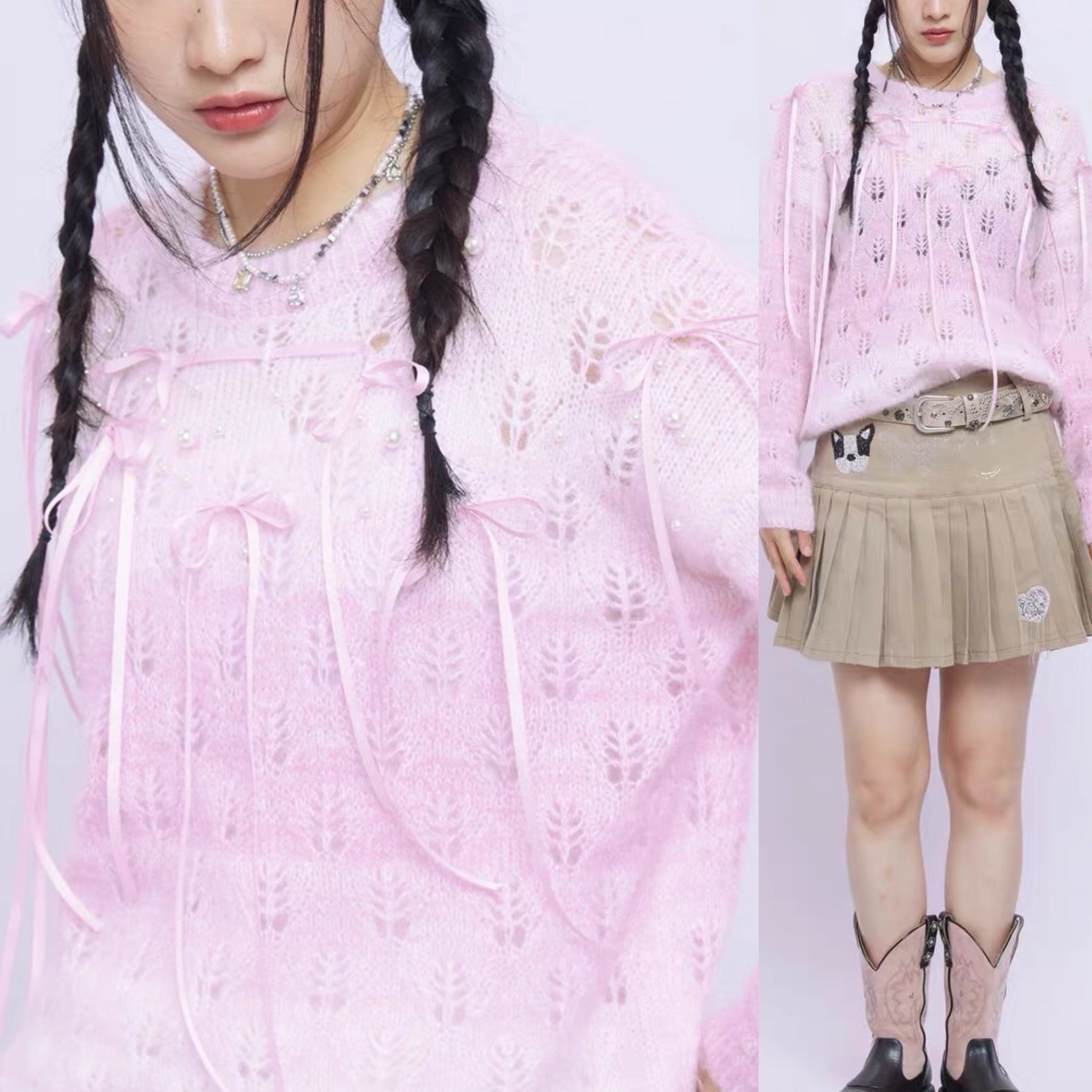 セーター ニット 可愛い パール デコレーション リボン ピンク