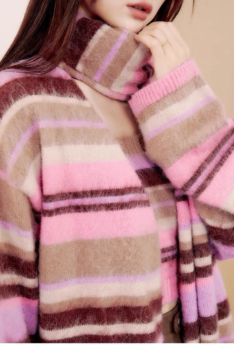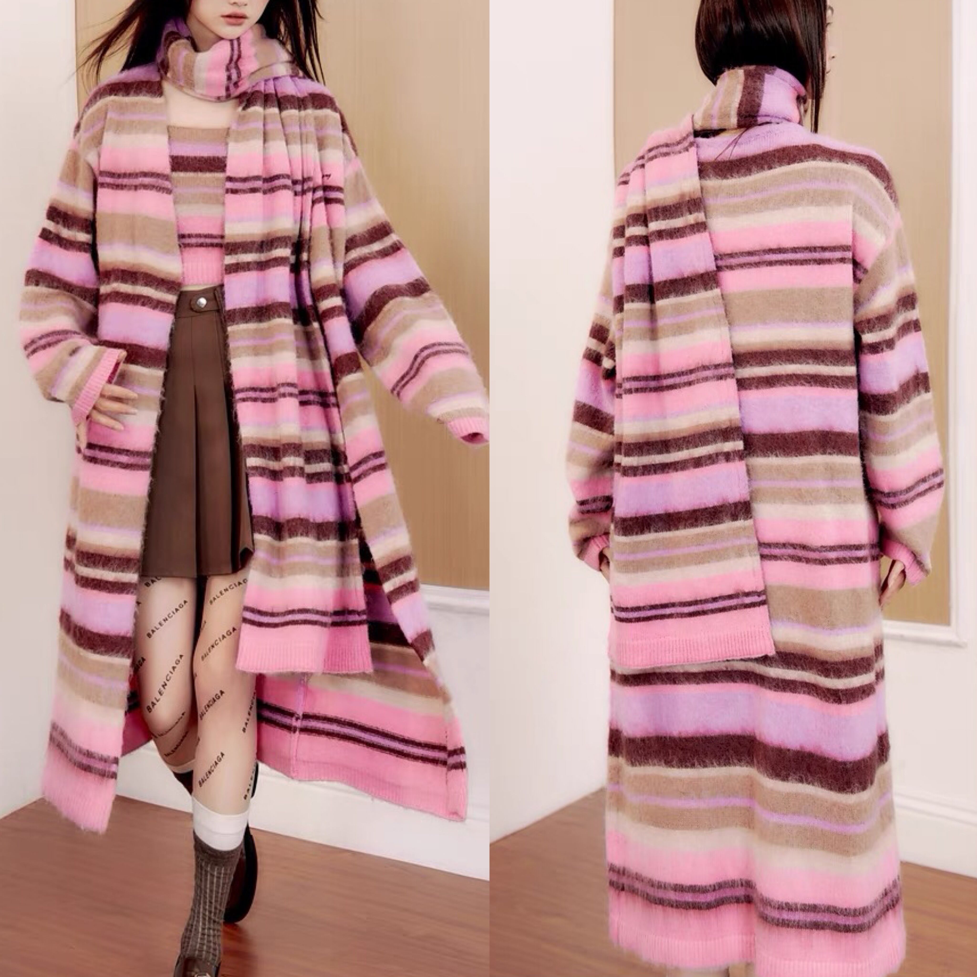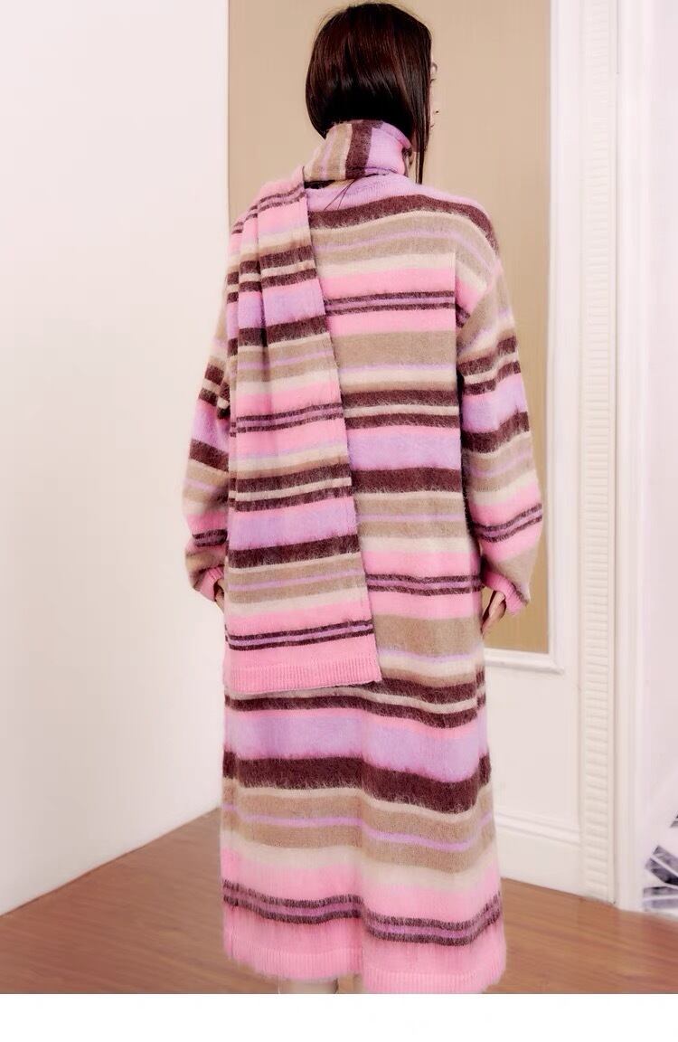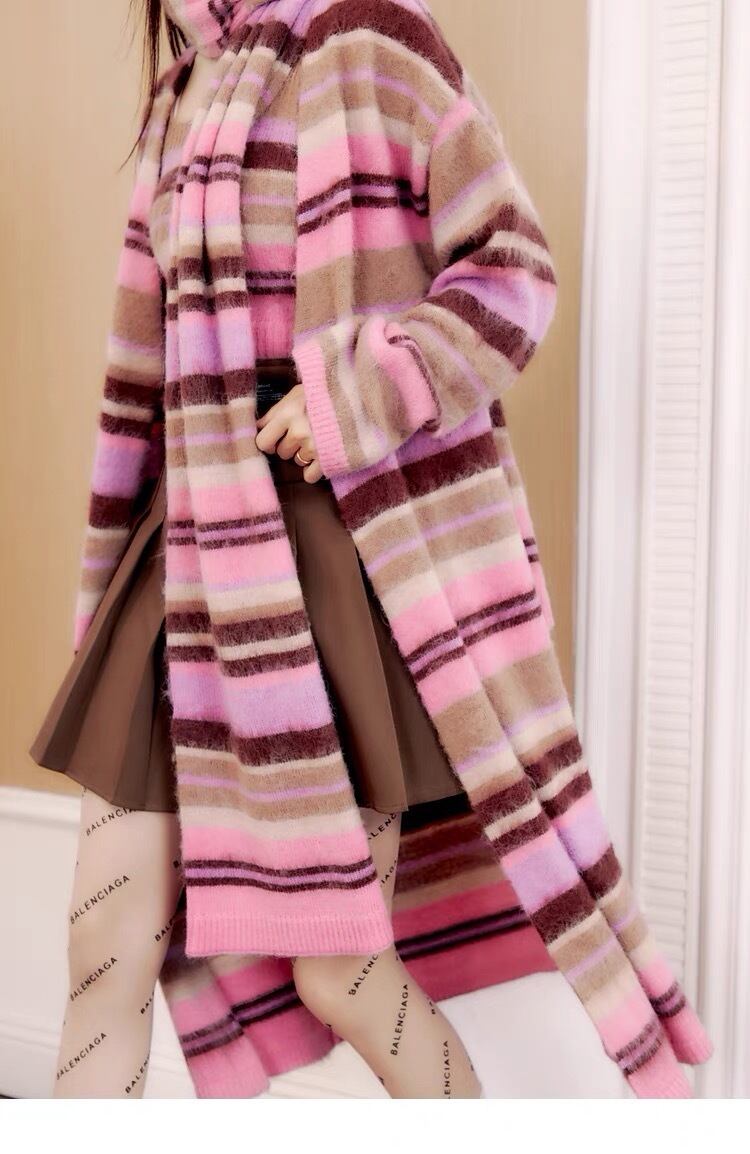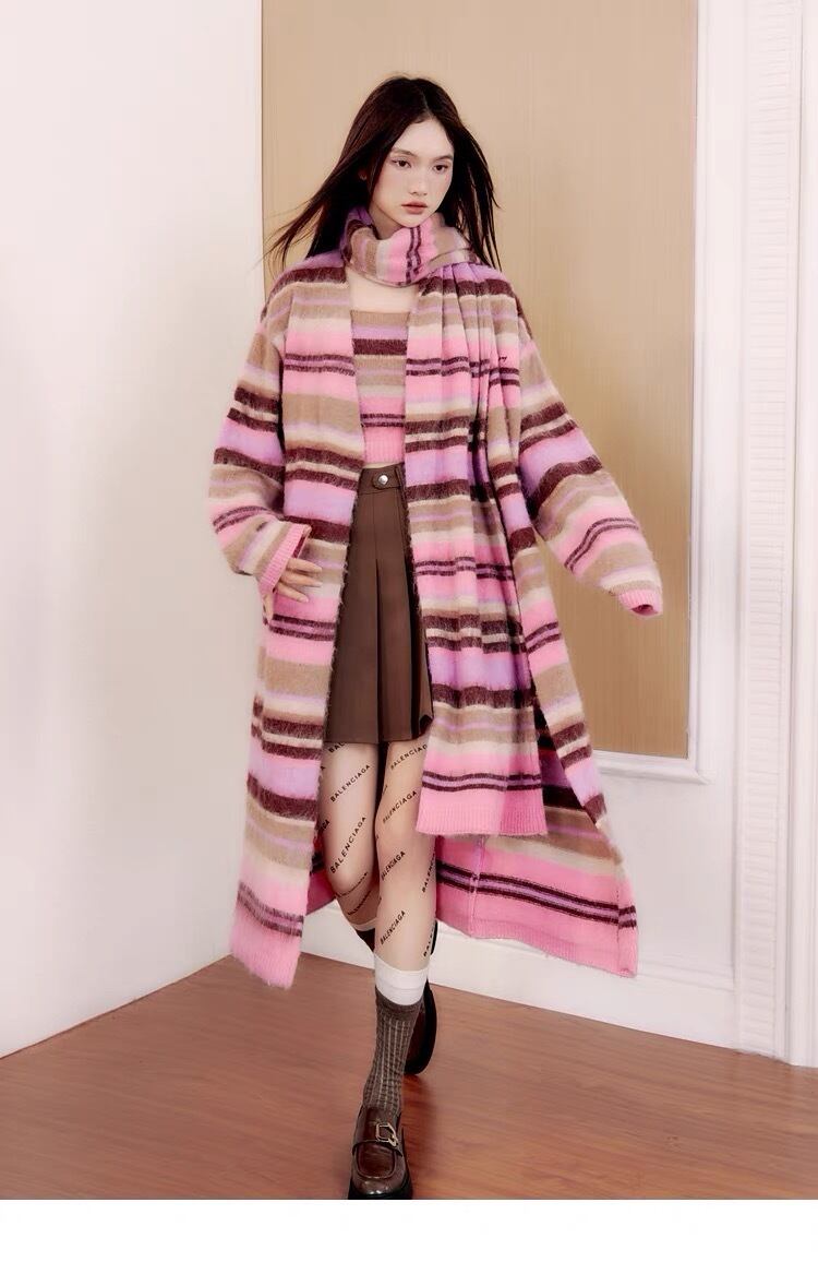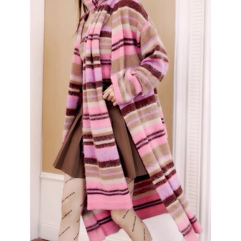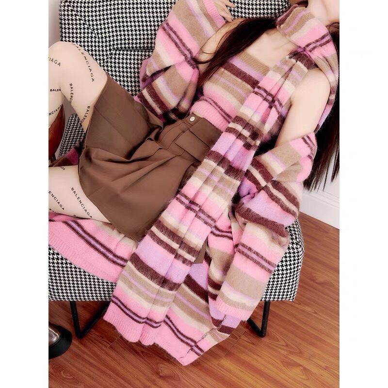 【カーディガン】ピンク チェック ボーダー ロング セーター