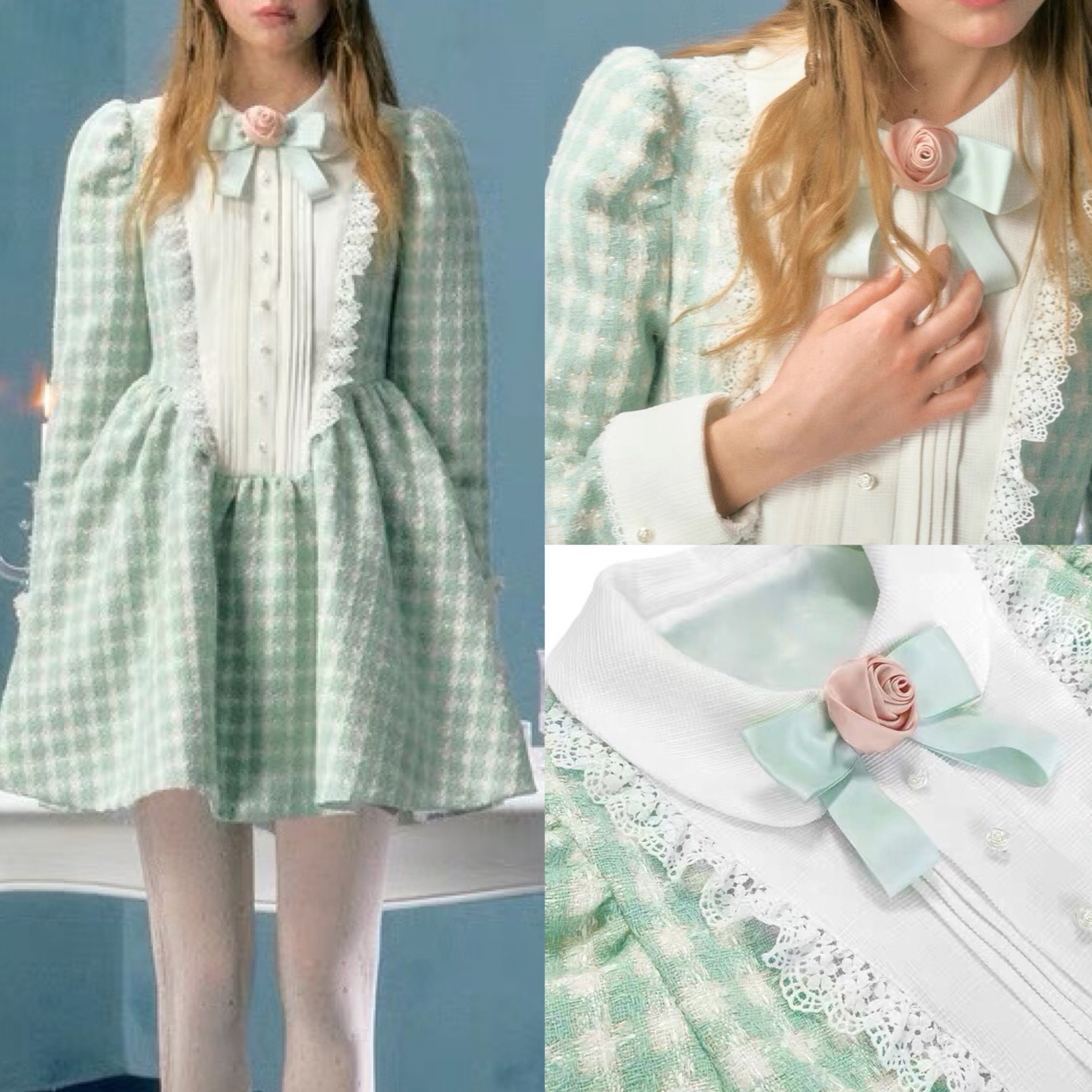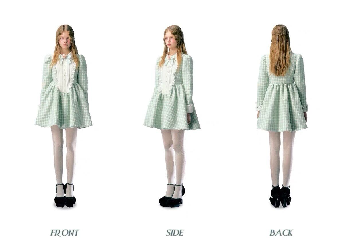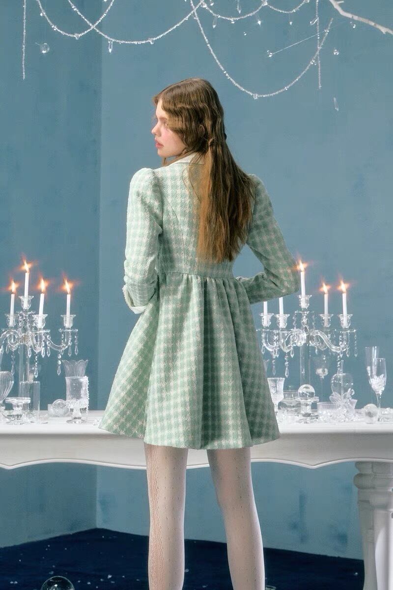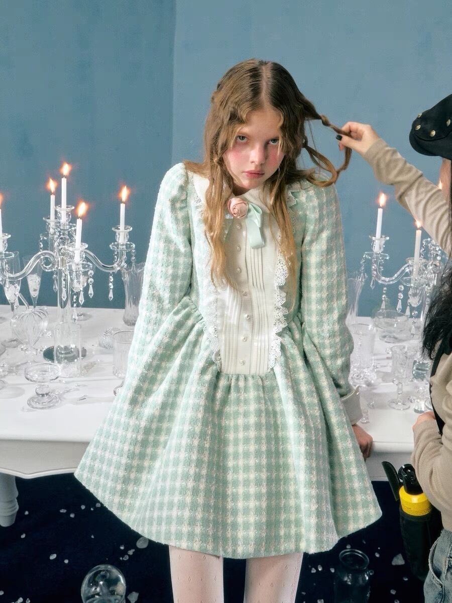 緑 チェック ワンピース 丸襟 ガーリー リボン