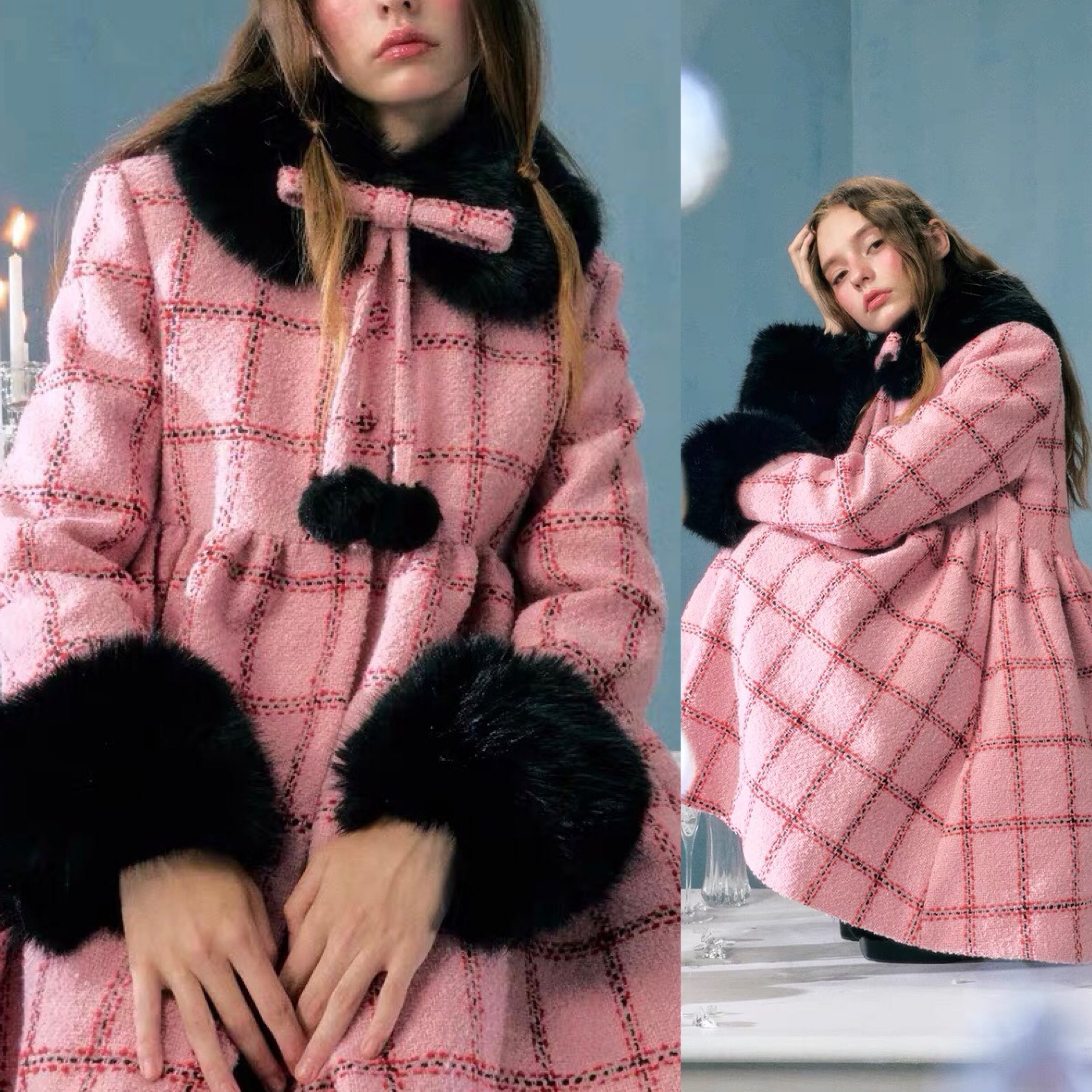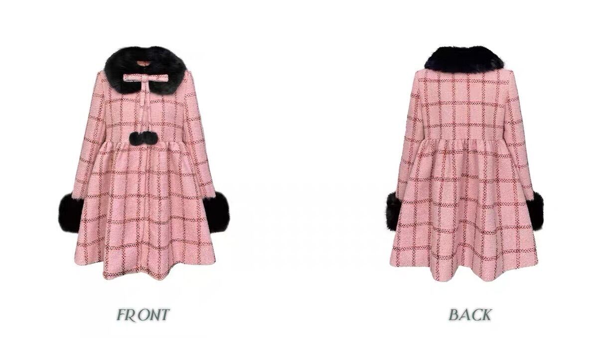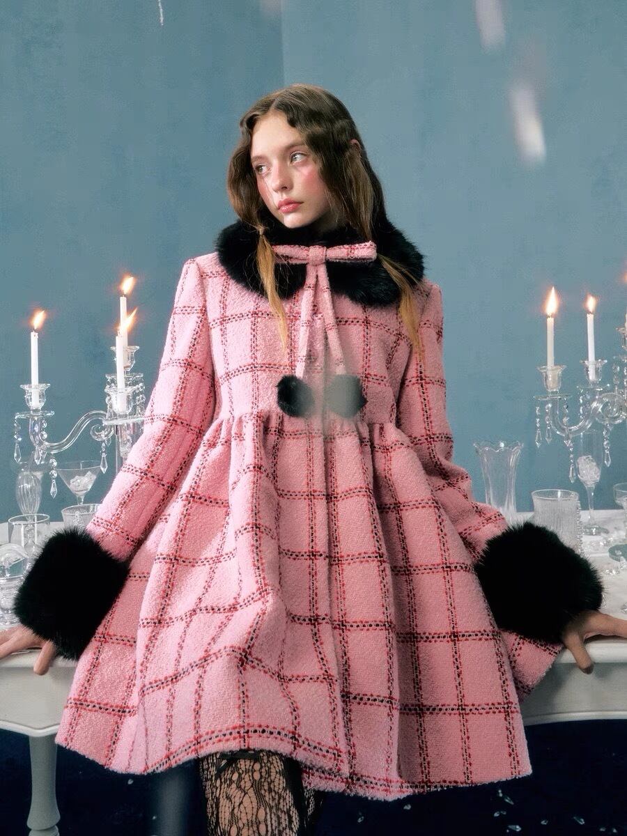 【ファー取り外し可能】ピンク 黒 ファー リボン チェック コート ワンピース アウター