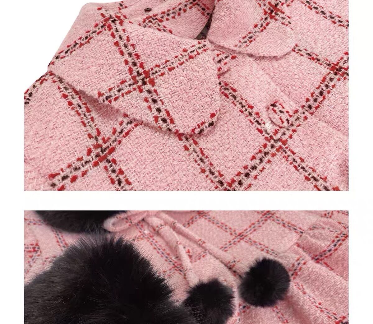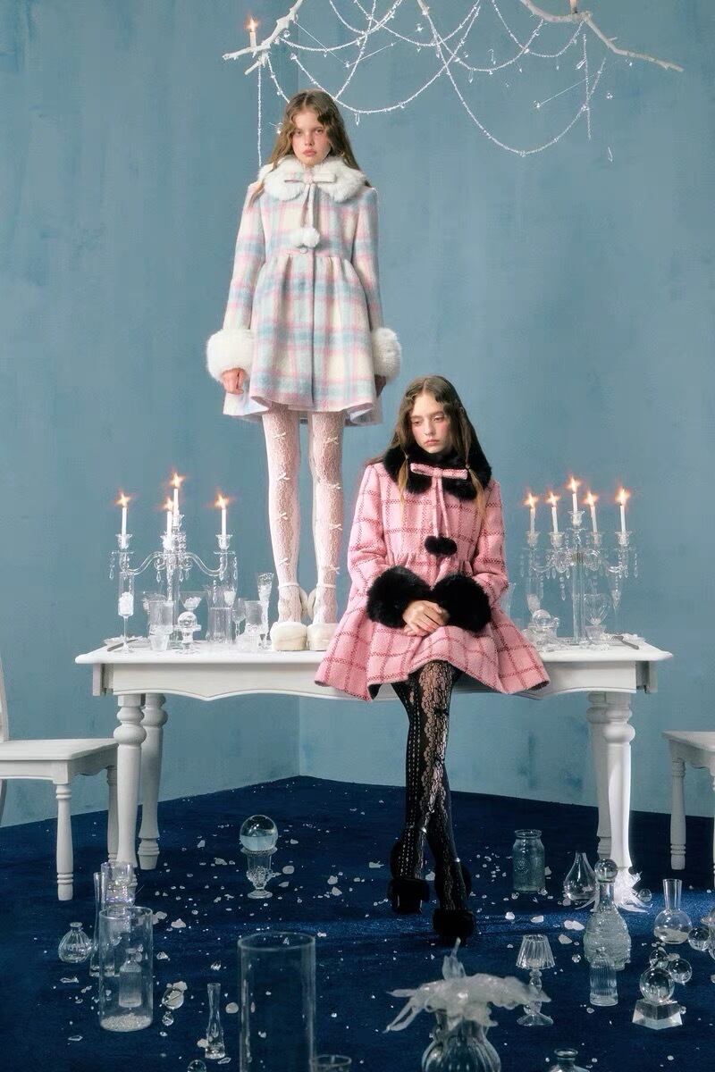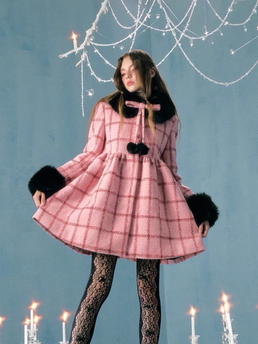 【ファー取り外し可能】ピンク 黒 ファー リボン チェック コート ワンピース アウター