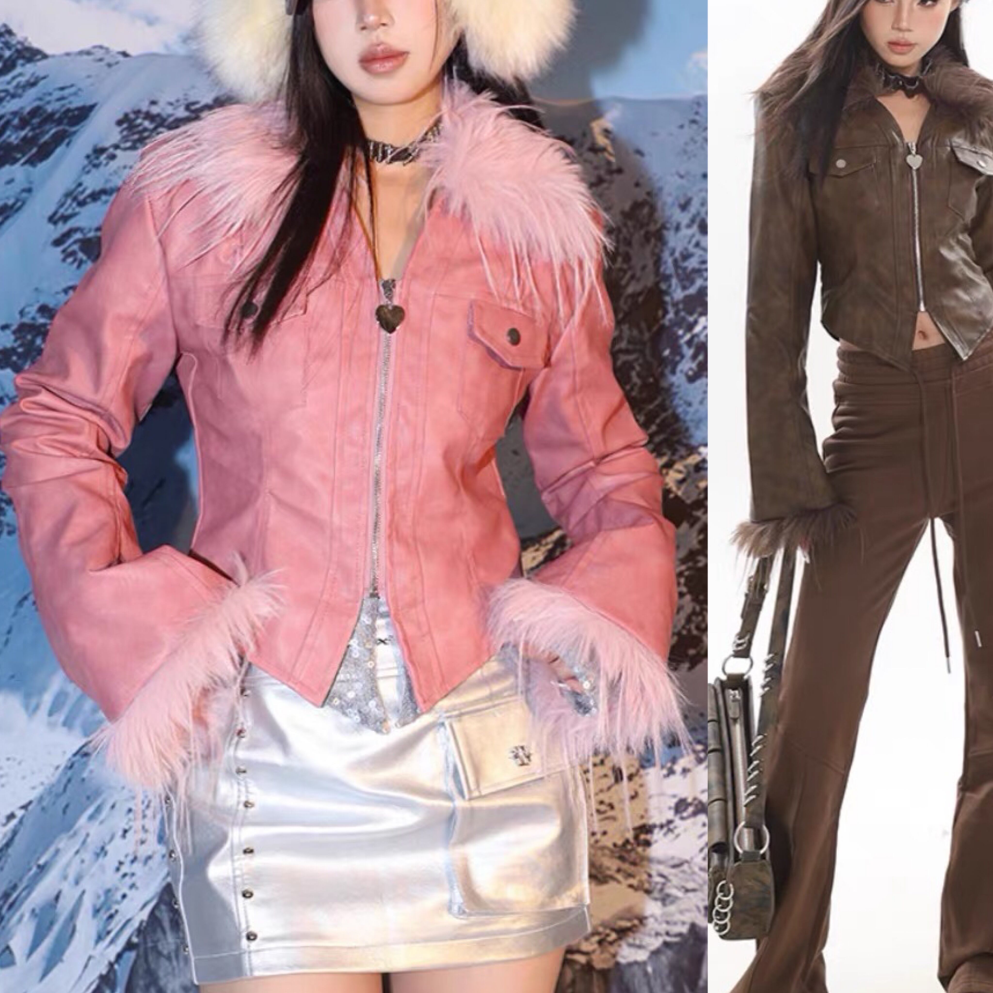 ジャケット 茶色 ピンク ファー レザー ライダース アウター