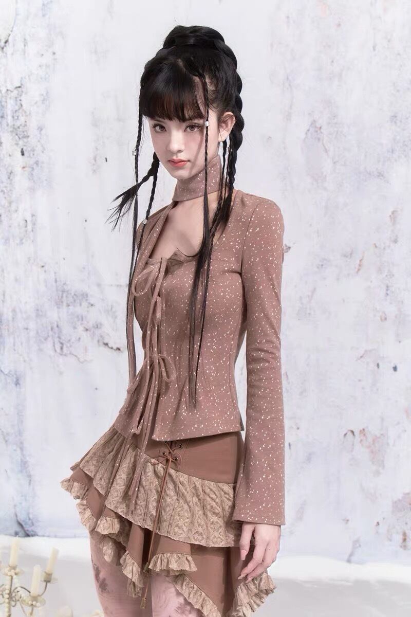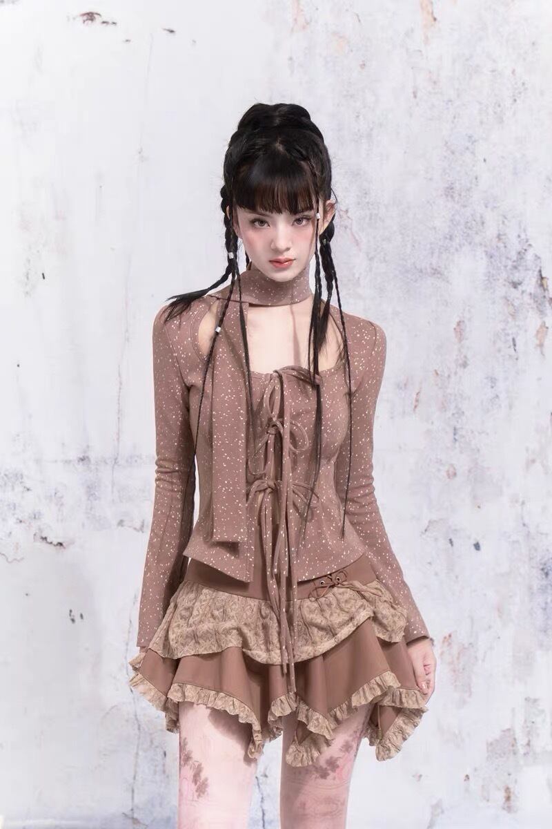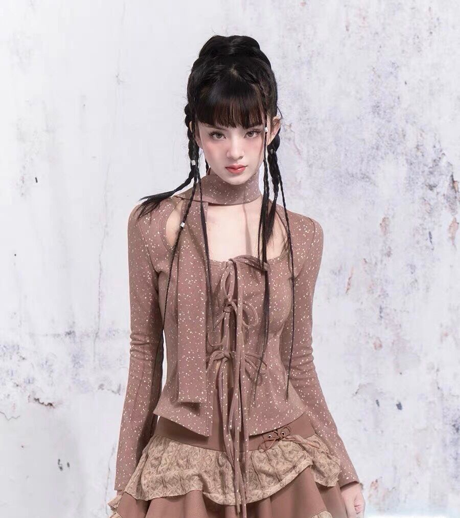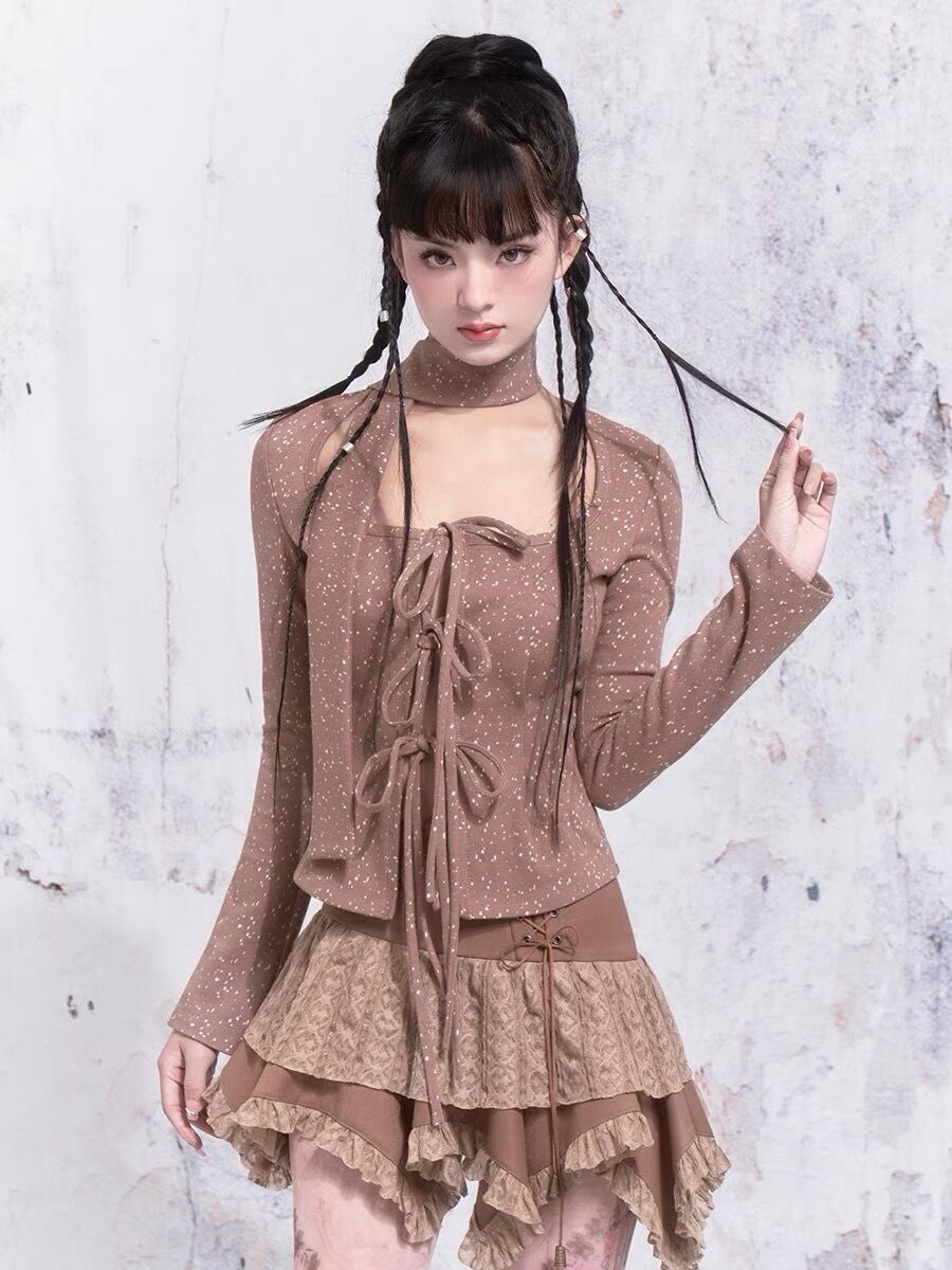 ブラウス トップス 茶色 ベージュ リボン シャツ