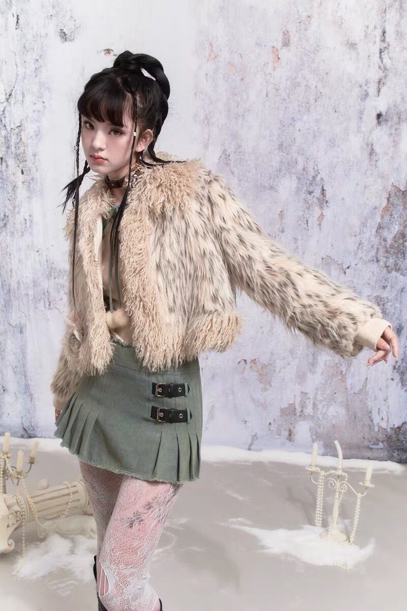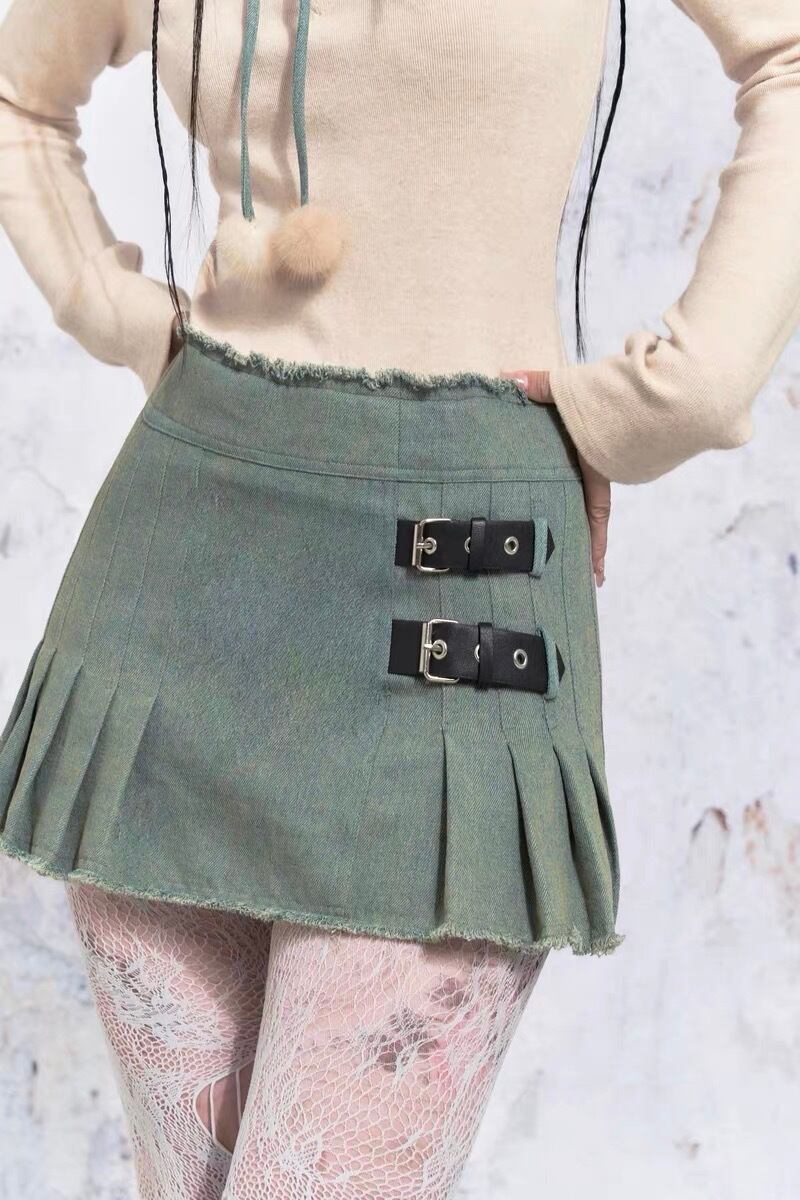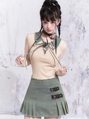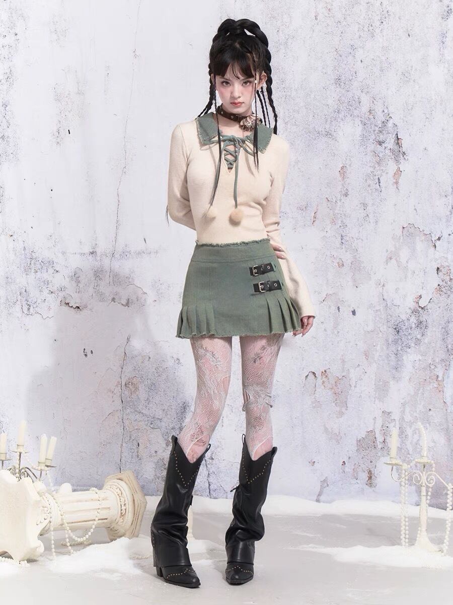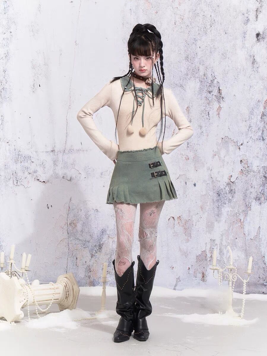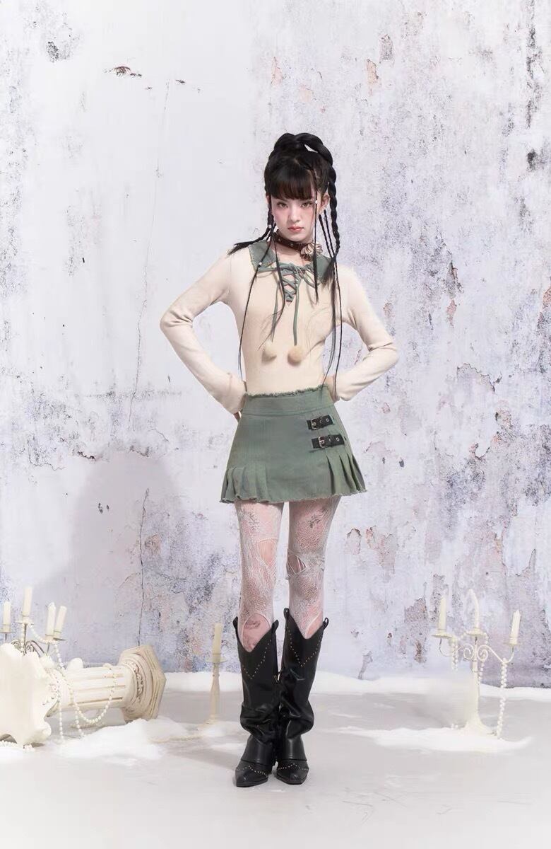 ワンピース ベージュ 緑 ガーリー ミニスカート ニット