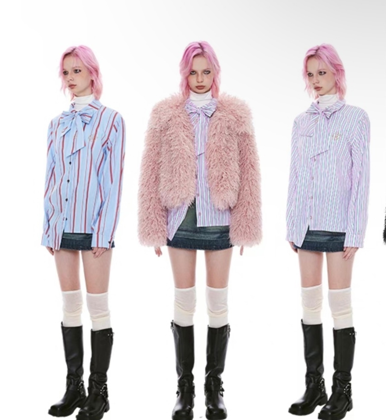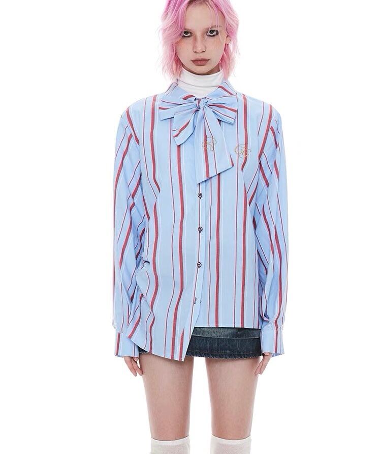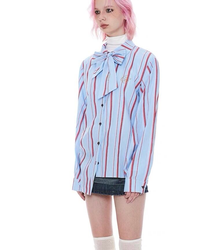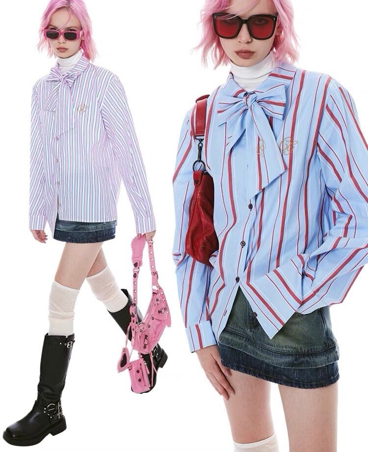 ブラウス チェック ボーダー 水色 ピンク トップス リボン