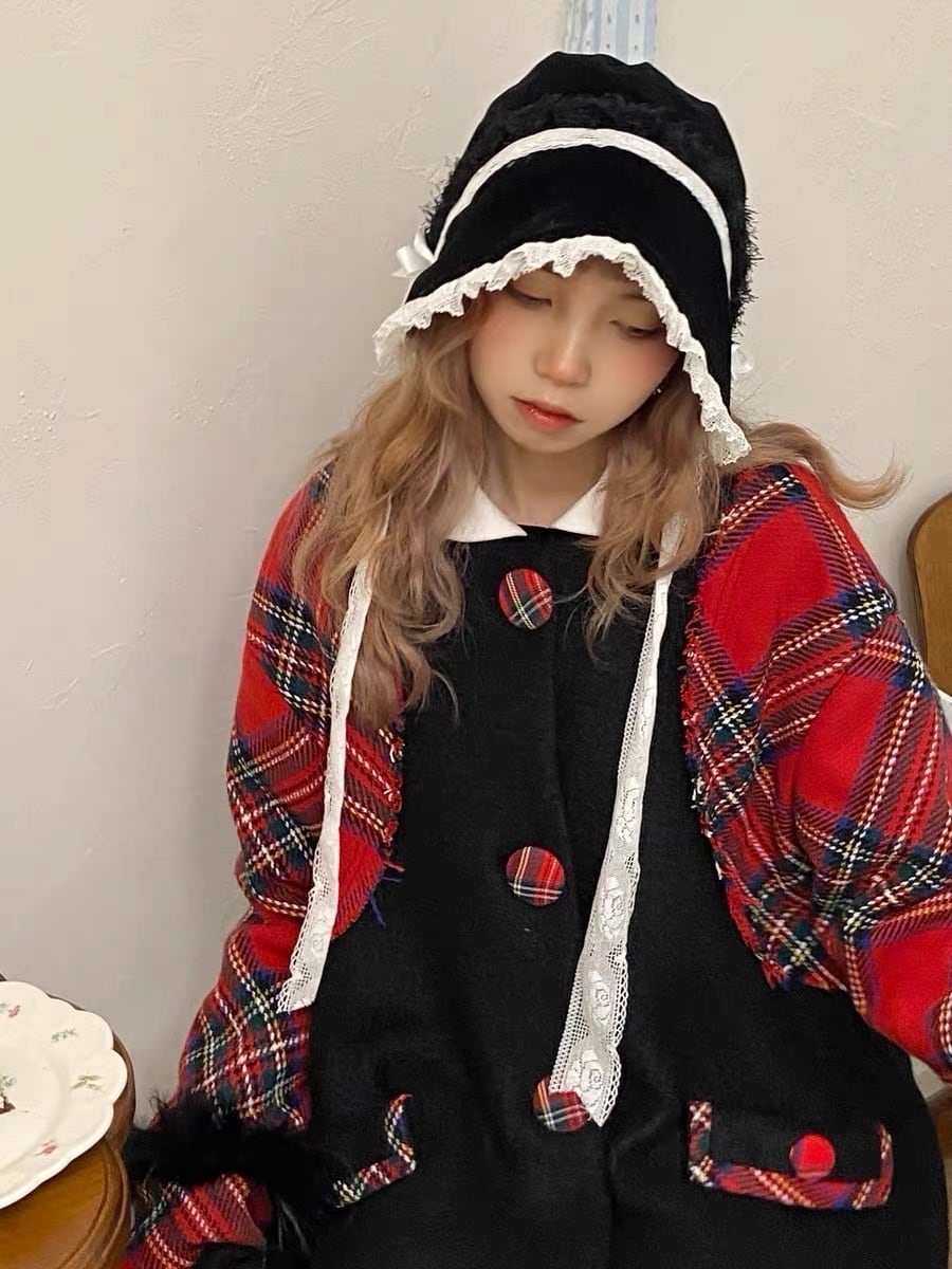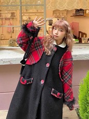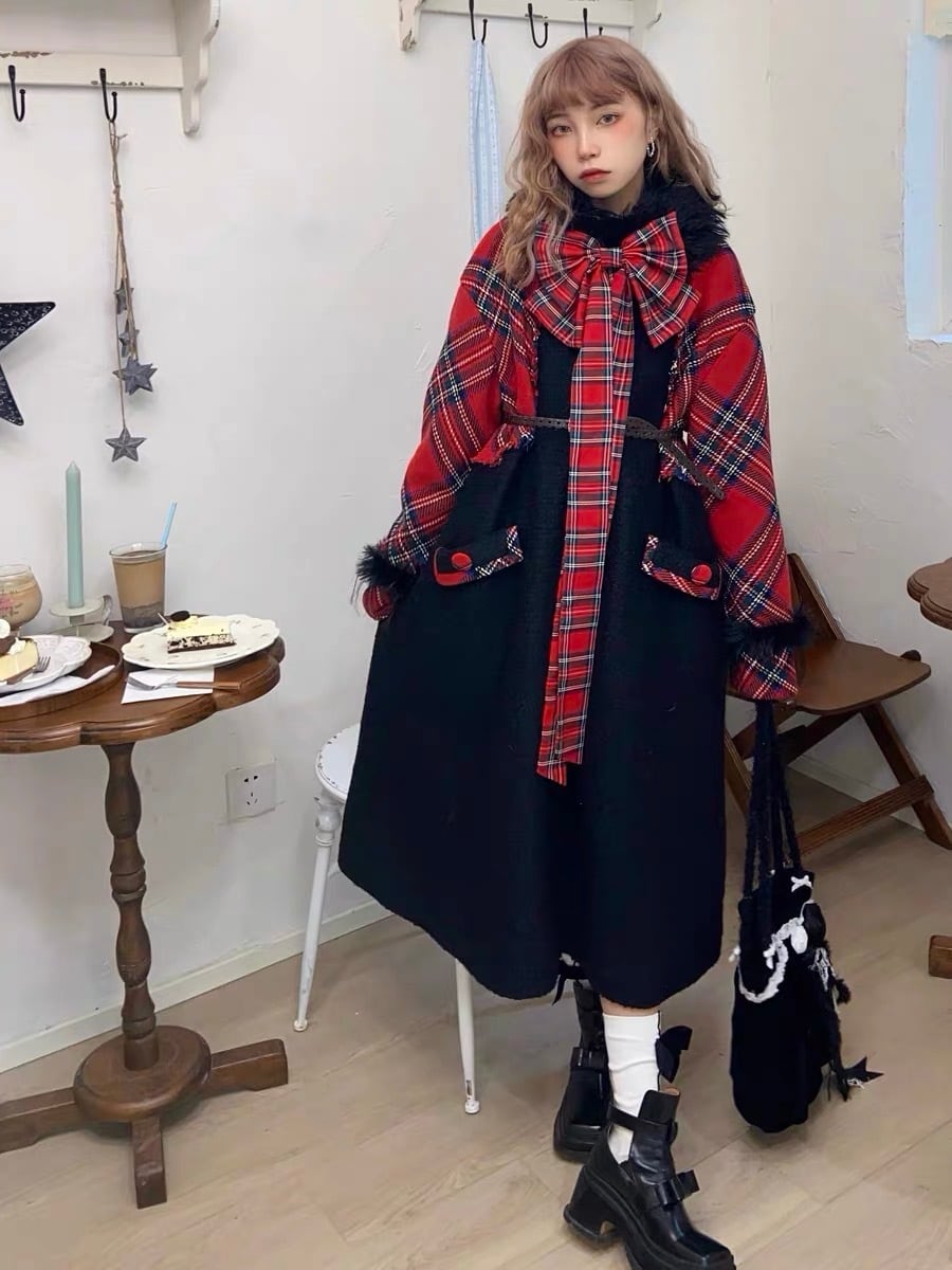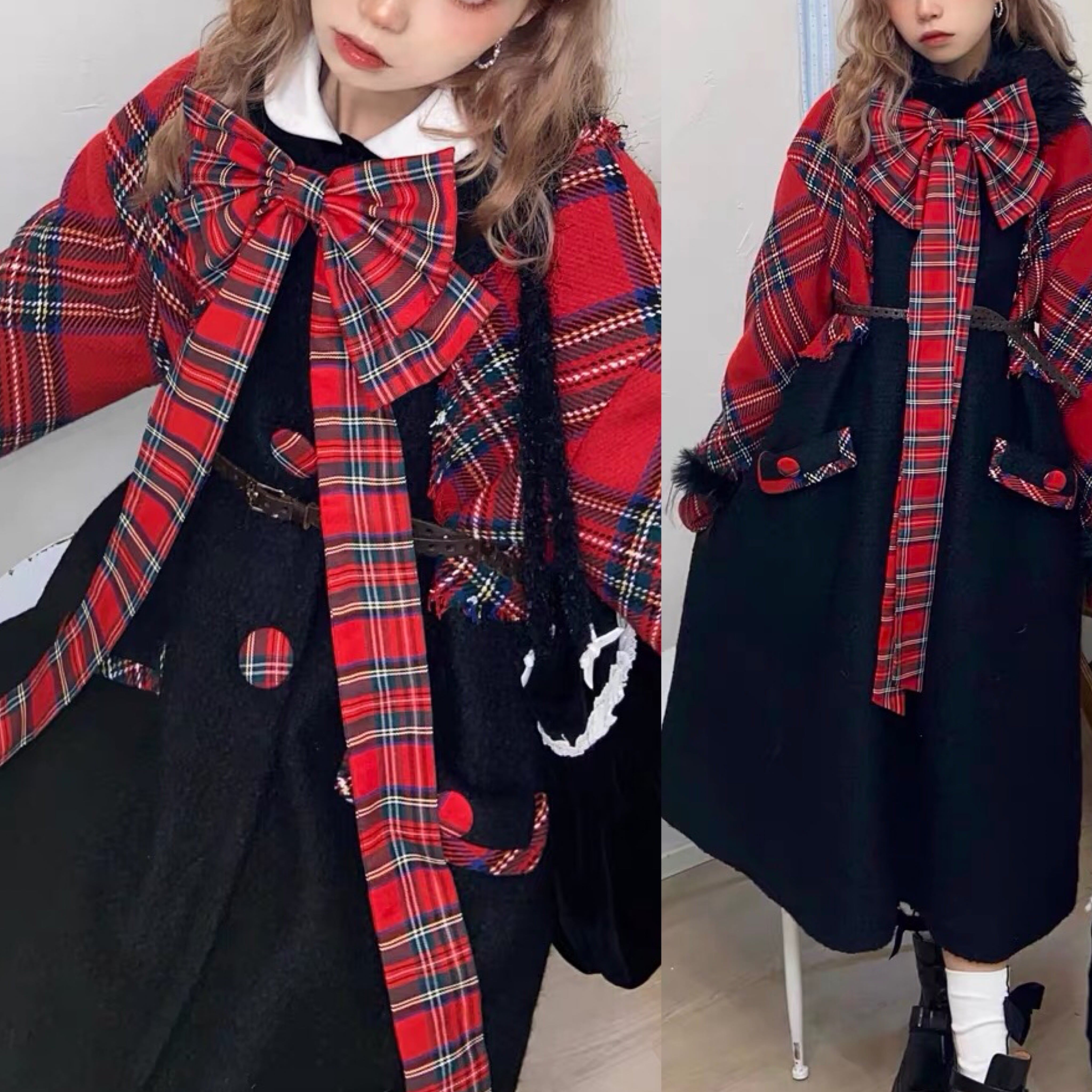 【リボン取り外し可能】コート アウター 黒 赤 チェック ワンピース 可愛い