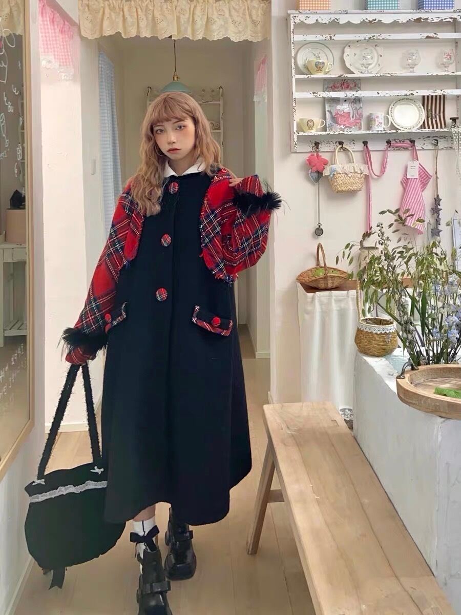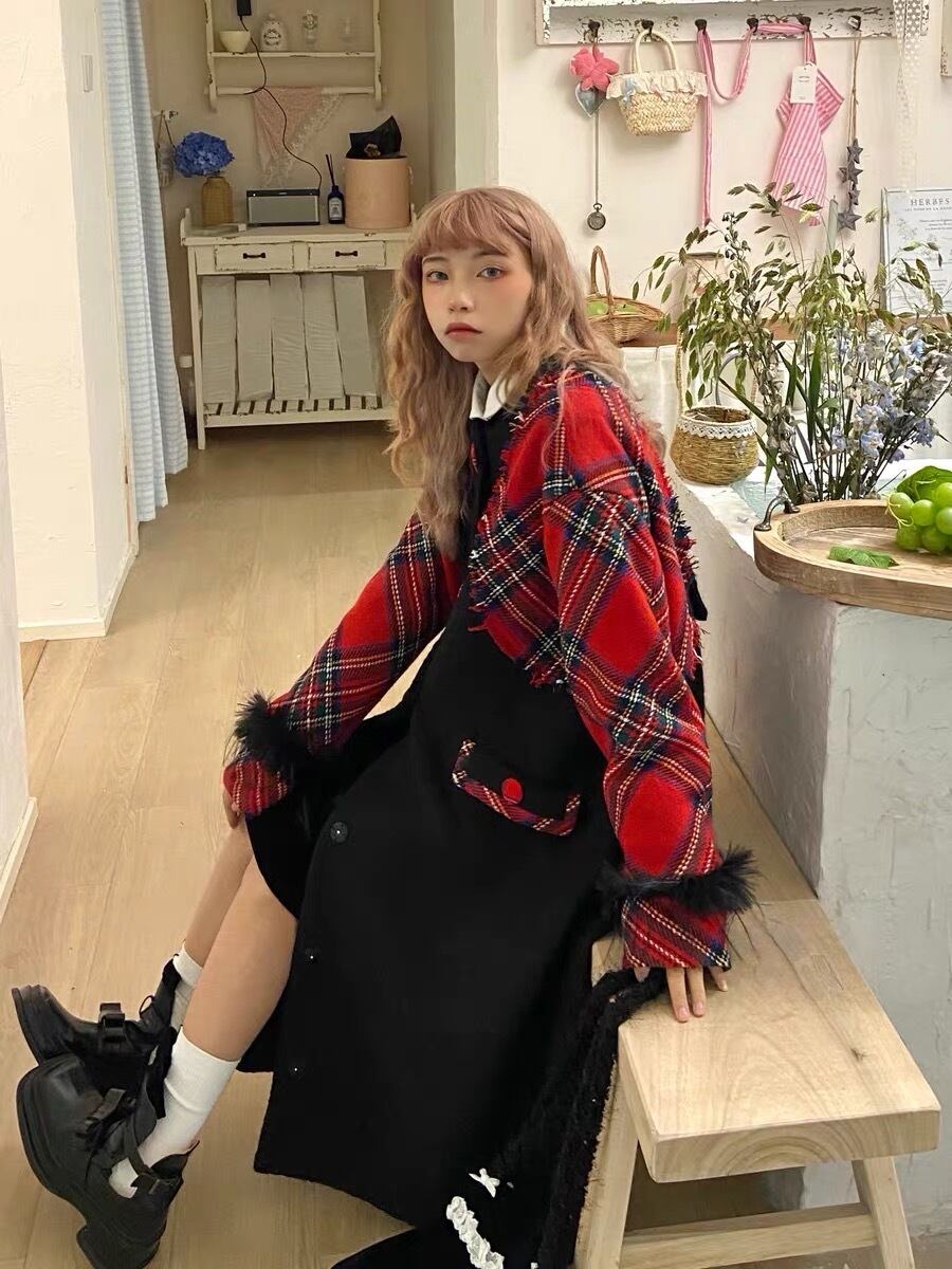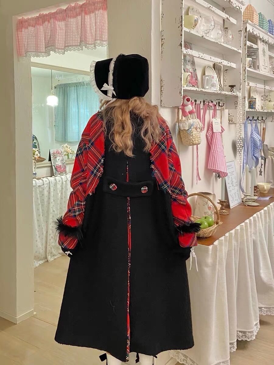【リボン取り外し可能】コート アウター 黒 赤 チェック ワンピース 可愛い
