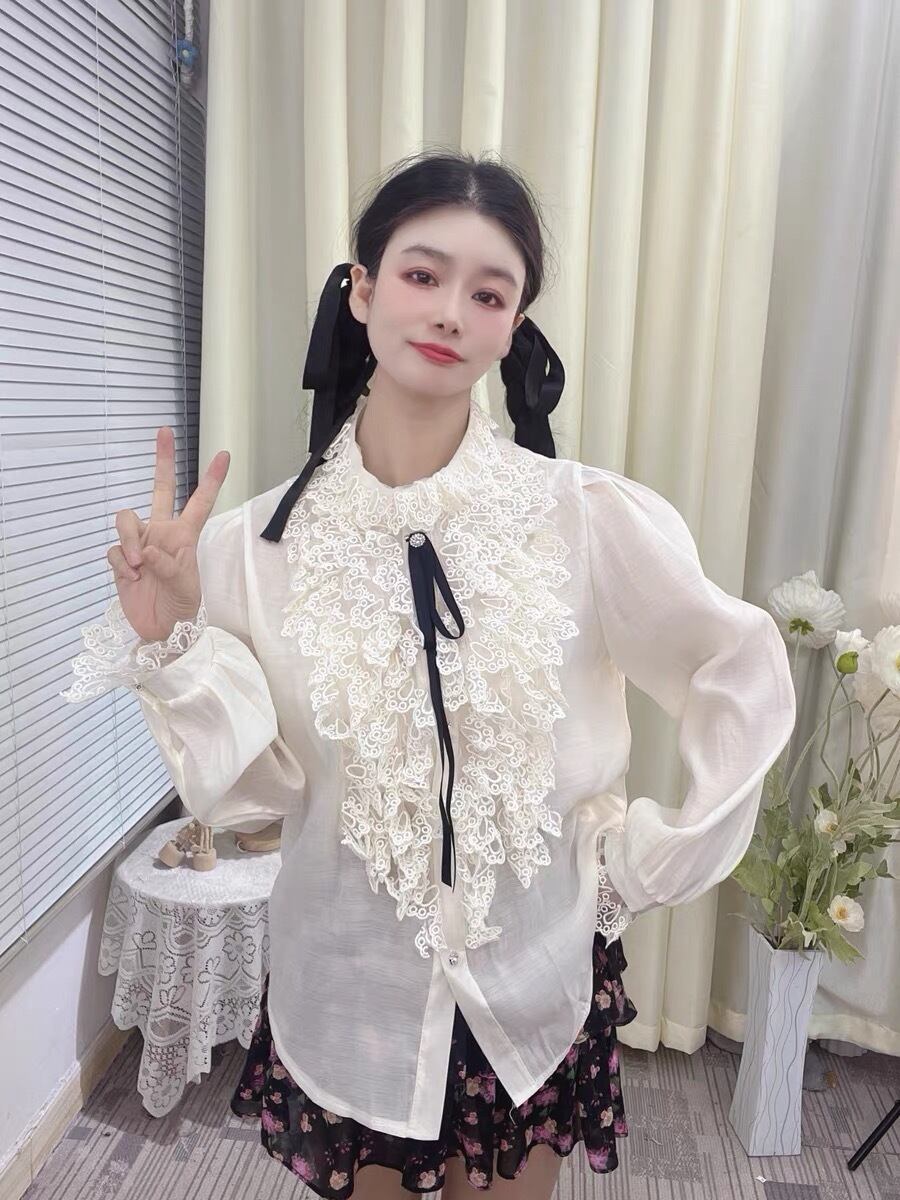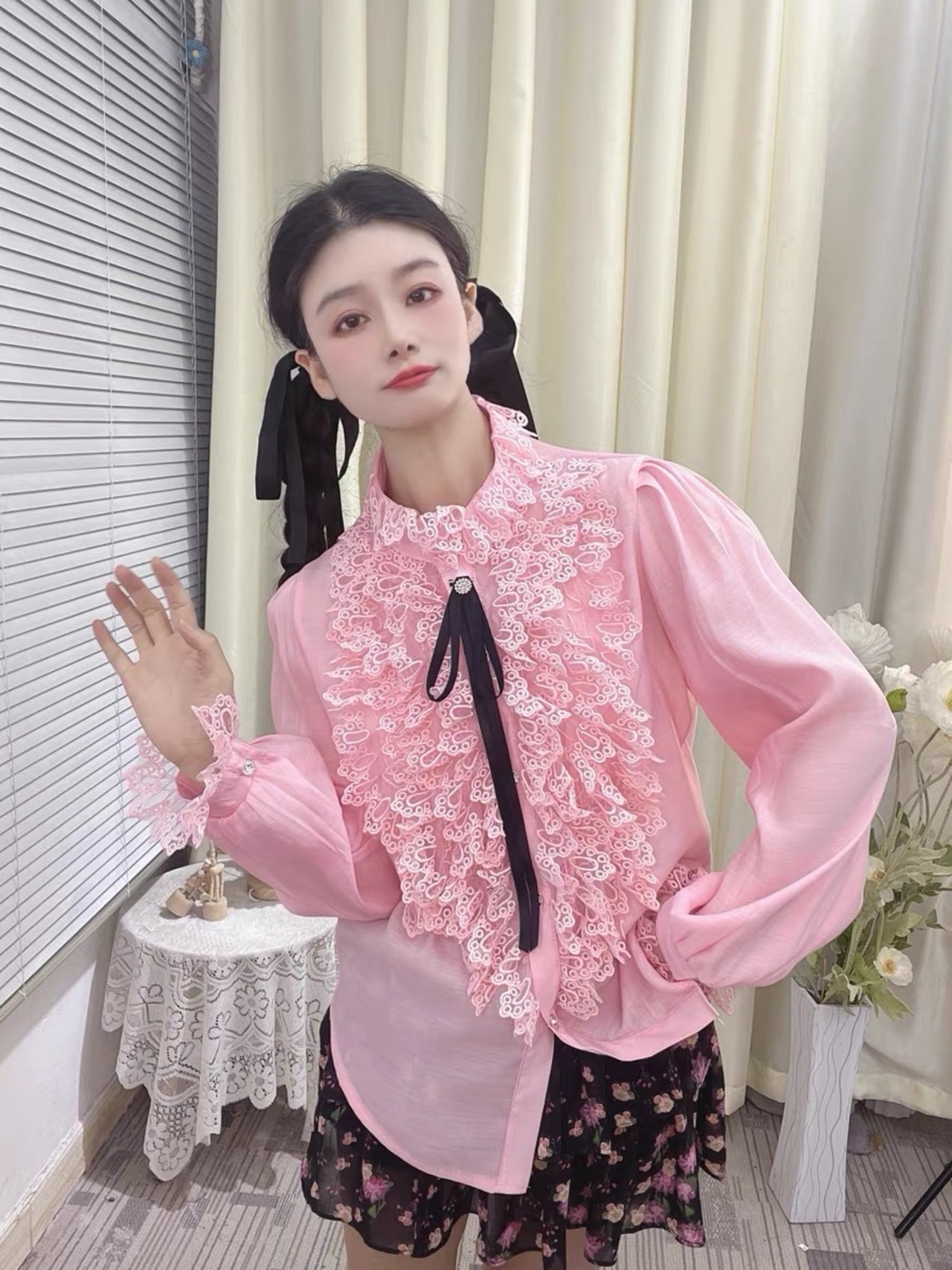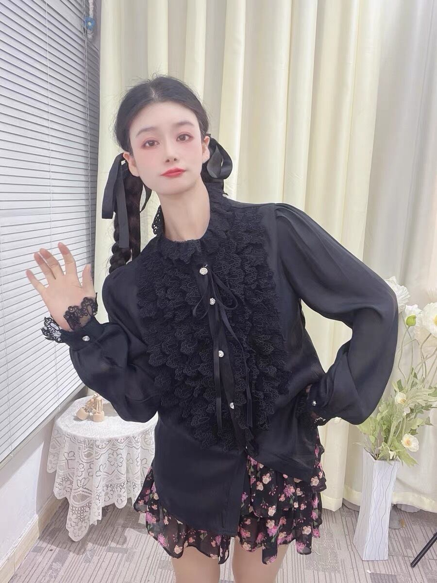 【4カラー】ブラウス 黒 ピンク 白 フリル リボン ガーリー 可愛い