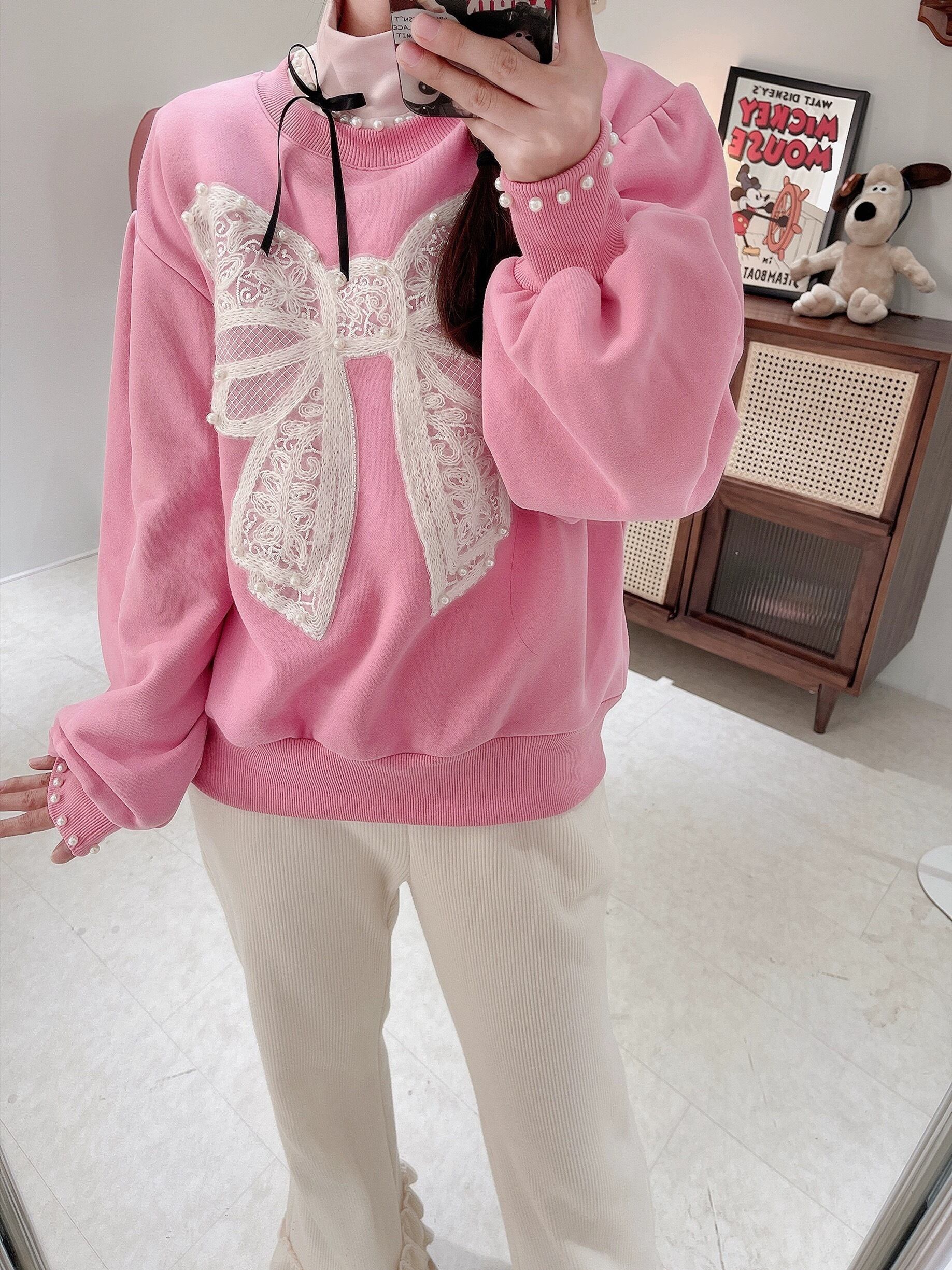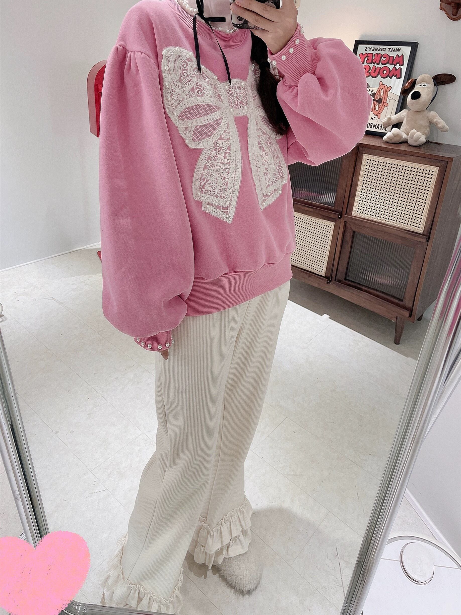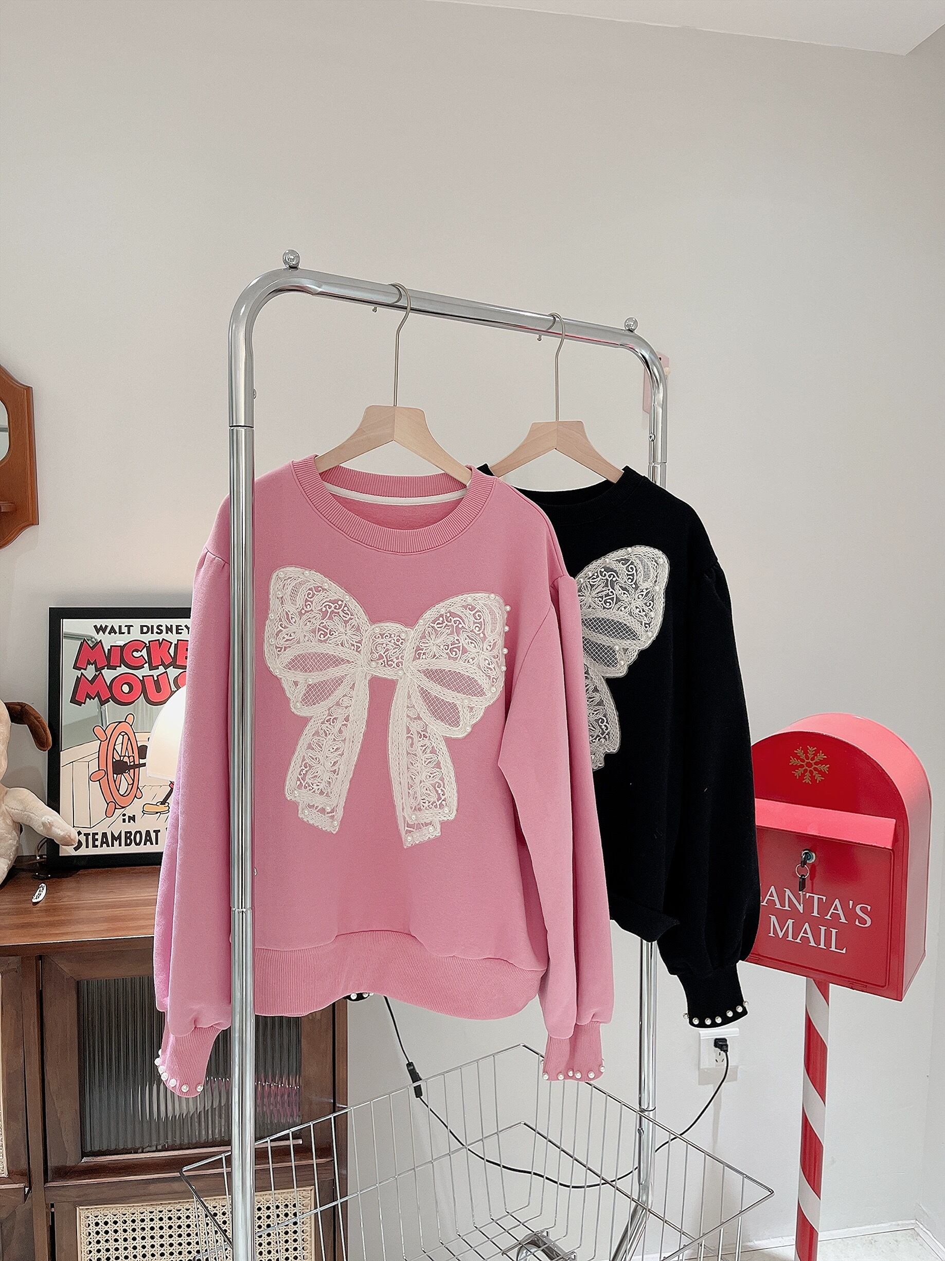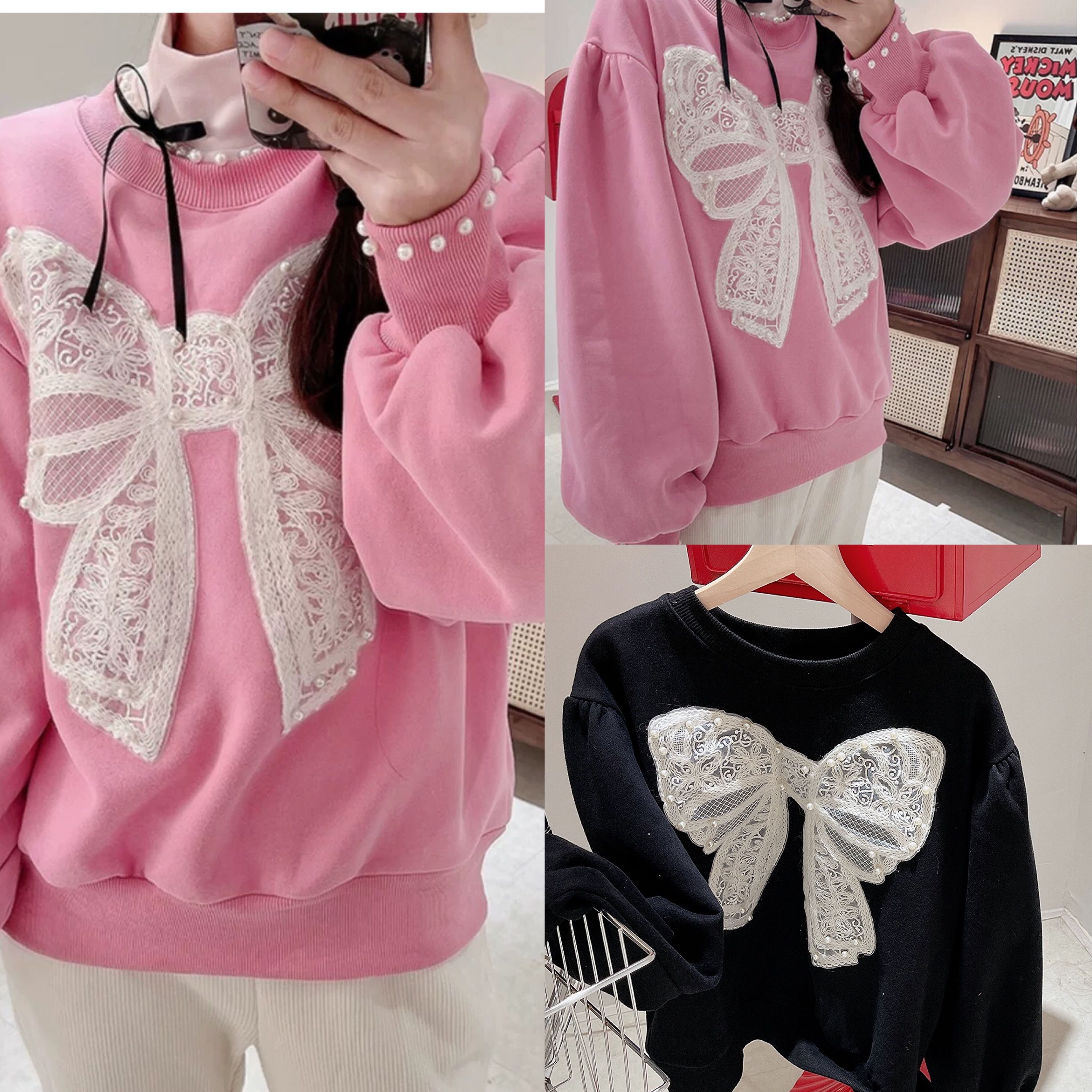トレーナー スウェット 黒 ピンク リボン ガーリー