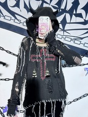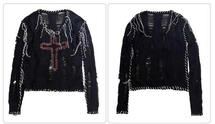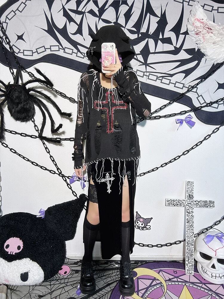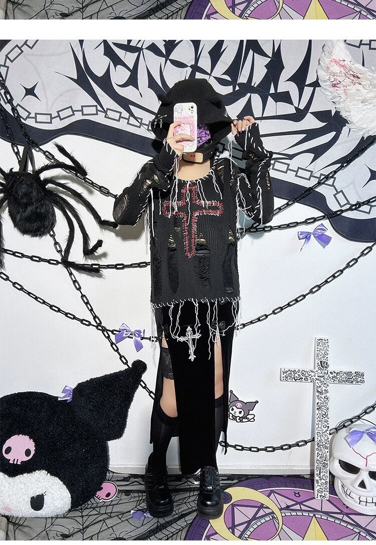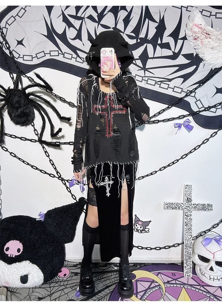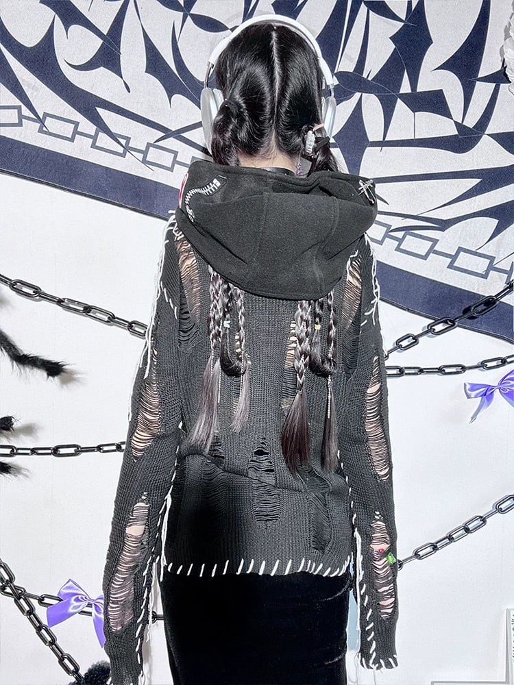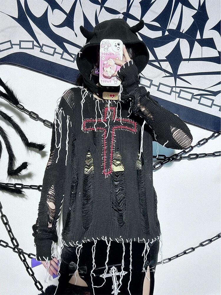セーター ダメージ ニット グレー カーディガン クロス 穴あき