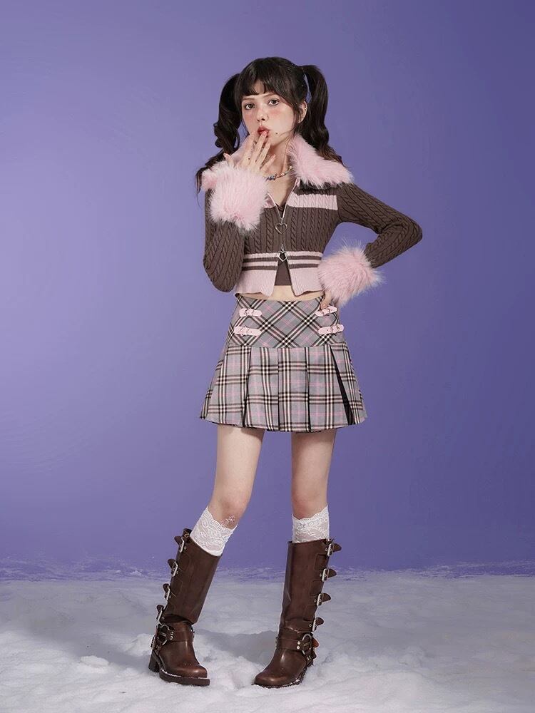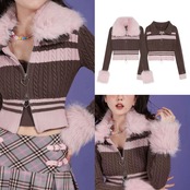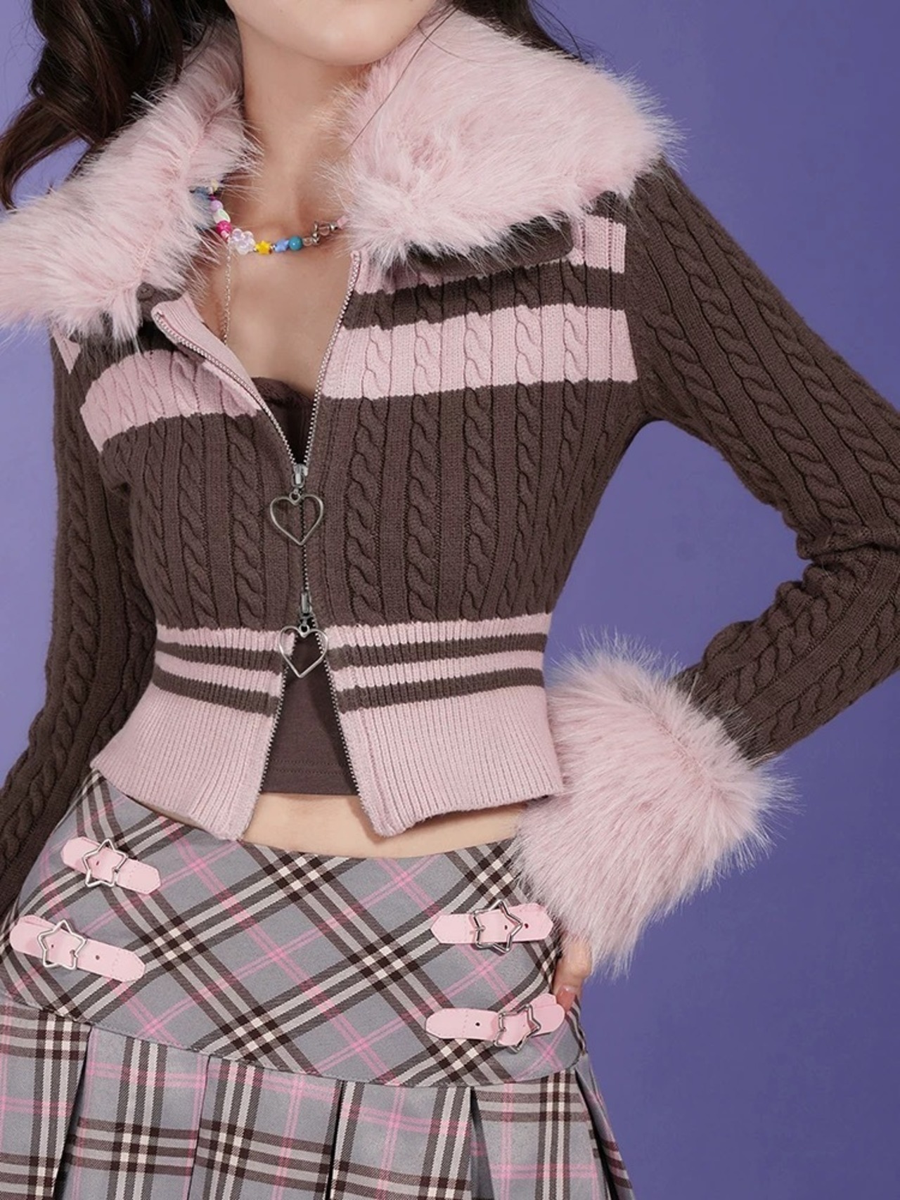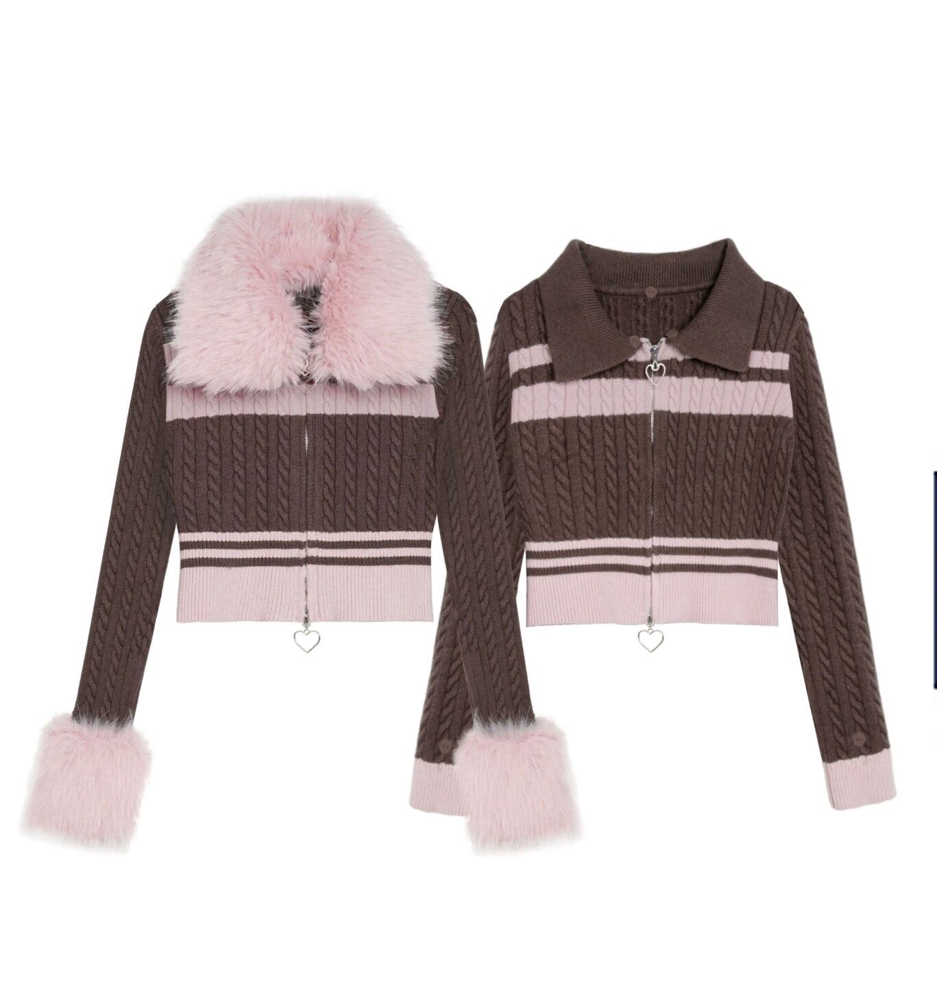 【ファー取り外し可能】カーディガン 茶色 ピンク ボーダー ファー アウター