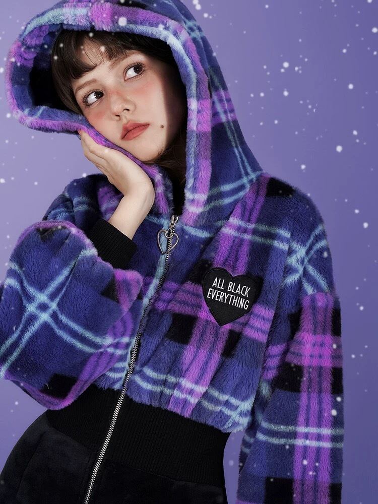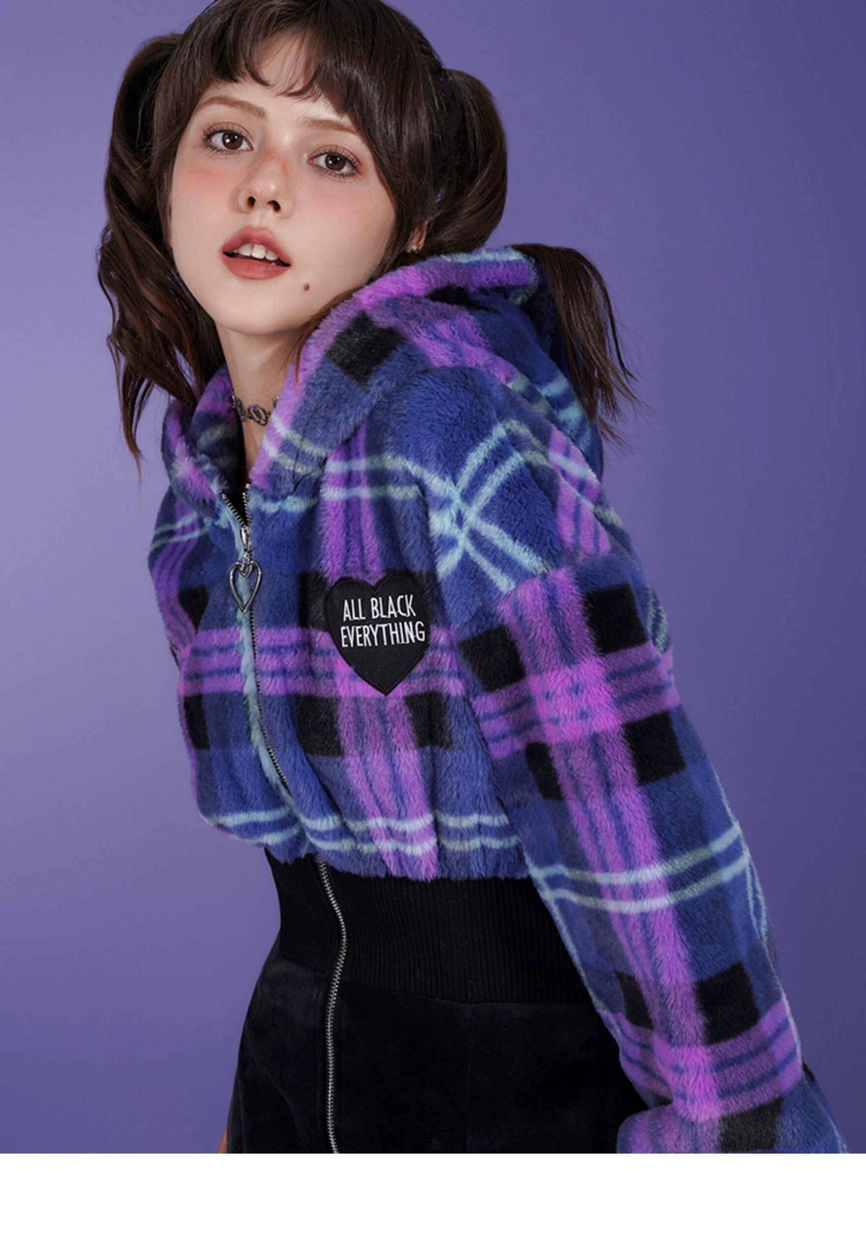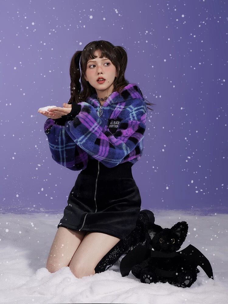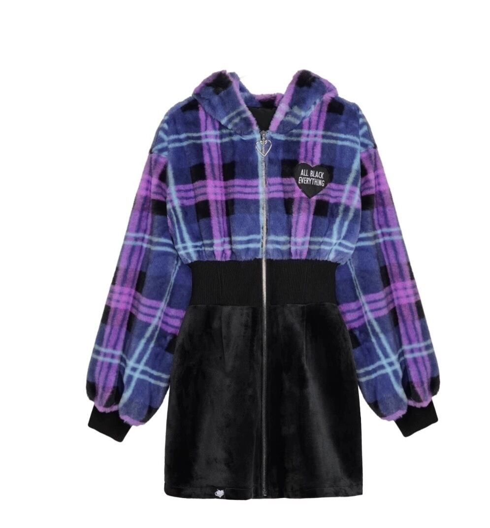 ワンピース 紫 チェック 黒 フリース ガーリー