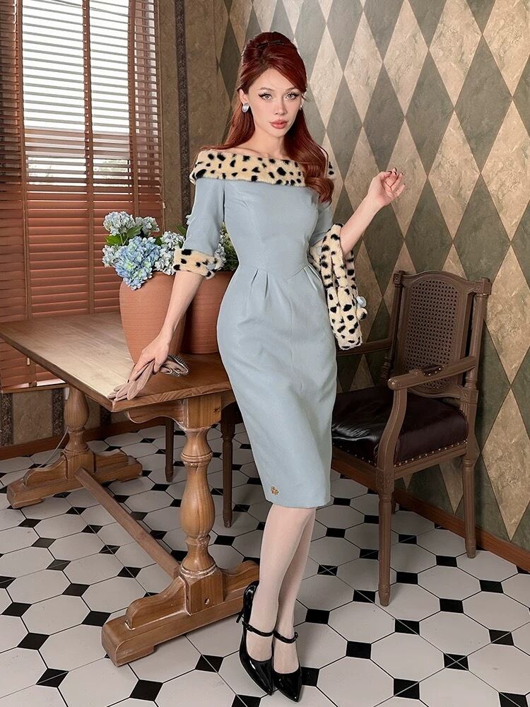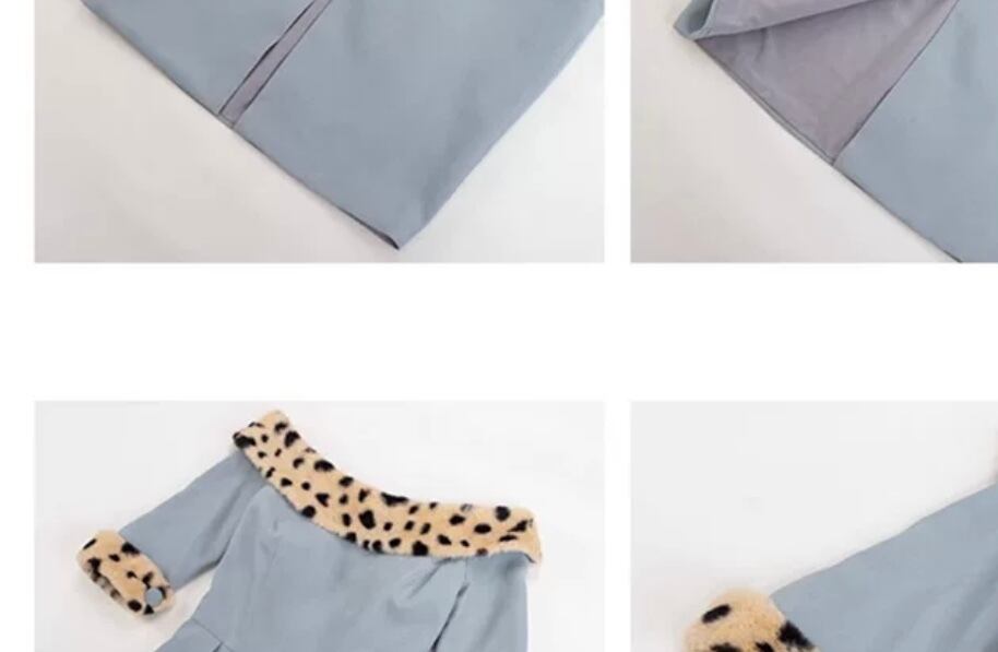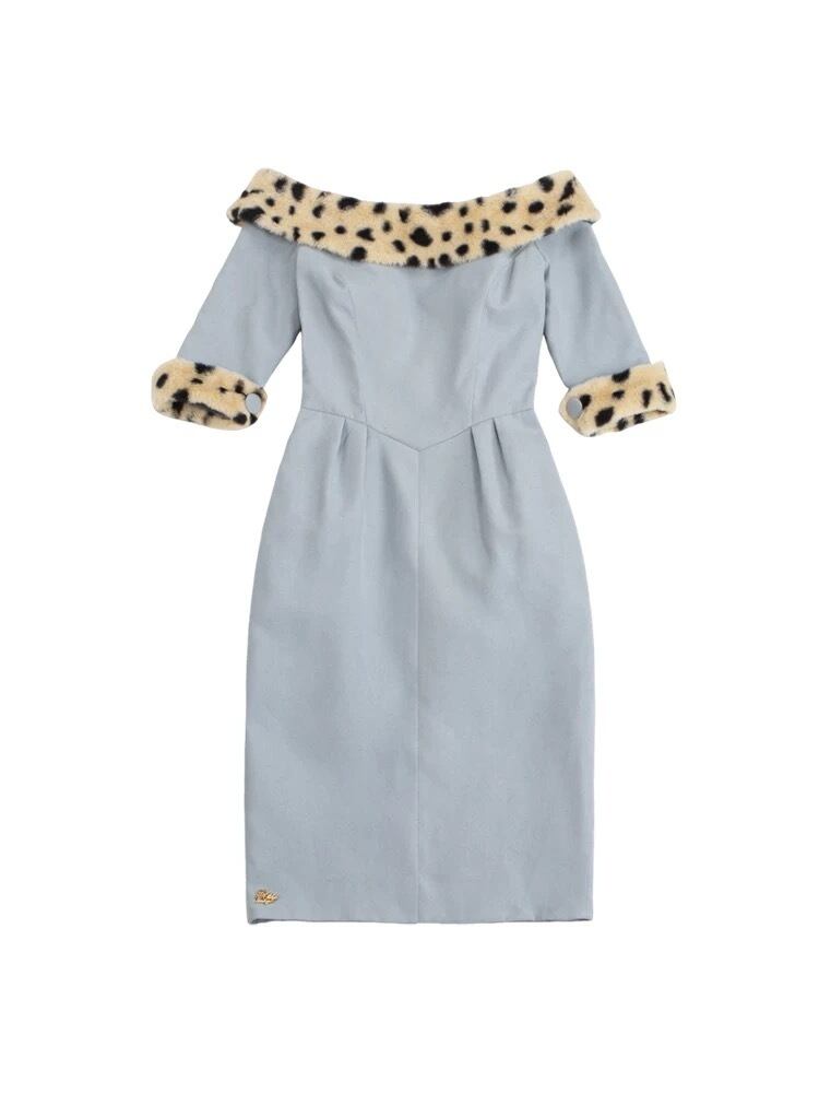 ワンピース 水色 ファー レオパード ベージュ ヒョウ柄