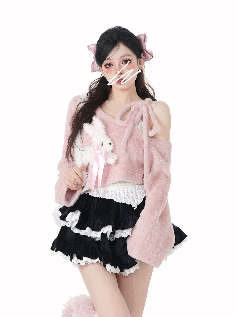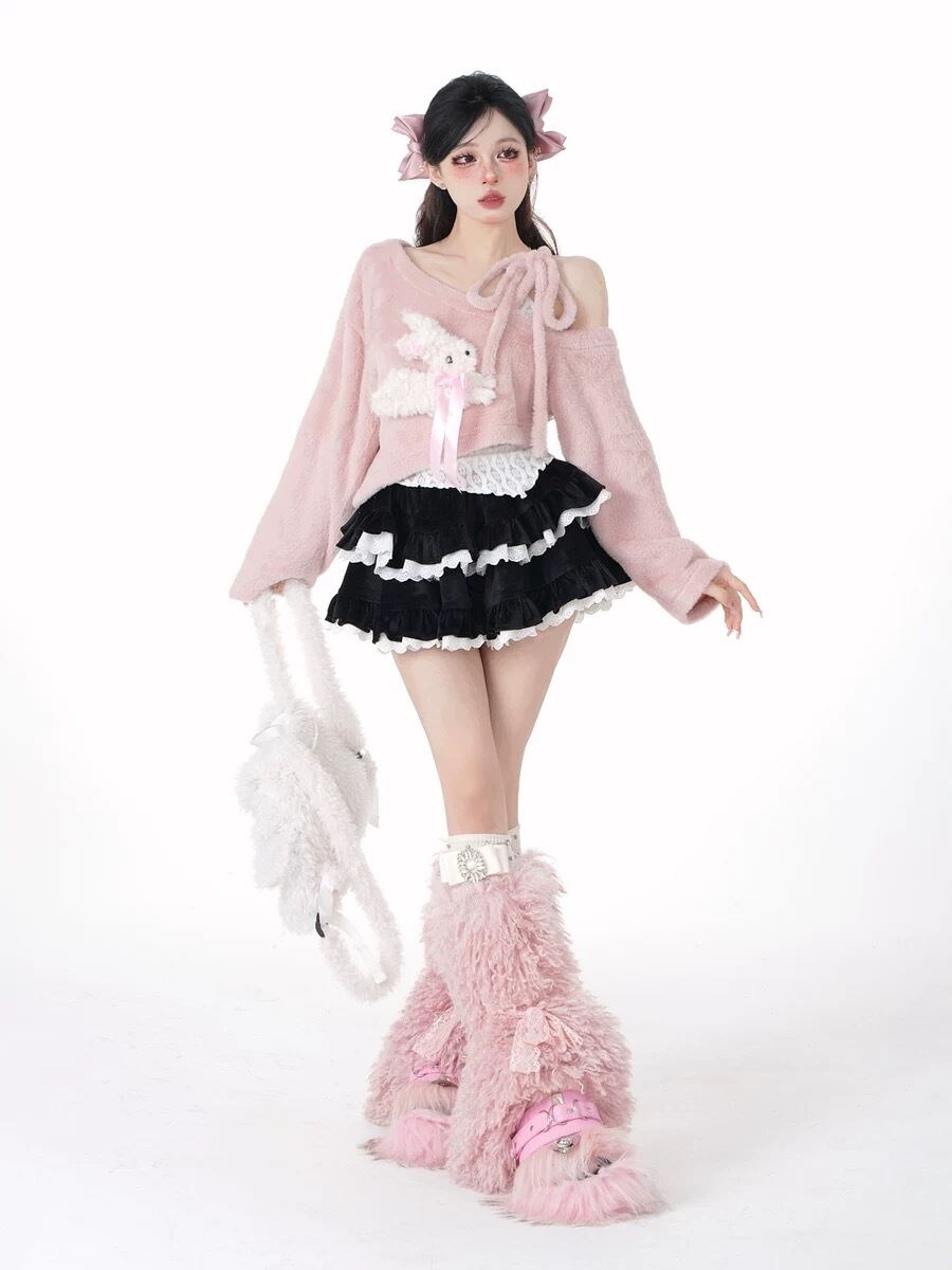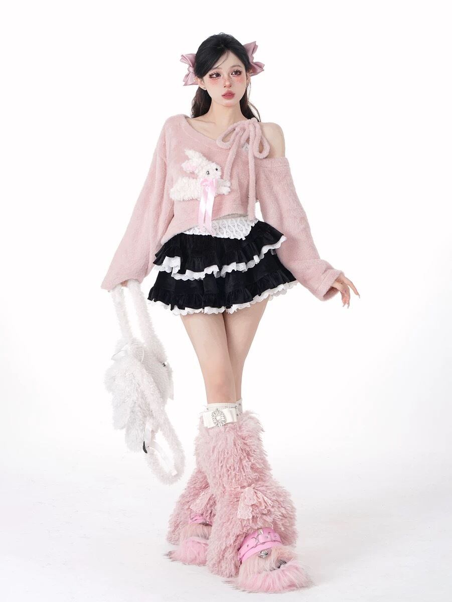 【トップスセット】オフショルダー リボン うさぎ ピンク スウェット セーター