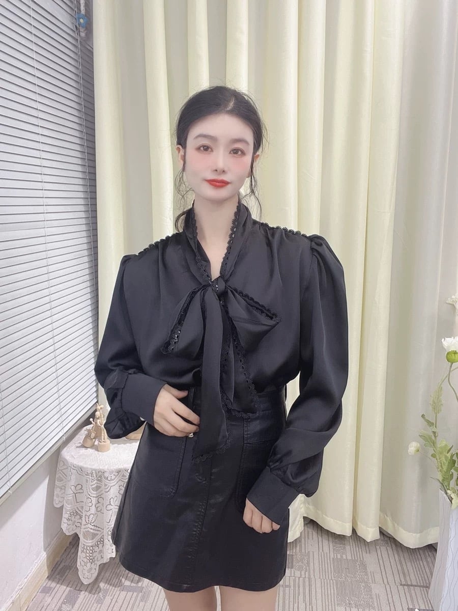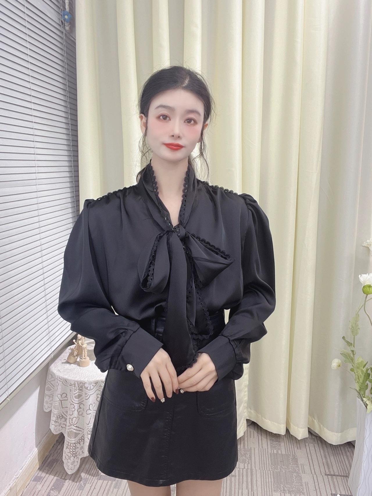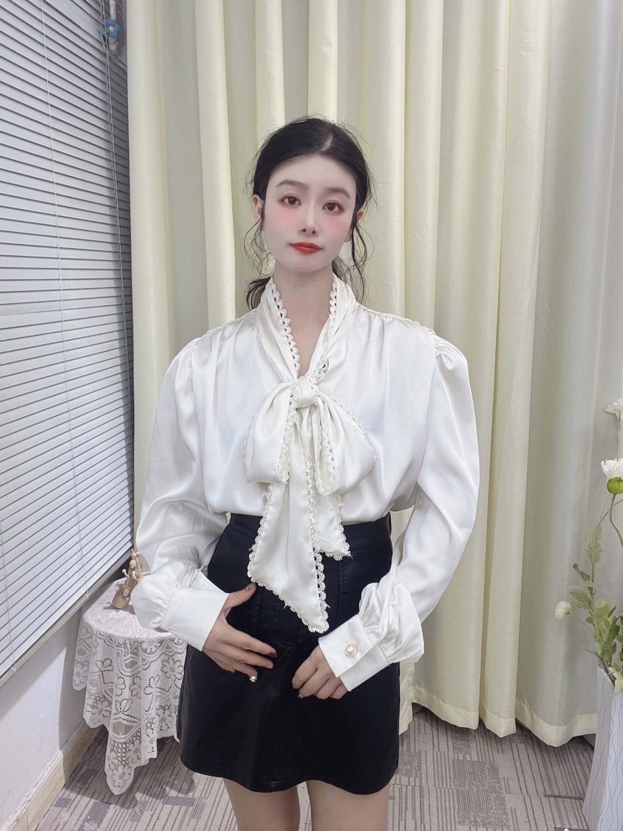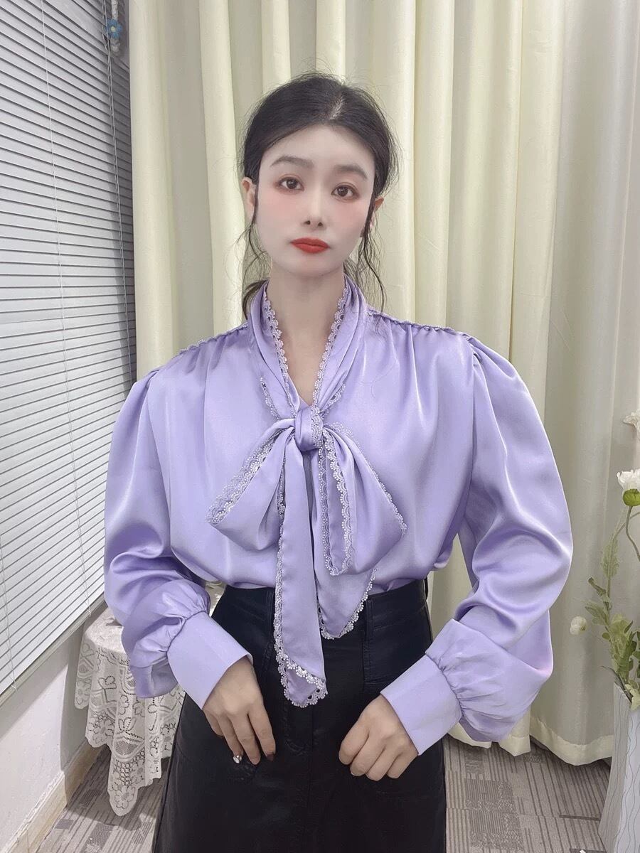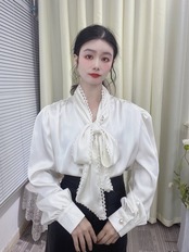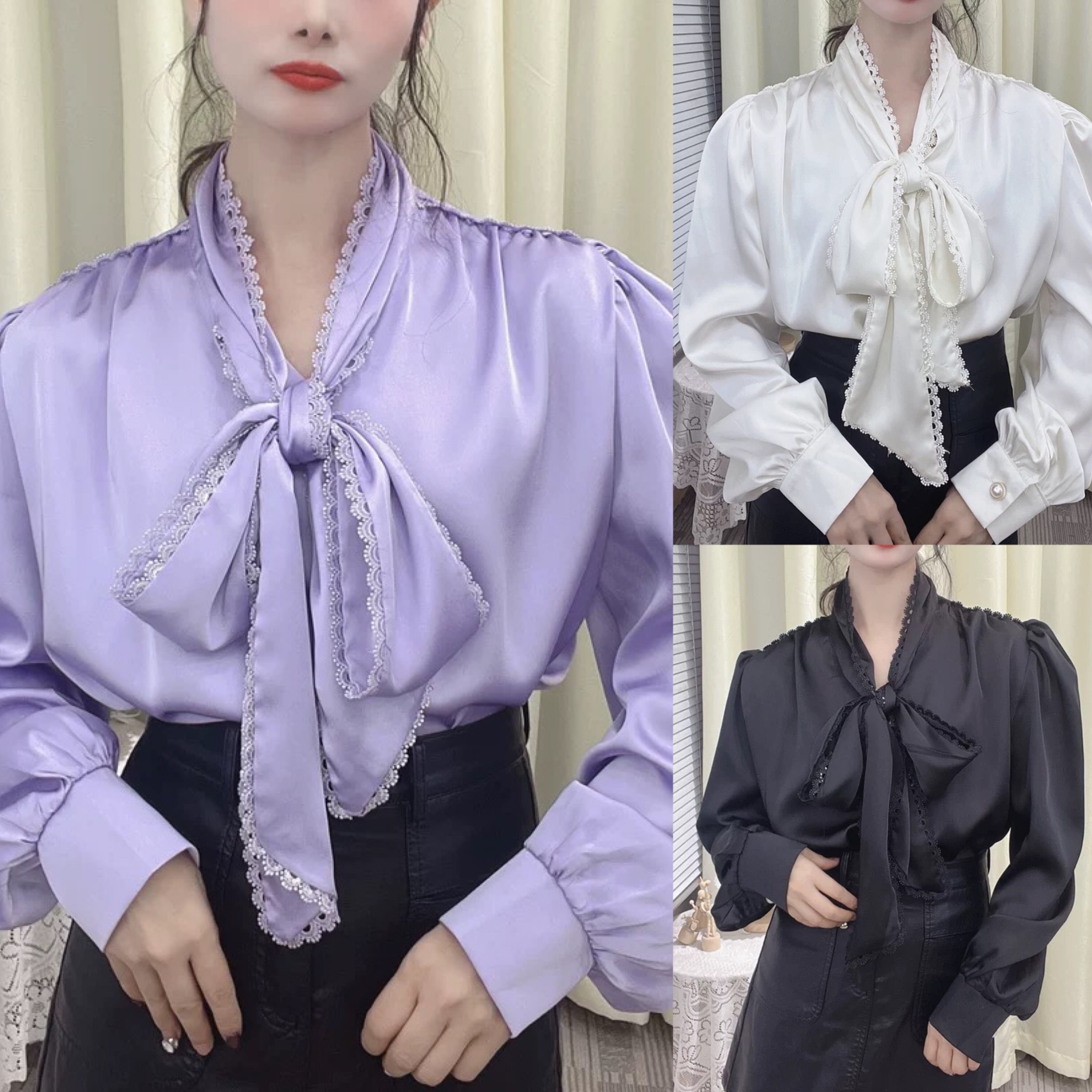 ブラウス 白 ホワイト シンプル 黒 リボン 紫