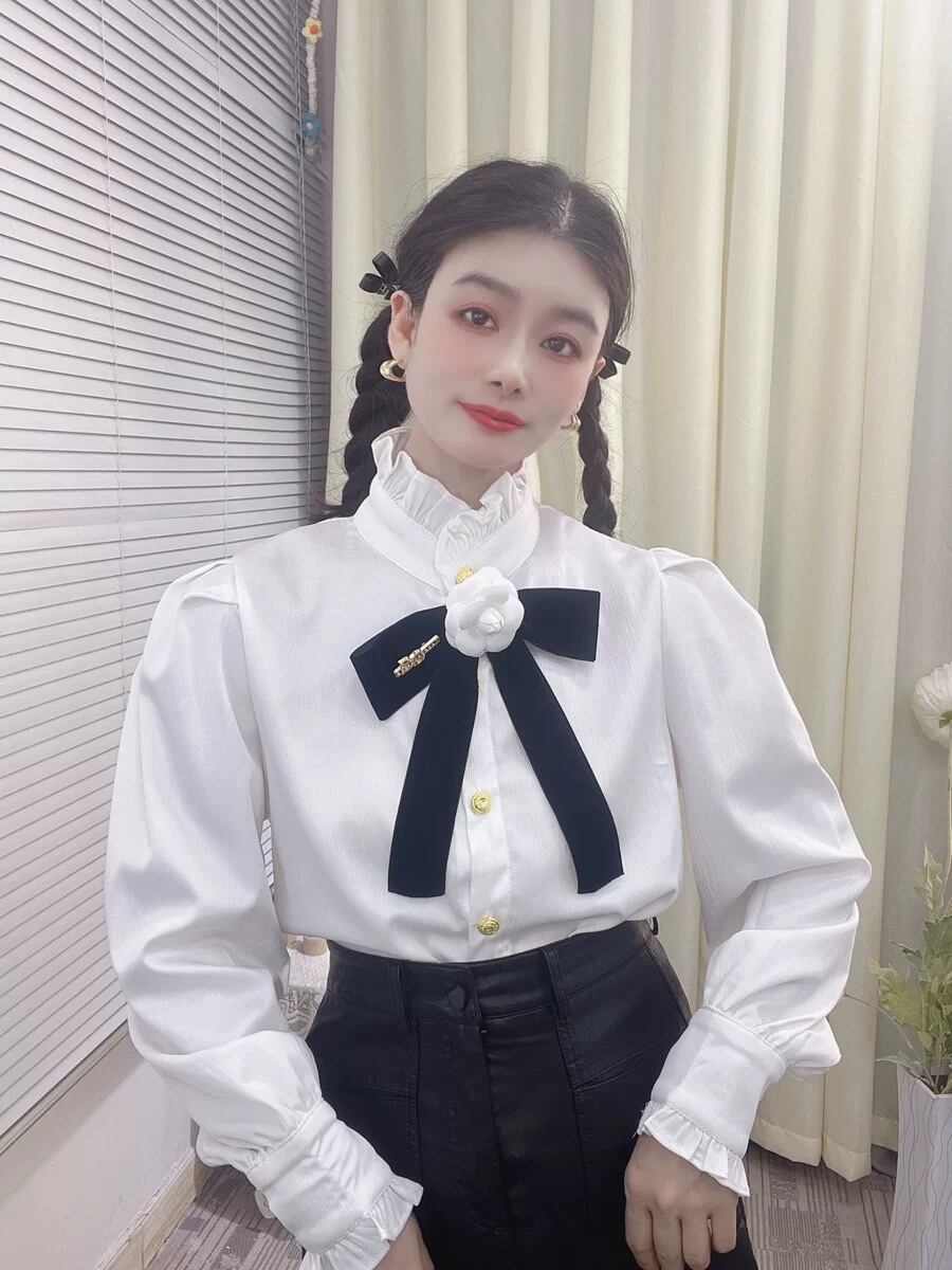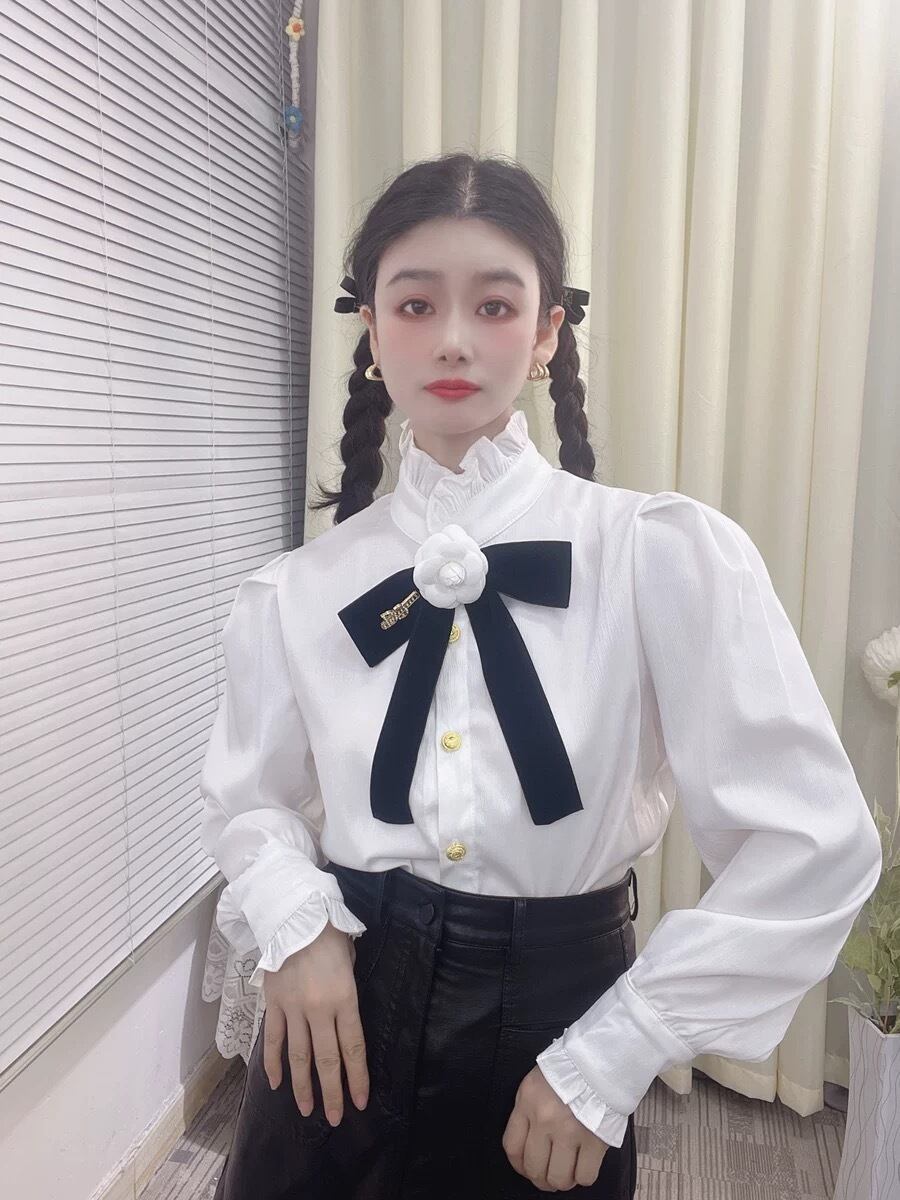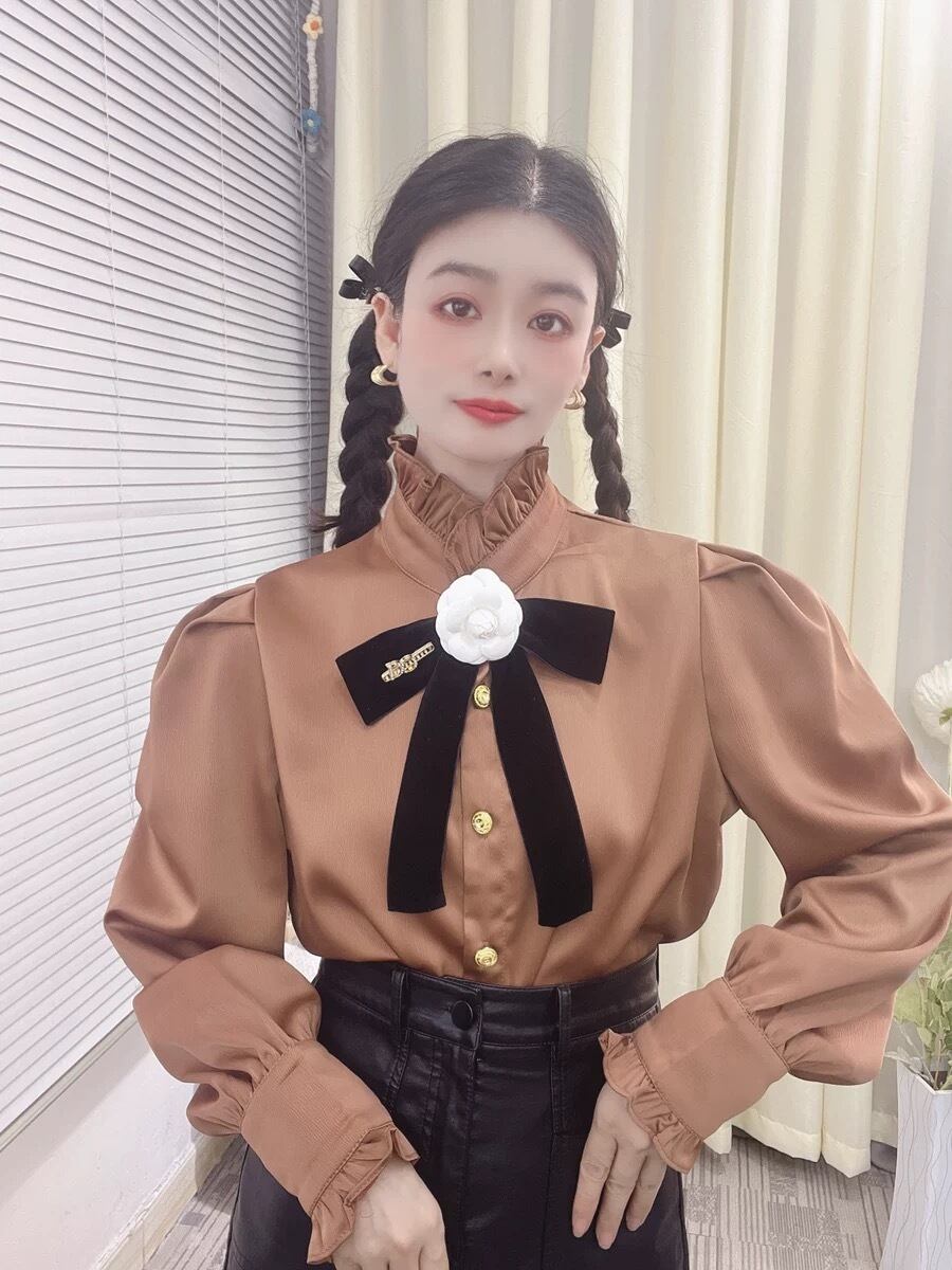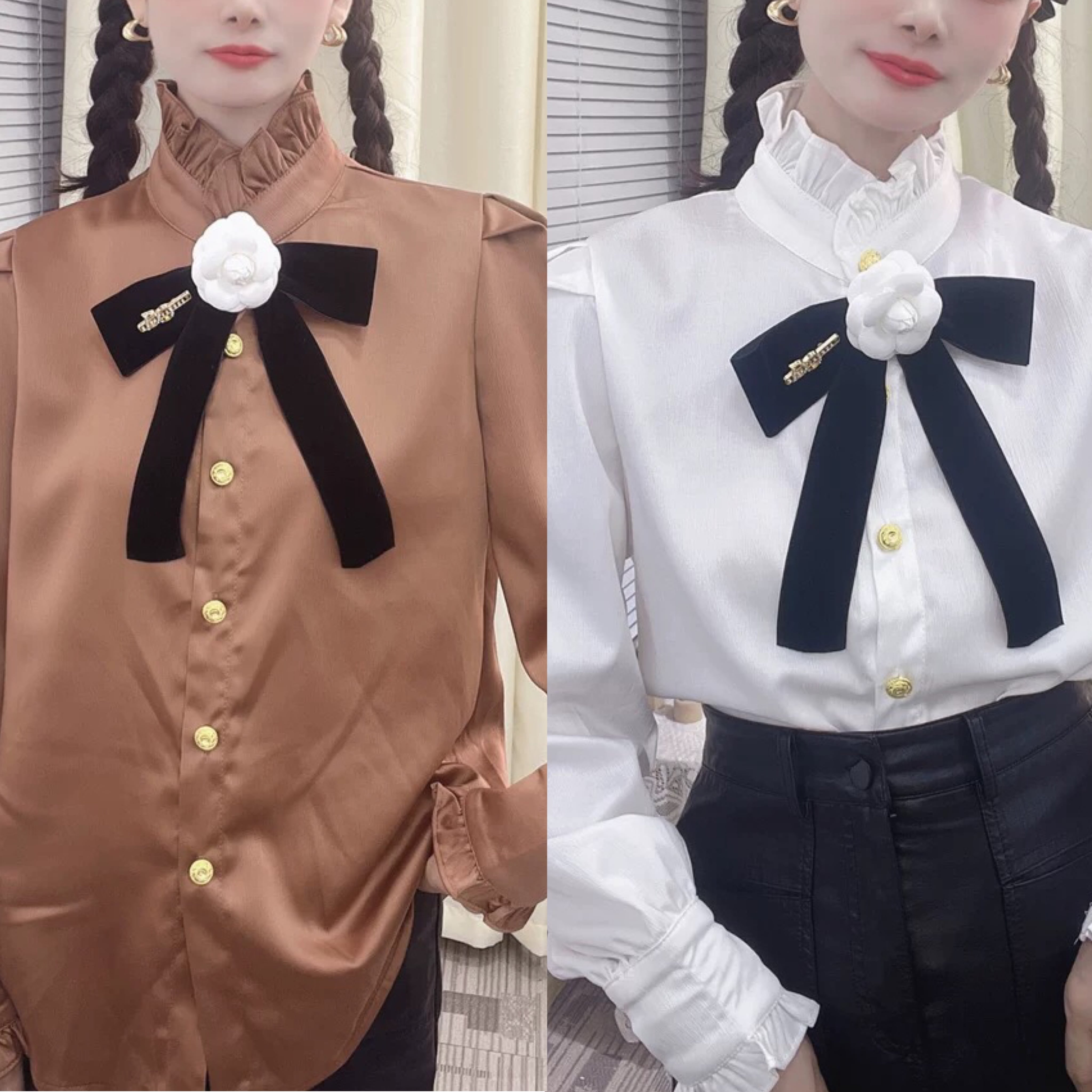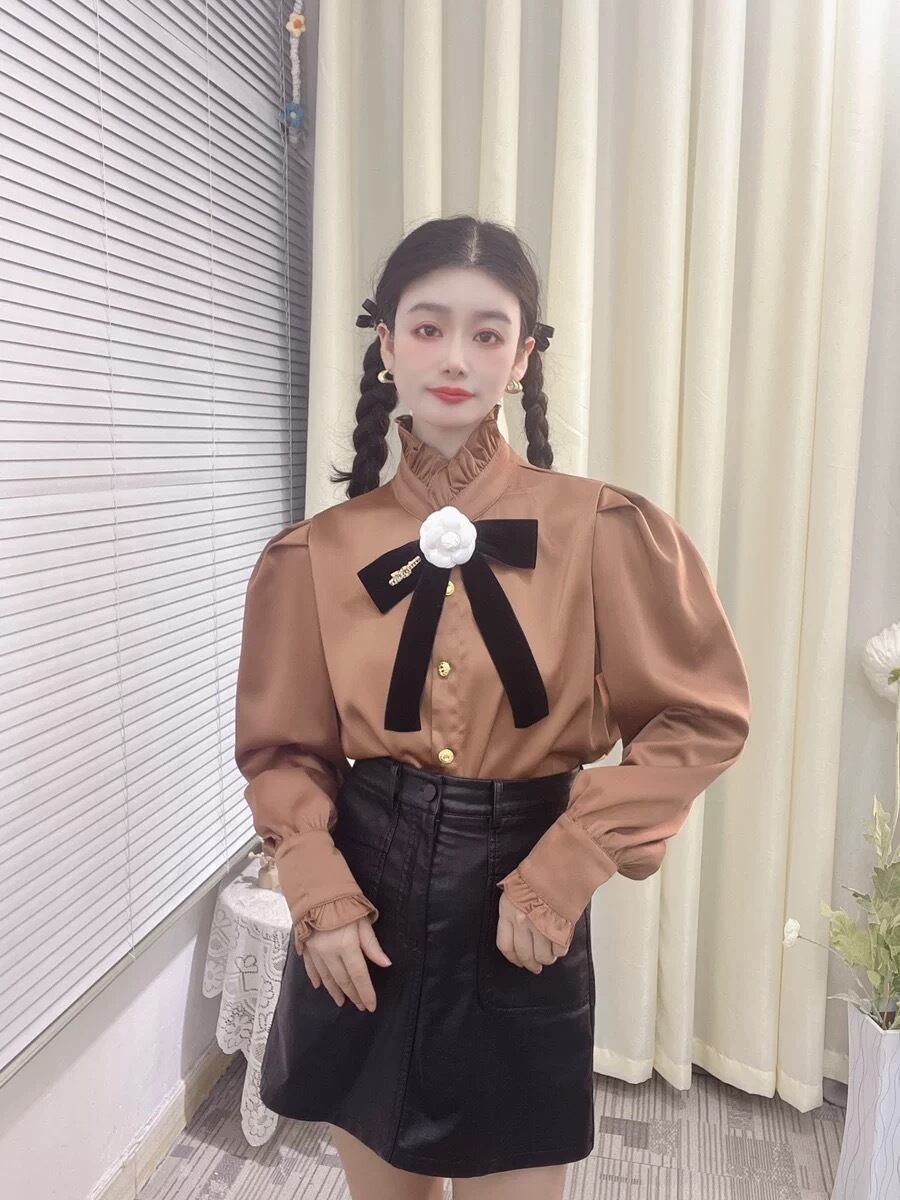 ブラウス カメリア リボン 茶色 白 ガーリー トップス
