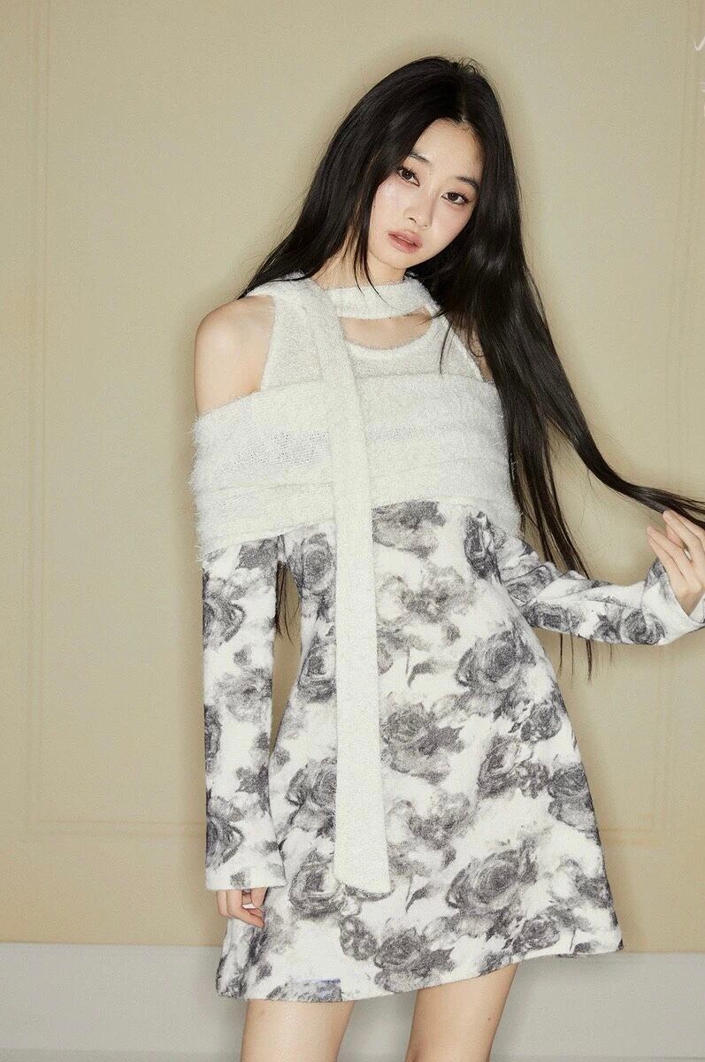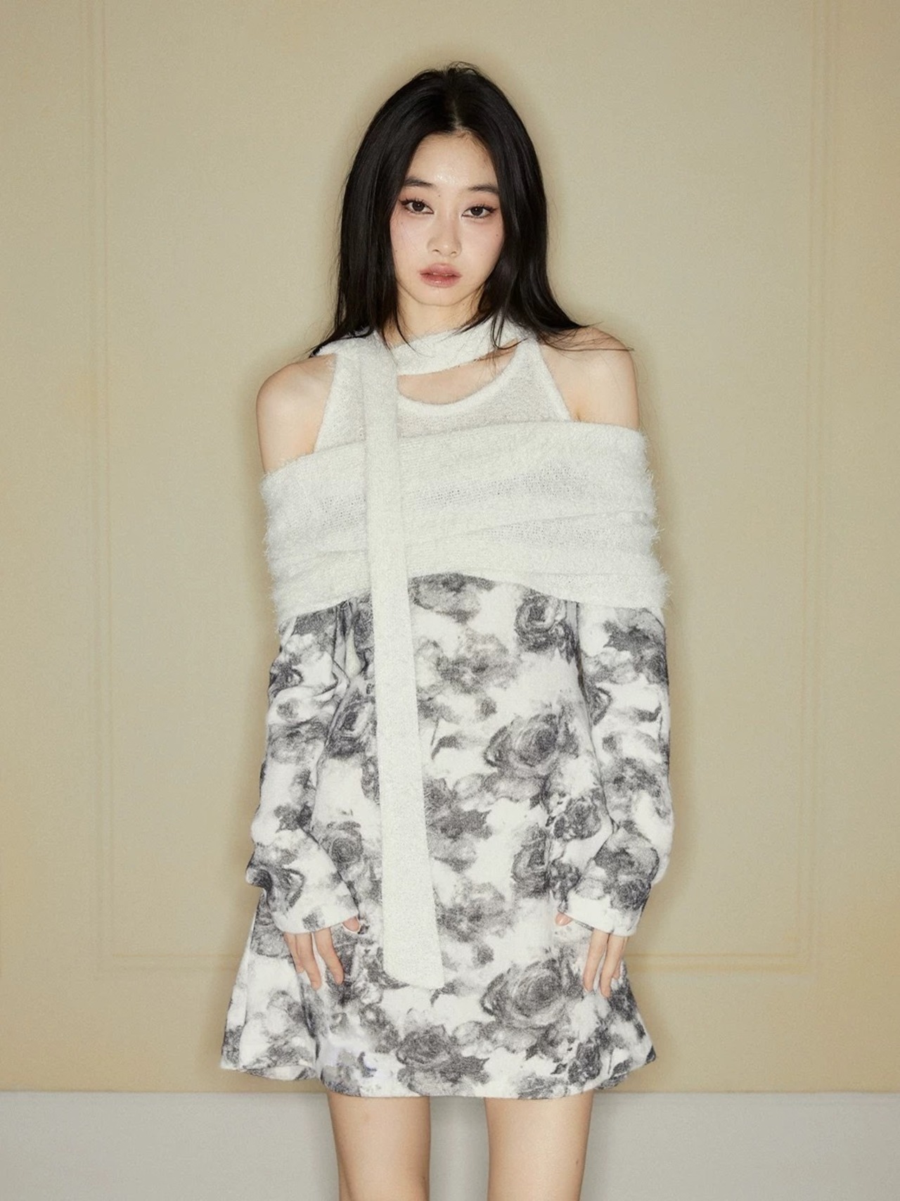 オフショルダー ワンピース 花柄 グレー 白 セーター