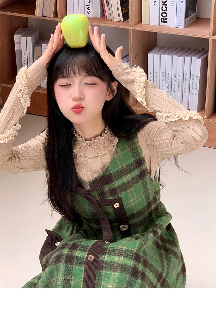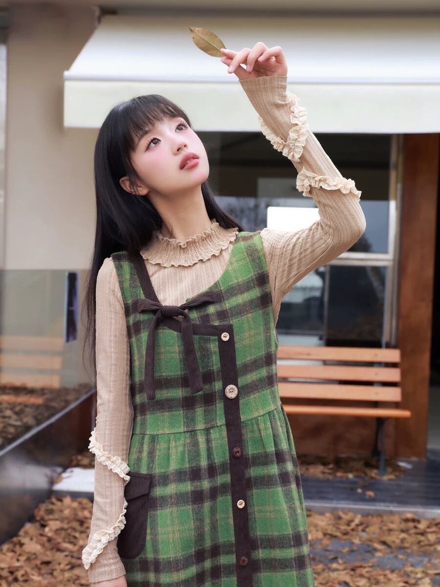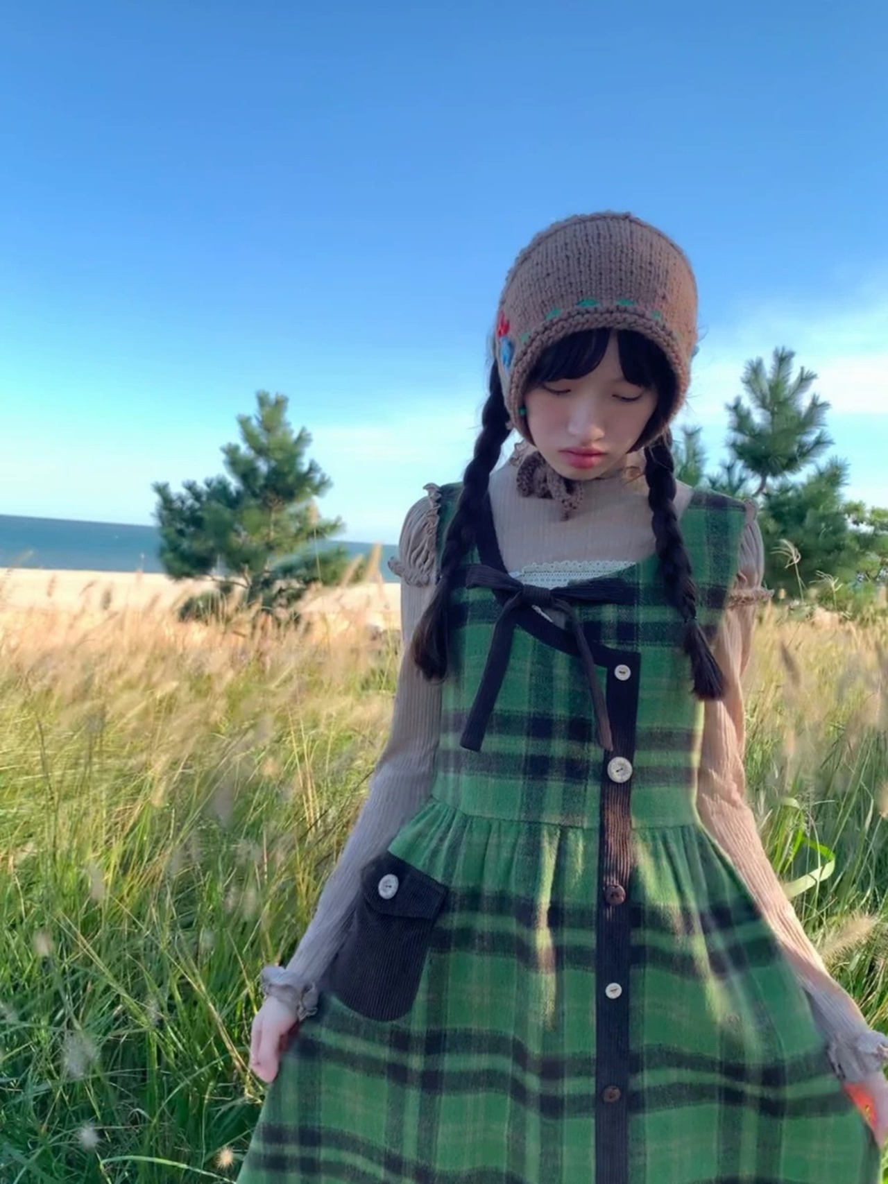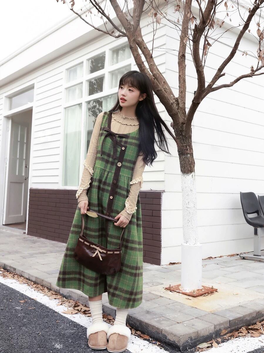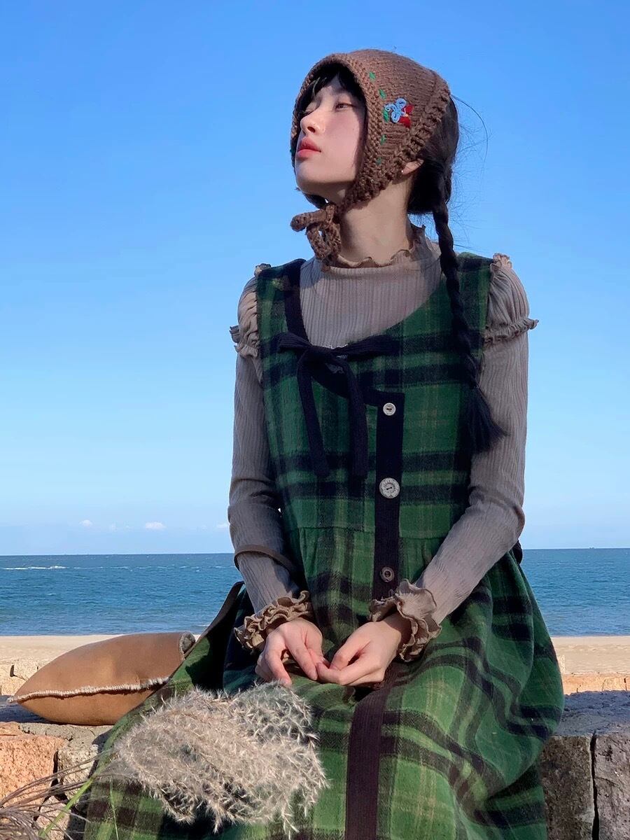 チェック 緑 グリーン ワンピース ガーリー 茶色