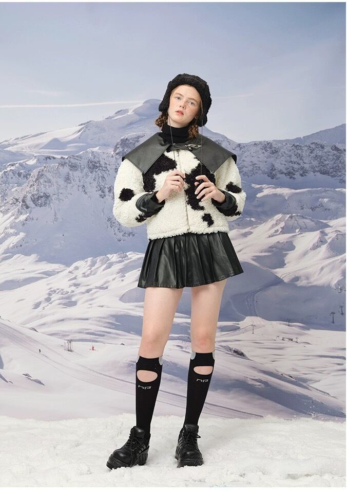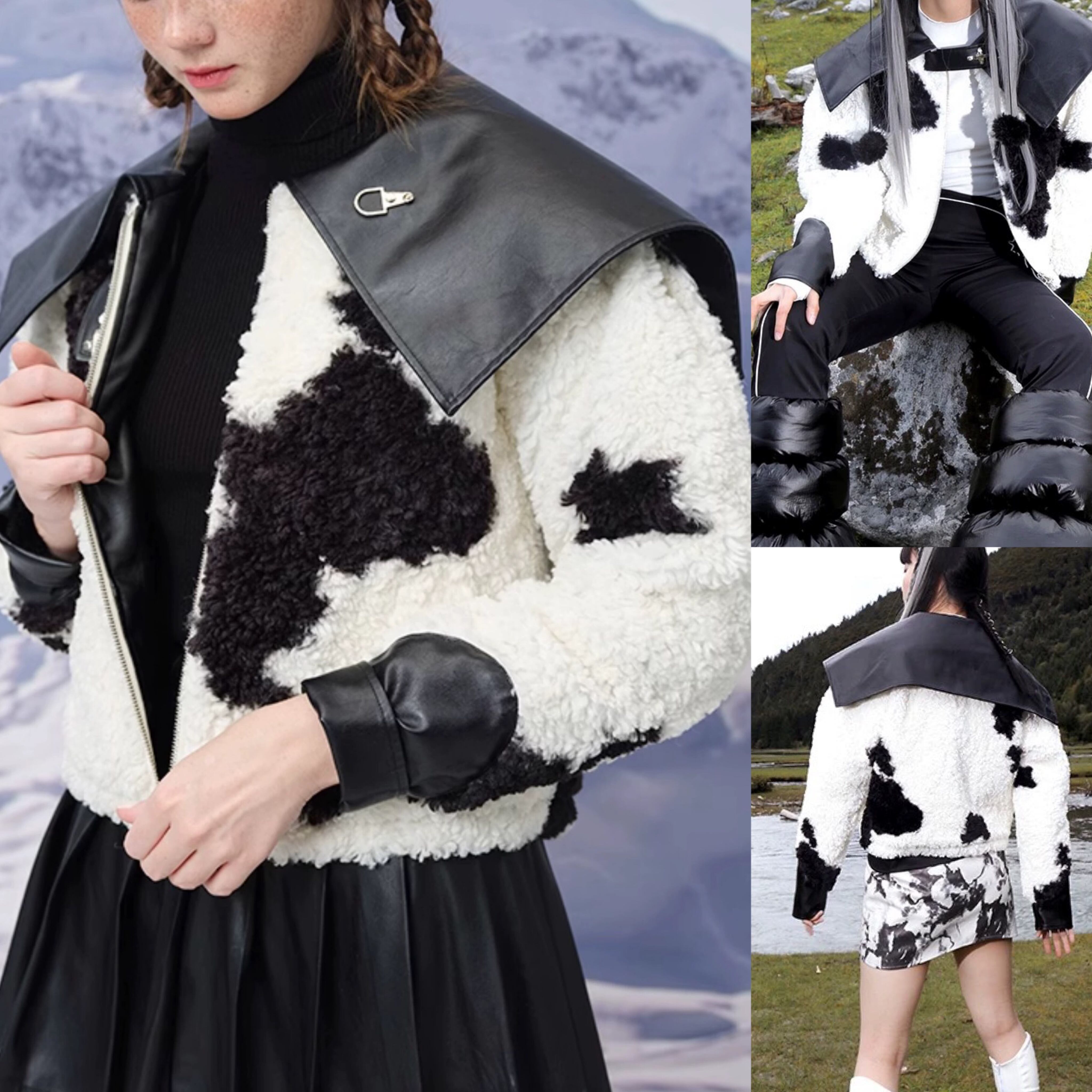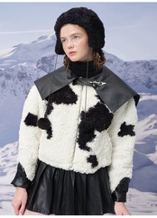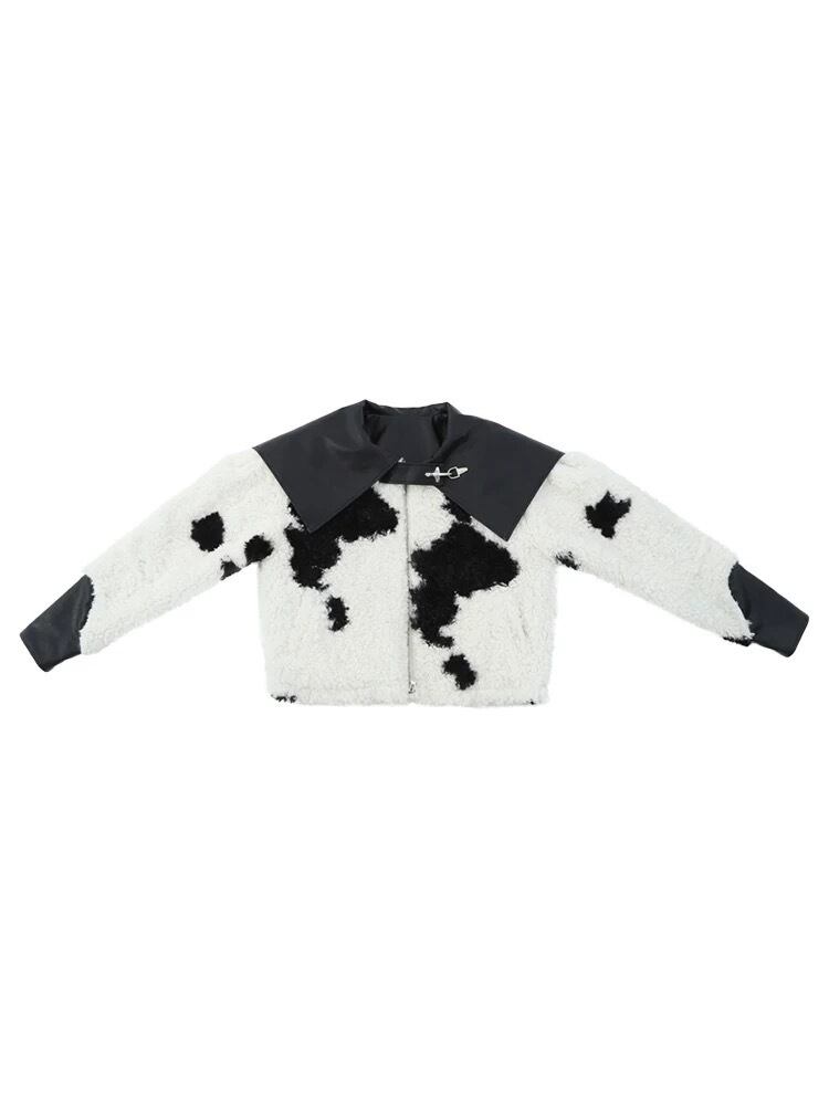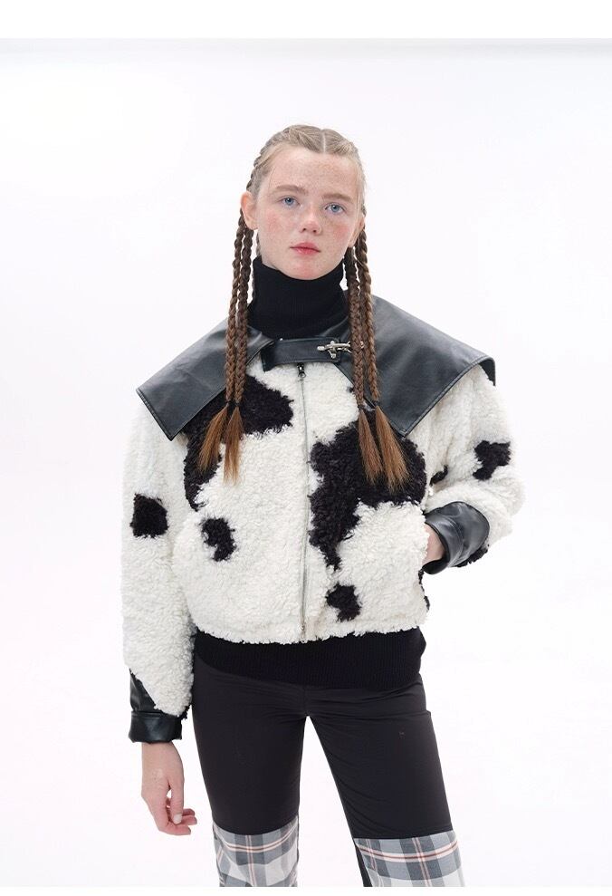 黒 白 アウター 襟 レザー コート 革 牛 アニマル カジュアル