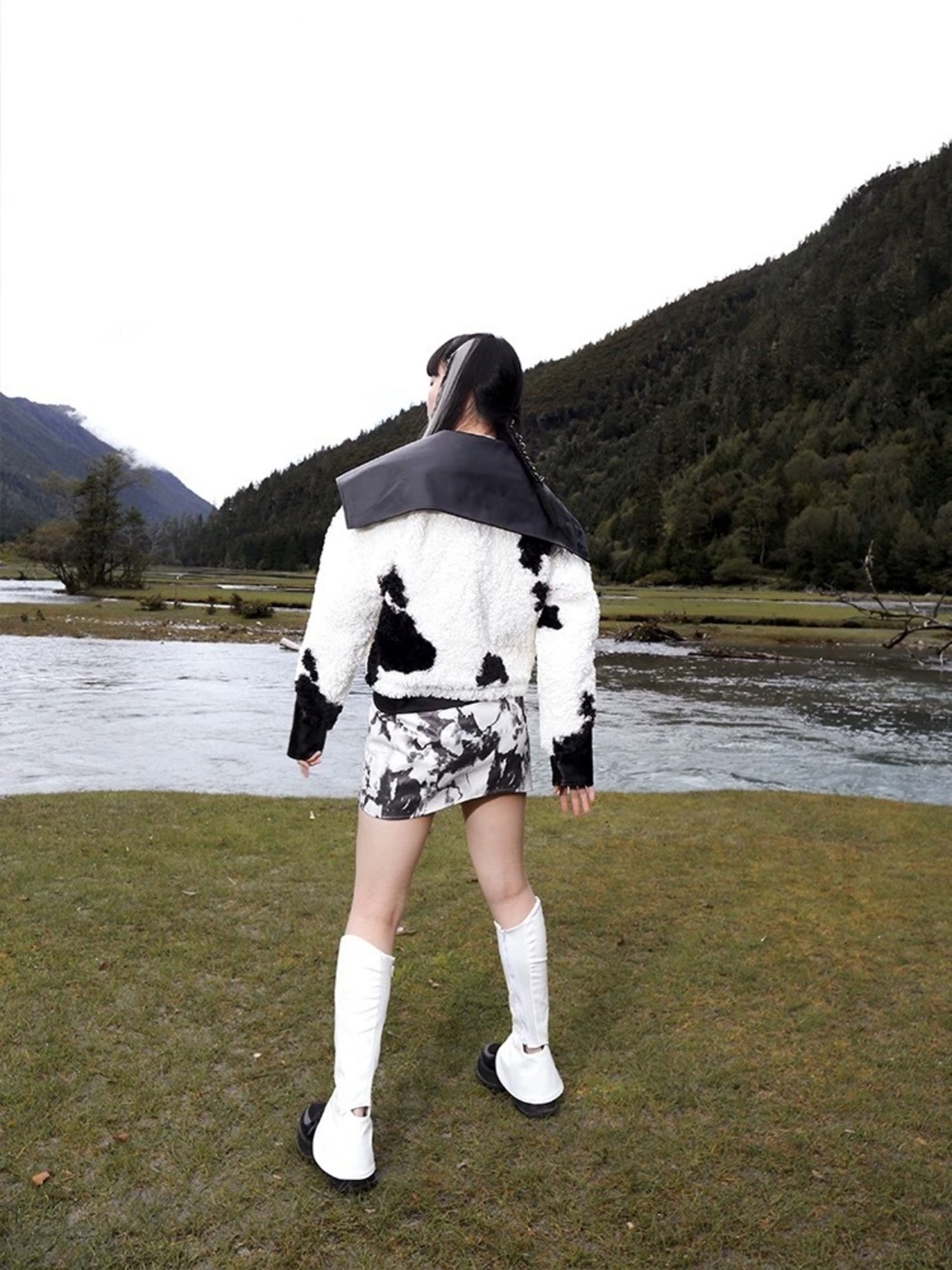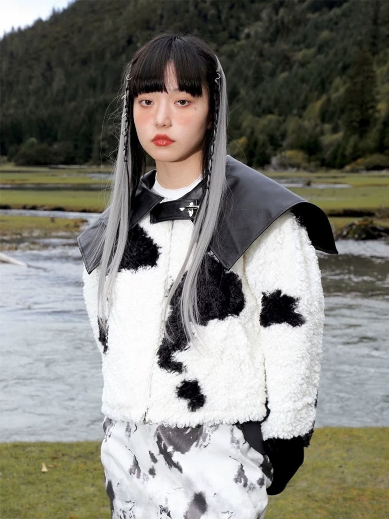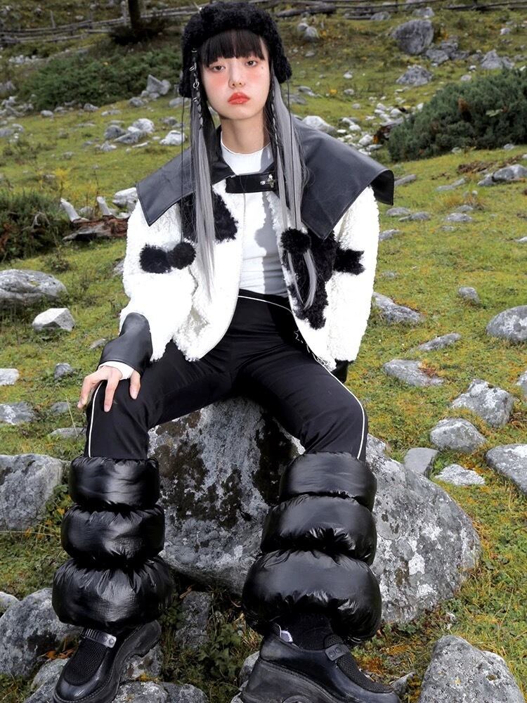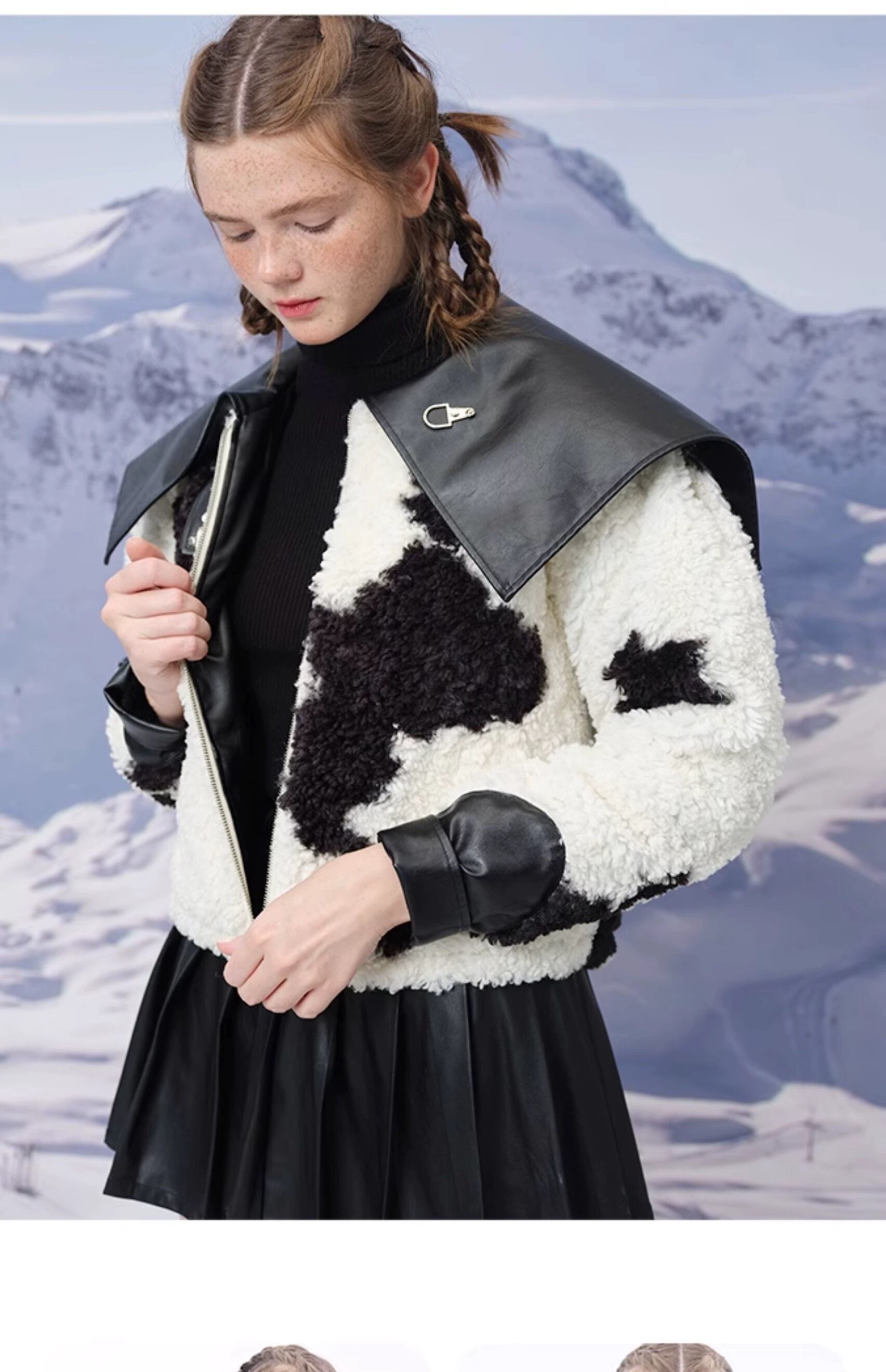 黒 白 アウター 襟 レザー コート 革 牛 アニマル カジュアル